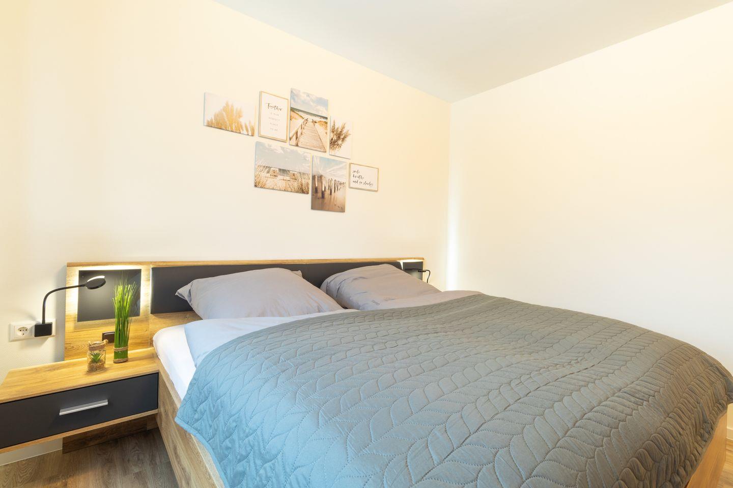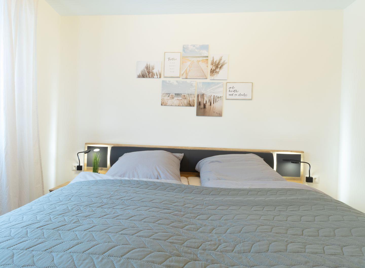 Das Schlafzimmer liegt getrennt vom Wohnraum. Ein bequemes Doppelbett sorgt für ruhige Nächte und die Plissees verdunkeln den Raum. Hier schläfst du ruhig und startest erholt in den nächsten Tag am Meer.