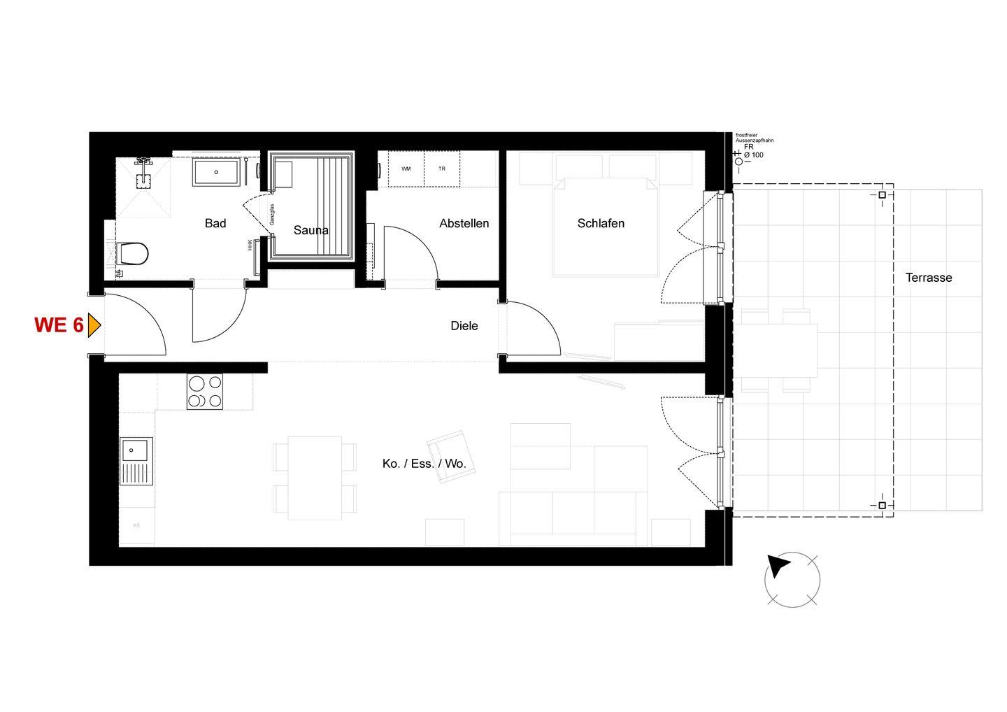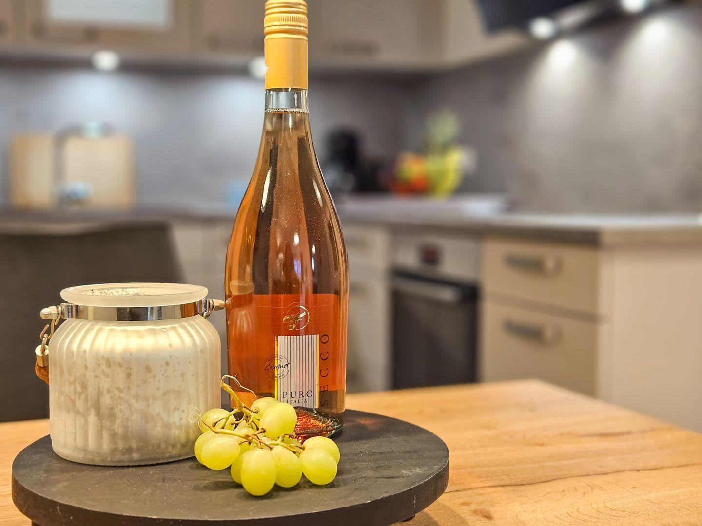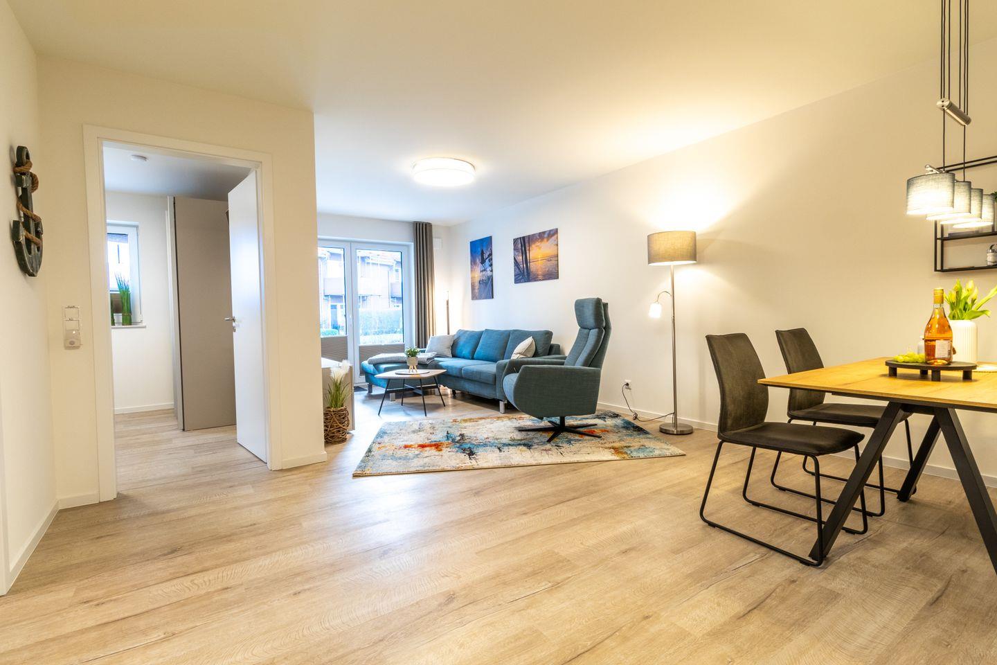 Das helle Wohnzimmer ist modern eingerichtet und lädt mit Sofa, Flachbild-TV und WLAN zum Entspannen ein. Große Fenster sorgen für freundliche Atmosphäre, und von hier gelangst du direkt auf die möblierte Terrasse – ideal für den ersten Kaffee am Morgen oder einen gemütlichen Abend in der Abendsonne. Die offene Küche ist voll ausgestattet, sodass du deine Lieblingsgerichte auch im Urlaub zubereiten kannst.
