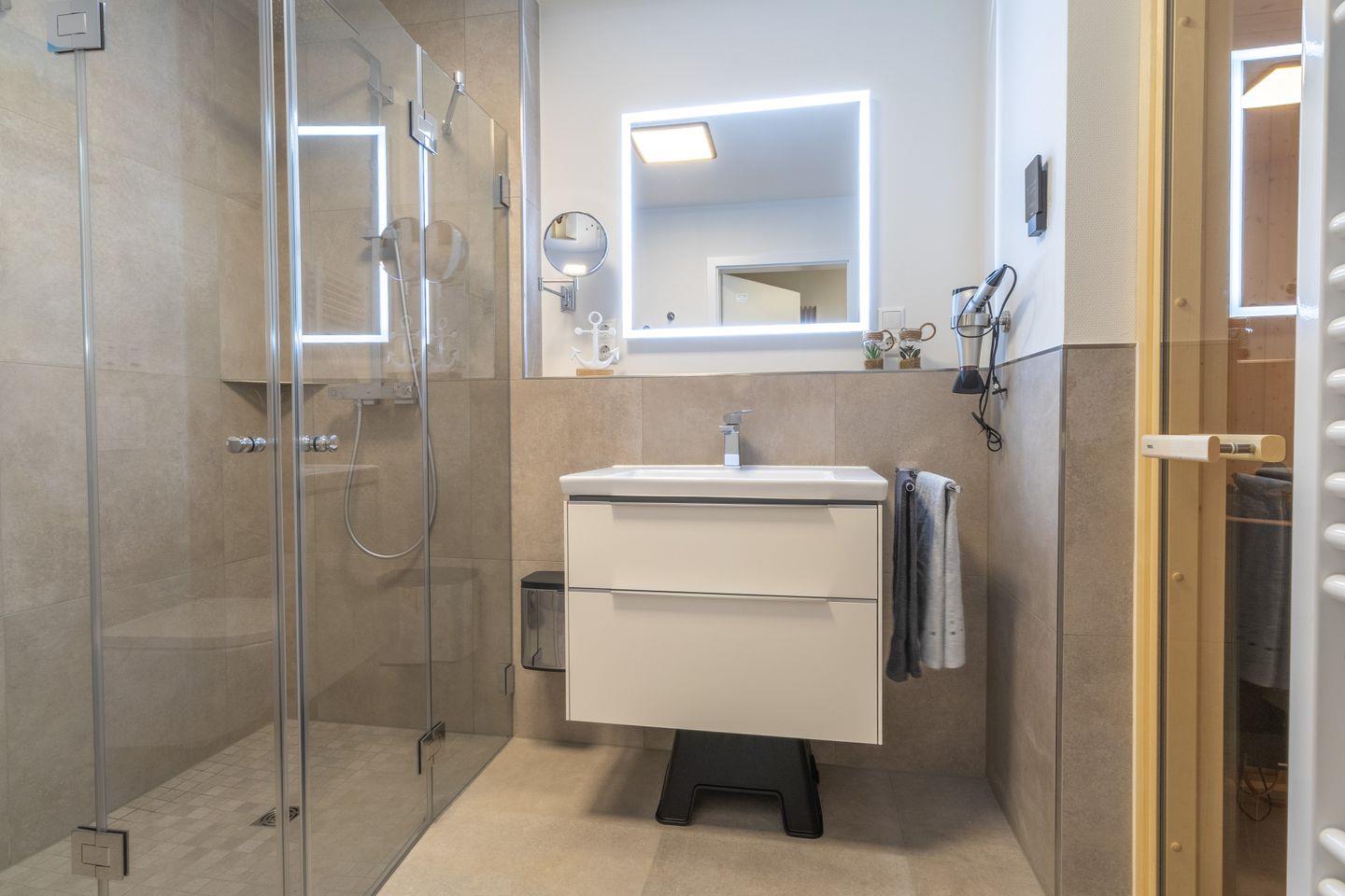 Das moderne Tageslichtbad bietet eine große Dusche, Waschbecken, Spiegel und WC. Das Highlight ist die private Sauna – perfekt, um nach einem langen Strandspaziergang zu entspannen und den Tag wohlig ausklingen zu lassen.
