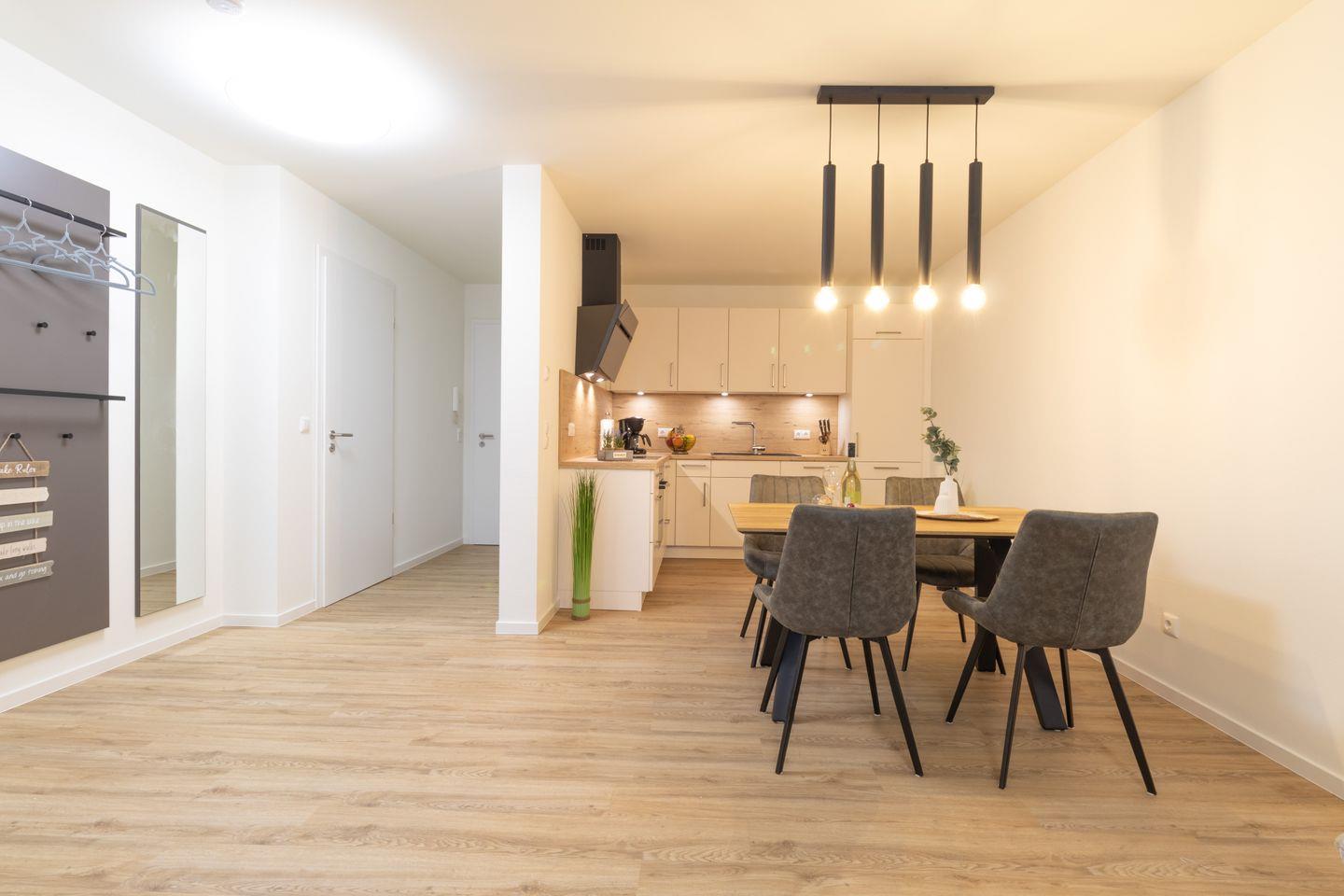 Ein Aufzug im Haus bringt dich bequem in die erste Etage. Der zur Wohnung gehörige Parkplatz liegt direkt am Haus, ein abschließbarer Fahrradraum ist ebenfalls vorhanden. Der Check-in erfolgt kontaktlos über einen Schlüsseltresor.
