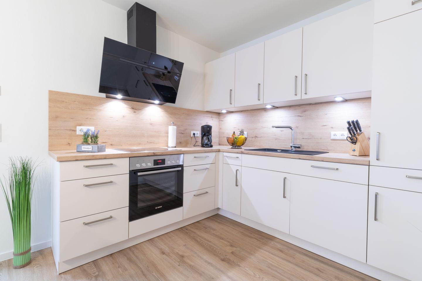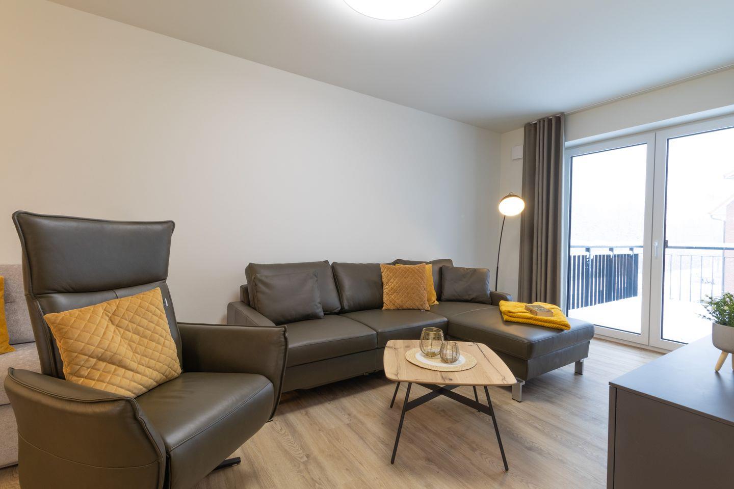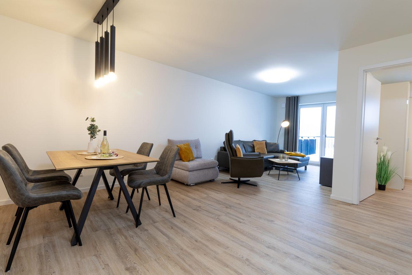 Der offene Wohnbereich ist lichtdurchflutet und stilvoll eingerichtet. Ein großes Ledersofa mit Schlaffunktion und ein Relaxsessel mit Leselicht bieten viel Komfort. Die moderne Küche mit gemütlichem Essbereich ist vollständig ausgestattet und lädt zu genussvollen Kochmomenten ein. Der angrenzende Balkon erweitert den Wohnraum ins Freie – ideal zum Frühstücken in der Sonne oder für einen entspannten Abend mit einem Glas Wein.