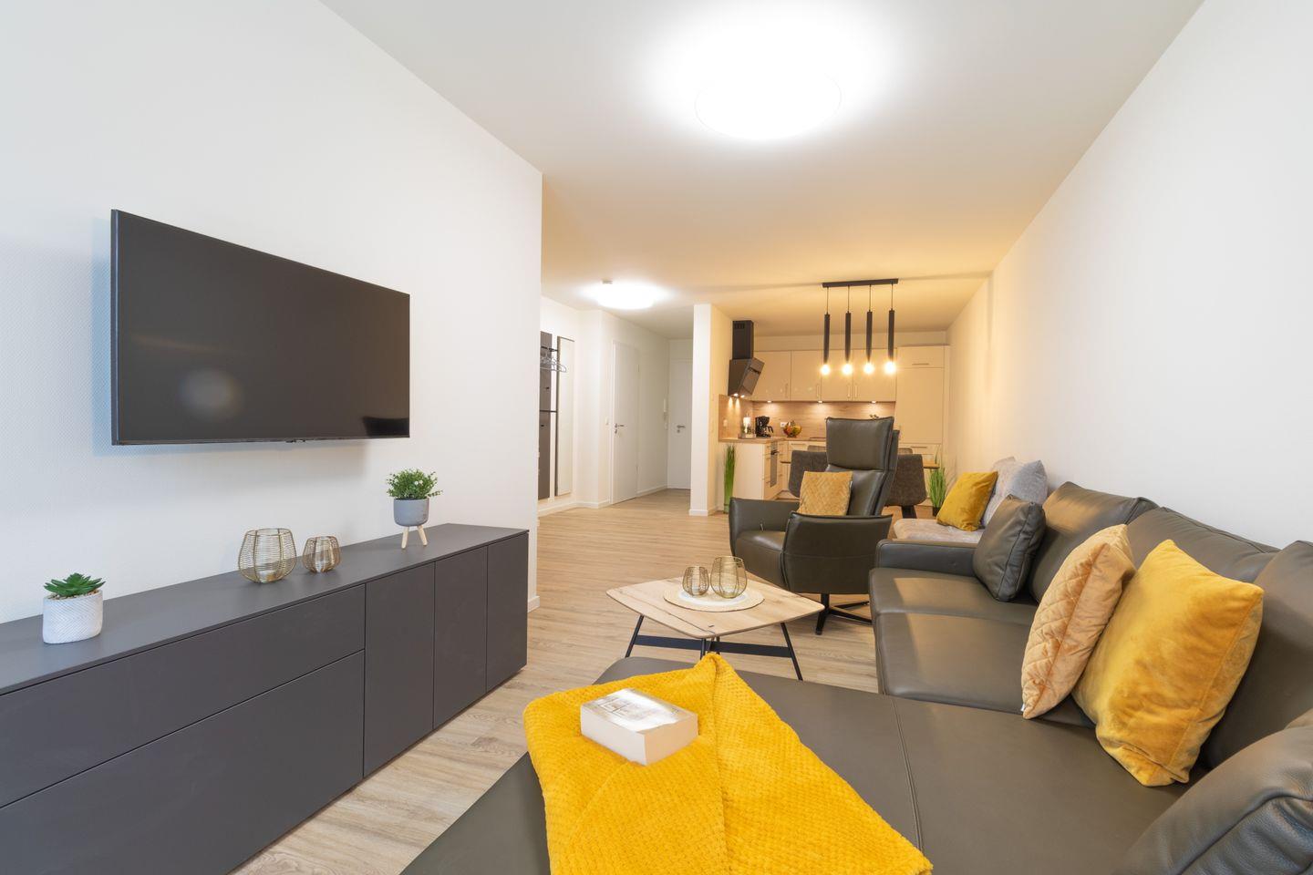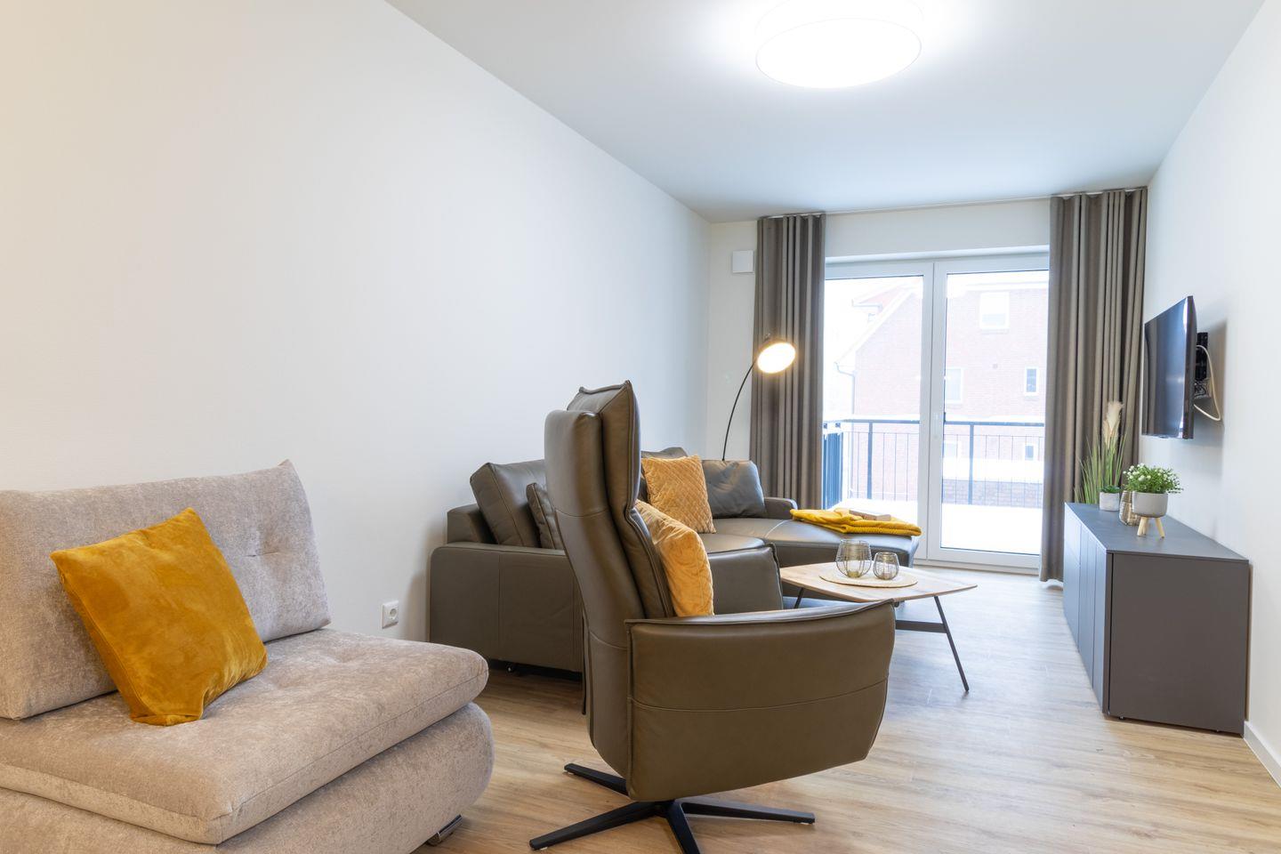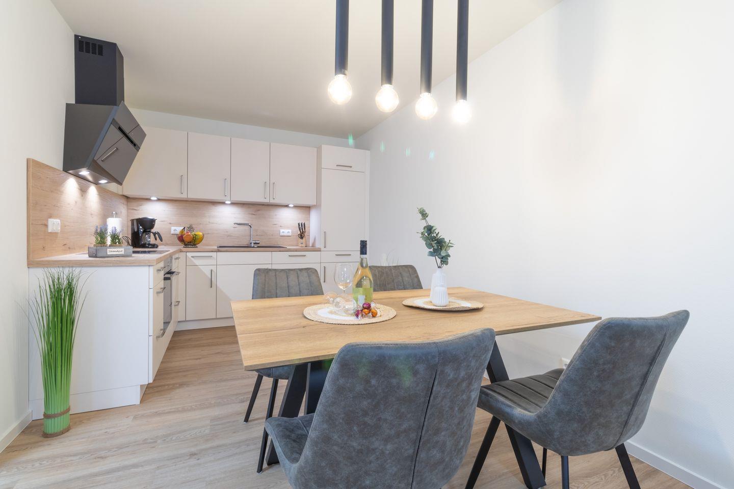 Der offene Wohnbereich ist lichtdurchflutet und stilvoll eingerichtet. Ein großes Ledersofa mit Schlaffunktion und ein Relaxsessel mit Leselicht bieten viel Komfort. Die moderne Küche mit gemütlichem Essbereich ist vollständig ausgestattet und lädt zu genussvollen Kochmomenten ein. Der angrenzende Balkon erweitert den Wohnraum ins Freie – ideal zum Frühstücken in der Sonne oder für einen entspannten Abend mit einem Glas Wein.