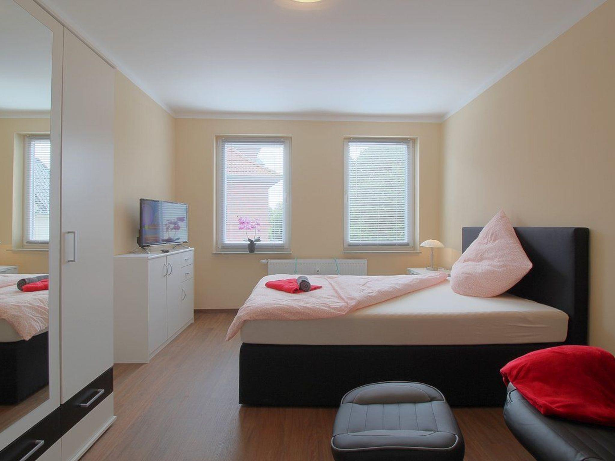 Modern eingerichtetes Einzelzimmer mit Boxspringbett und TV, gemeinschaftlicher Küche und Bad in Dorum.