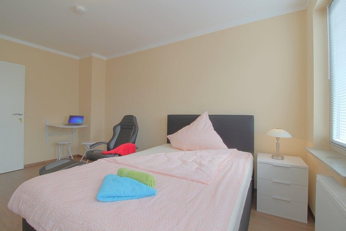 Modern eingerichtetes Einzelzimmer mit Boxspringbett und Gemeinschaftsküche in Dorum für erholsamen Aufenthalt.