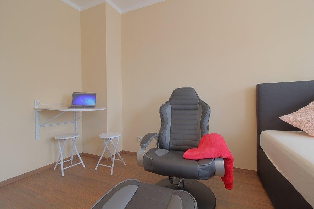 Modern eingerichtetes Einzelzimmer mit einem gemütlichen Boxspringbett, Fernsehsessel, großem Flachbild TV, gemeinsame Küchen- und Badezimmernutzung. Vinylbodenbeläge in allen Räume, daher für Allergiker geeignet. Es fehlt an nichts, hier können Sie nach einem anstrengendem Arbeitstasg Ihren Feierabend genießen.