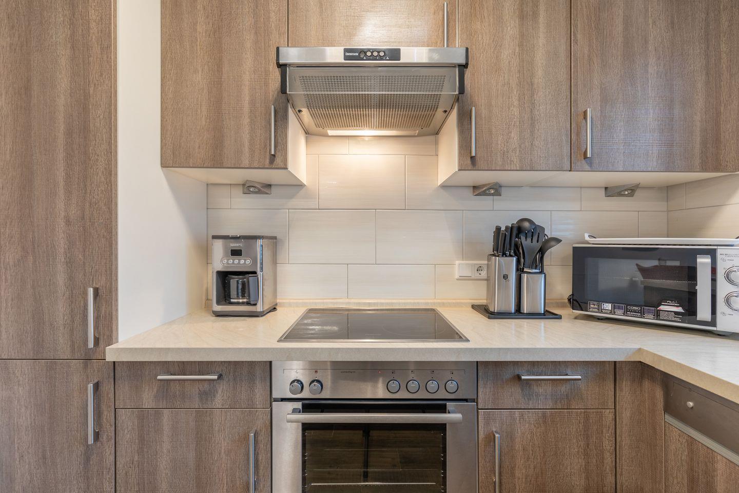 Die Ferienwohnung ist geschmackvoll eingerichtet und bietet mit zwei Schlafzimmern (1 Doppelbett 180 x 200 m und 2 Einzelbetten) Platz für bis zu 4 Personen. Die offene Küche verfügt über einen Herd mit Cerankochfeldern, einen Backofen, einen Kühlschrank, Filterkaffeemaschine (Filtergröße 4), Wasserkocher und Toaster.