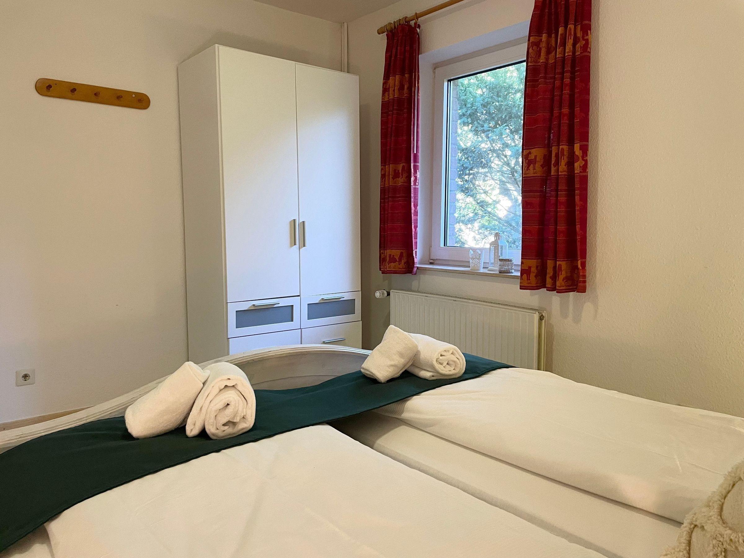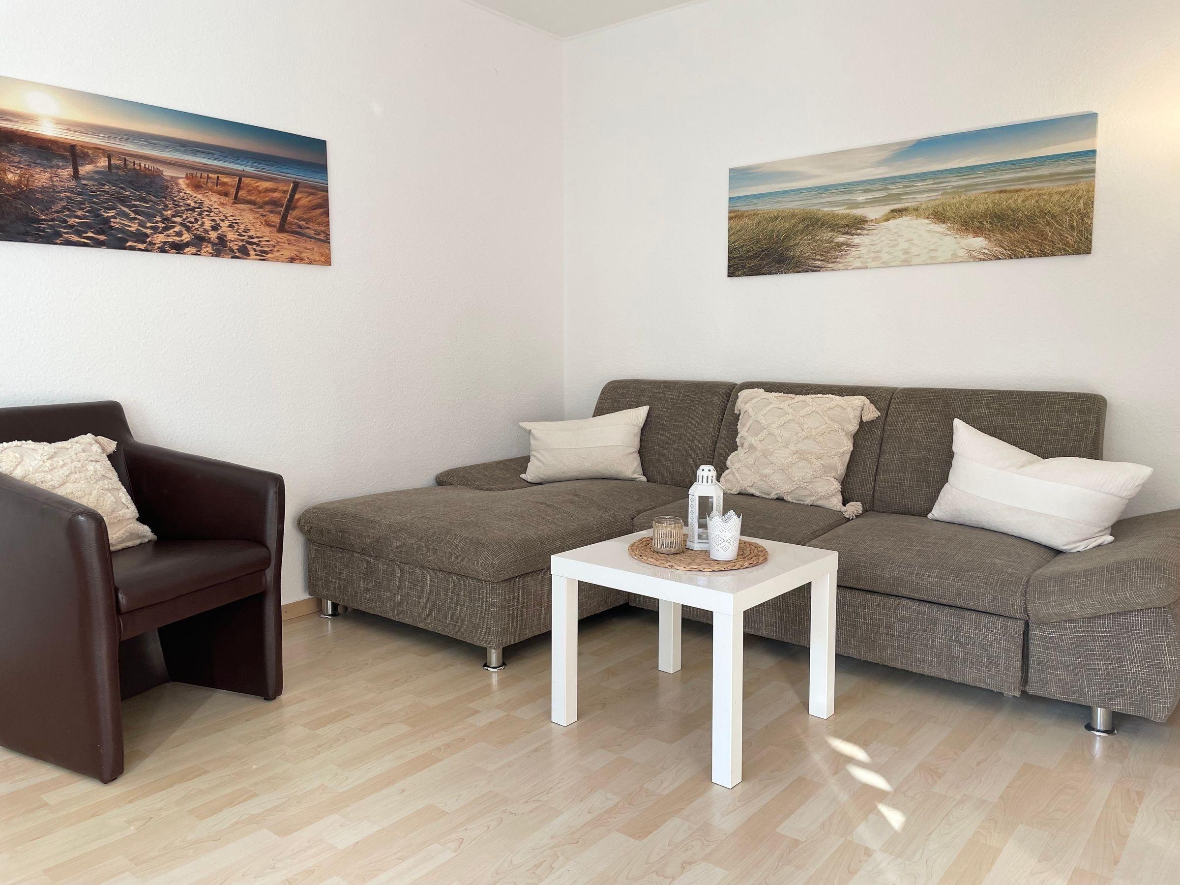 Diese moderne Ferienwohnung bietet eine komfortable und allergikergeeignete Umgebung, ideal für entspannende Aufenthalte. Die Wohnung verfügt über zwei einladende Schlafzimmer, eines mit Doppelbett und das andere mit zwei Einzelbetten. Im Wohnschlafzimmer befindet sich eine gemütliche Schlafcouch, die zusätzlichen Platz bietet.