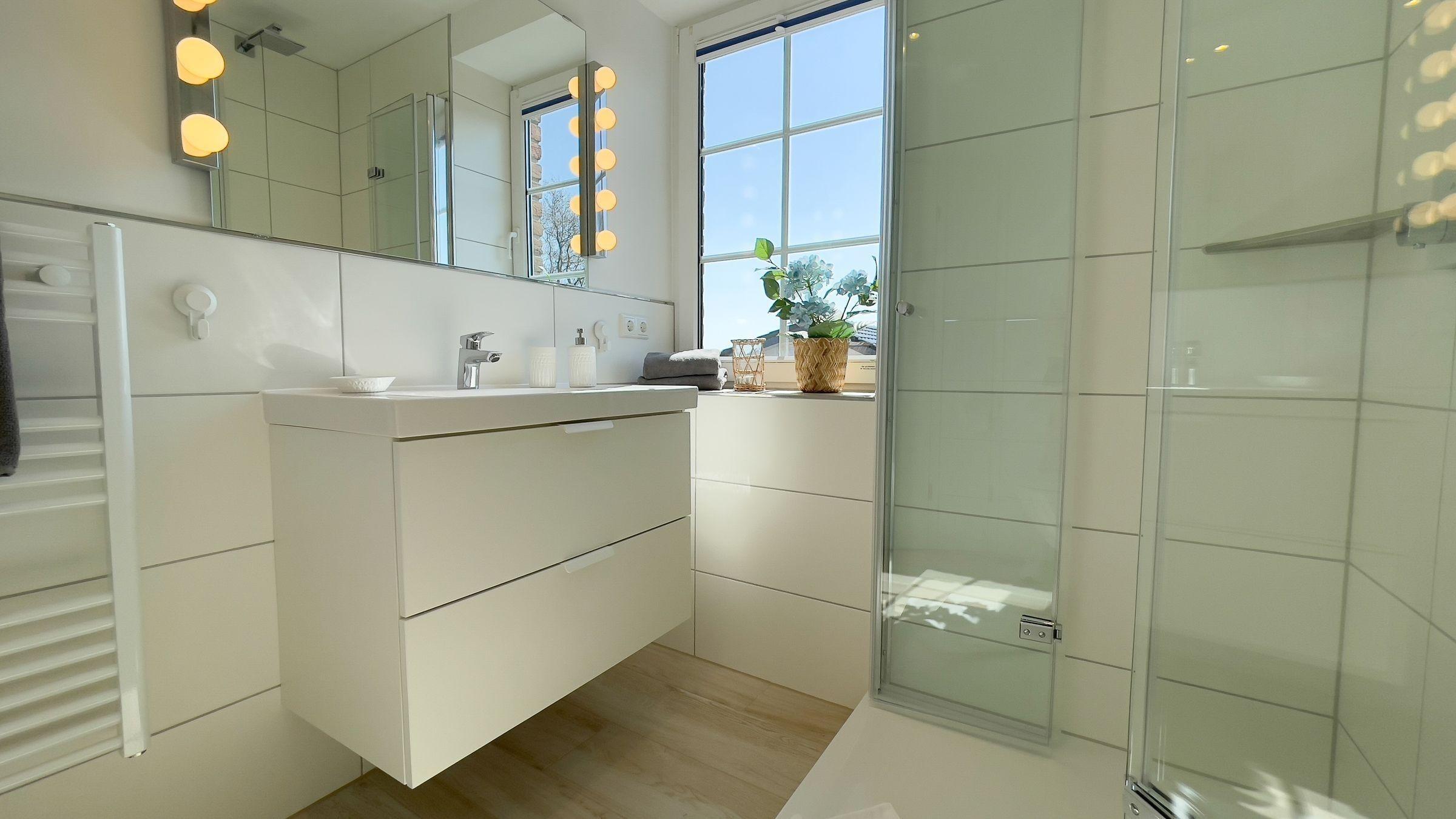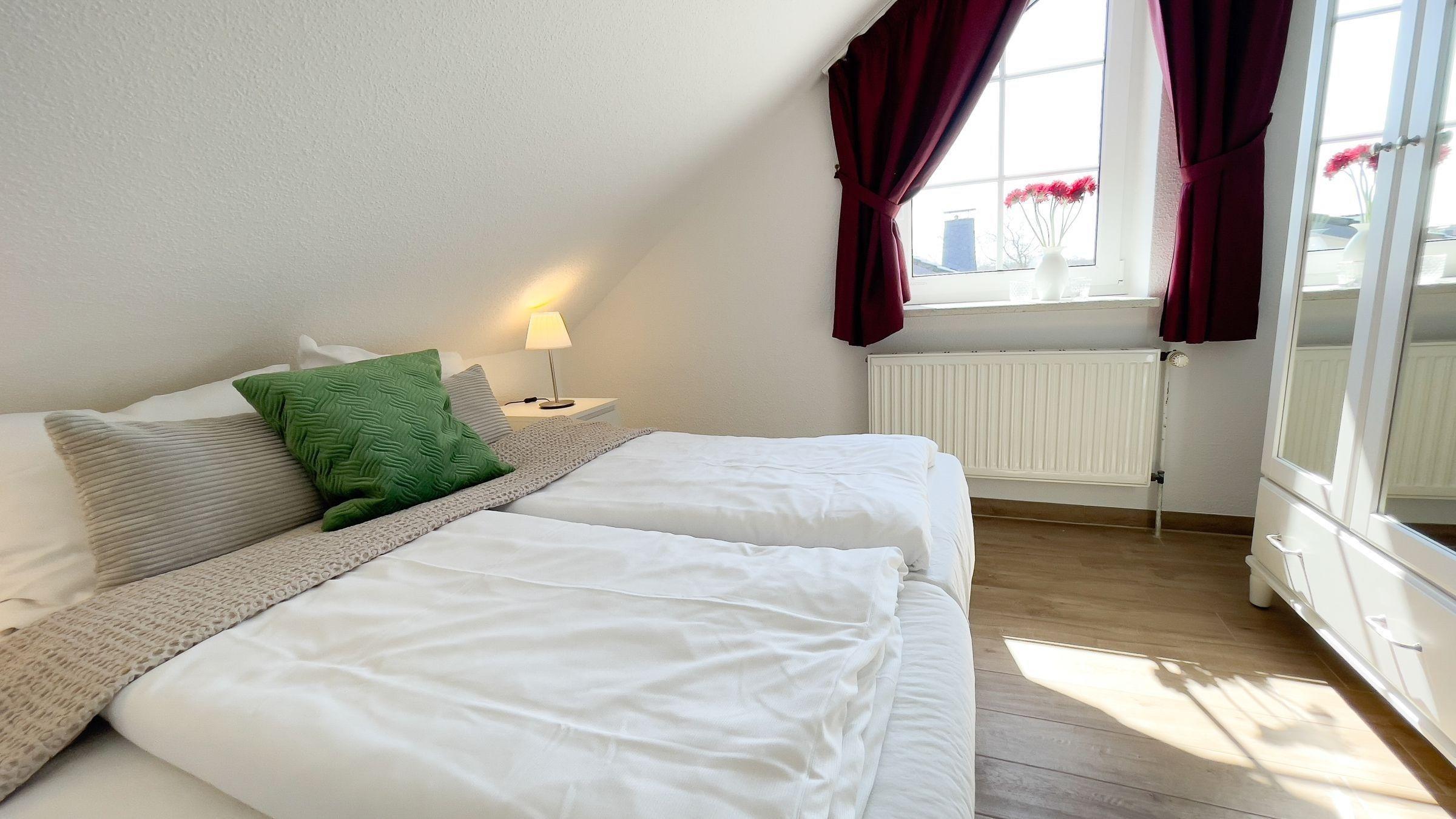 Die Ferienwohnung Haus Kirsten Nr. 5 bietet auf 40 m² Platz für bis zu vier Personen und befindet sich im ersten Stock eines freistehenden Hauses im Kurgebiet Cuxhaven-Duhnen. Lichtdurchflutet und modern gestaltet, umfasst die Unterkunft ein gemütliches Schlafzimmer mit Doppelbett sowie einen Wohnbereich mit einem ausziehbaren Sofa. Ein modernes Tageslichtbadezimmer mit bodengleicher Dusche sorgt für zusätzlichen Komfort.