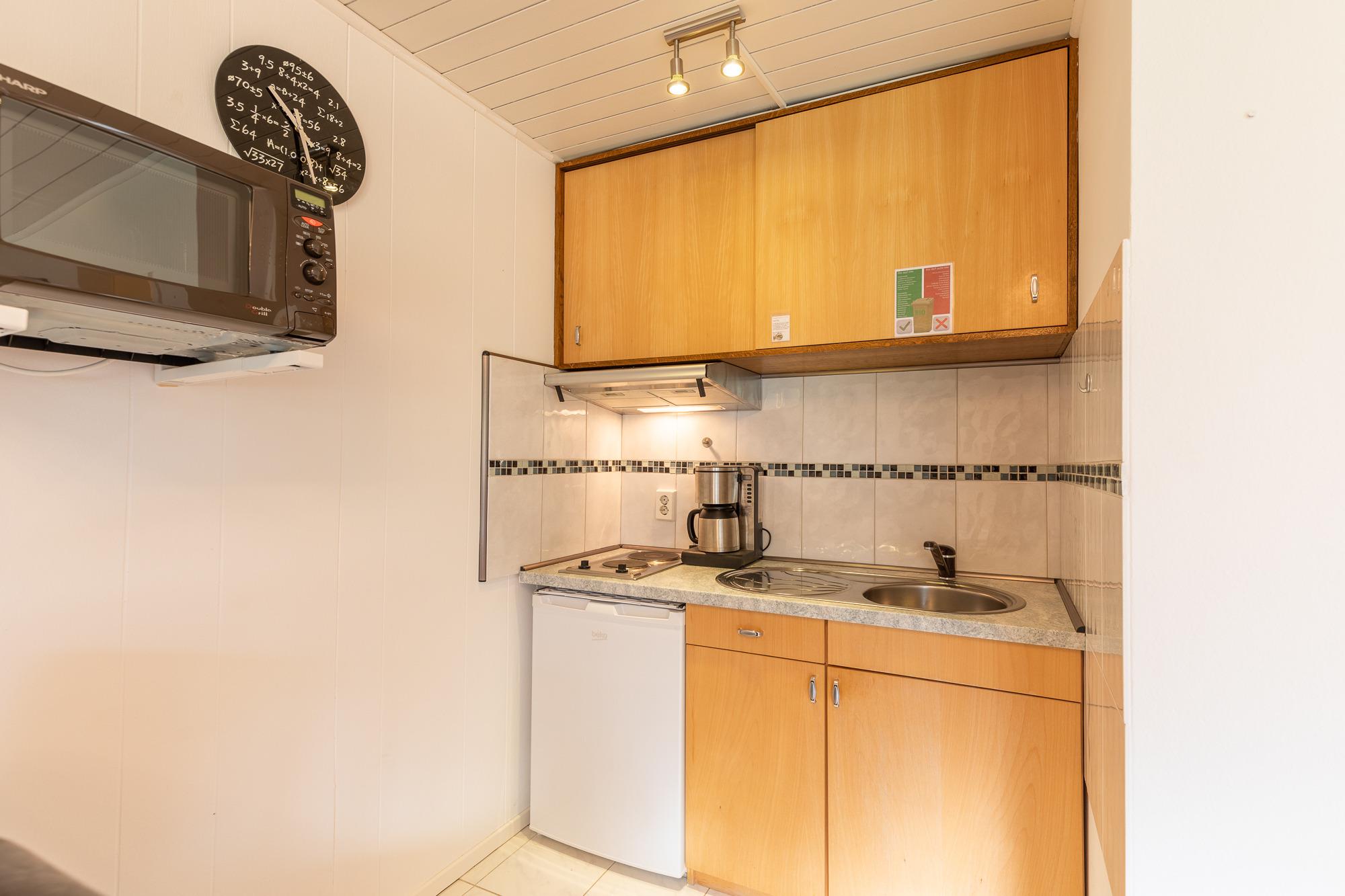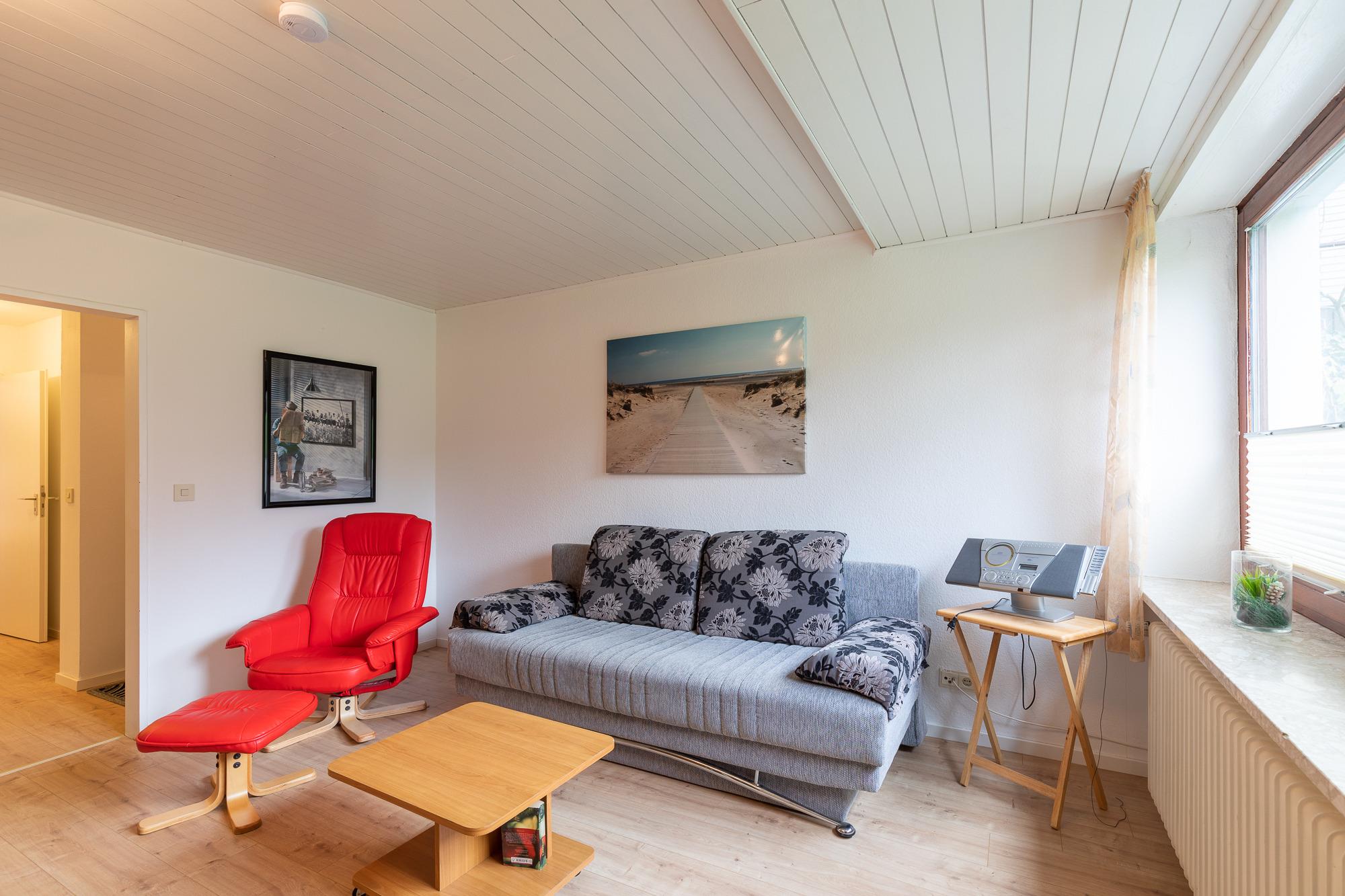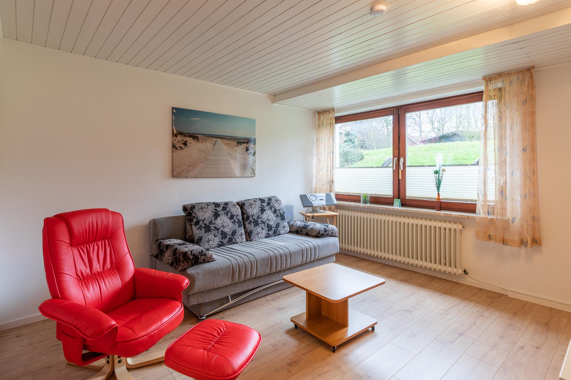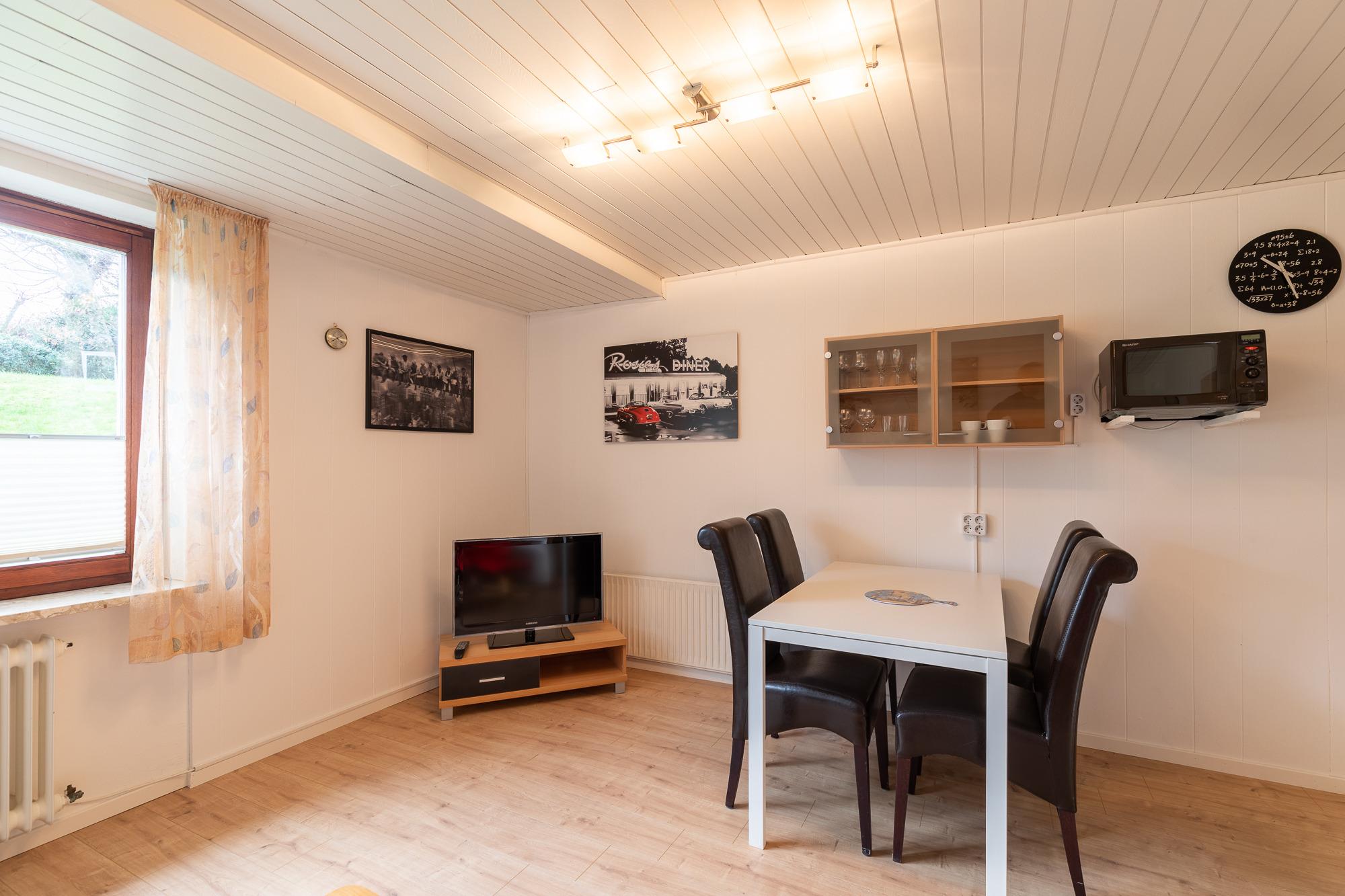 Ein Schlafzimmer mit Doppelbett (180 *200) + Nachttischen, breiter Kommode und großem Fenster. Ein geräumiges Wohnzimmer mit Küchenzeile (Kaffee- und Pad-Maschine, Heißwasser- und Eierkocher, Heißluft/Grill-Mikrowelle, Kühlschrank mit Gefrierfach, 2 Kochplatten), Essplatz, Schlaf-Sofa, Sat TV, Lesesessel mit Fußablage. Bad mit niedriger Duschwanne + Föhn. Begehbarer Kleiderschrank im Flur, Wäscheständer, Staubsauger. Gegensprechanlage/Türöffner. Nichtraucherhaus, keine Haustiere, kostenloser PKW-Stellplatz direkt am Haus, Fahrradunterstand hinterm Haus.