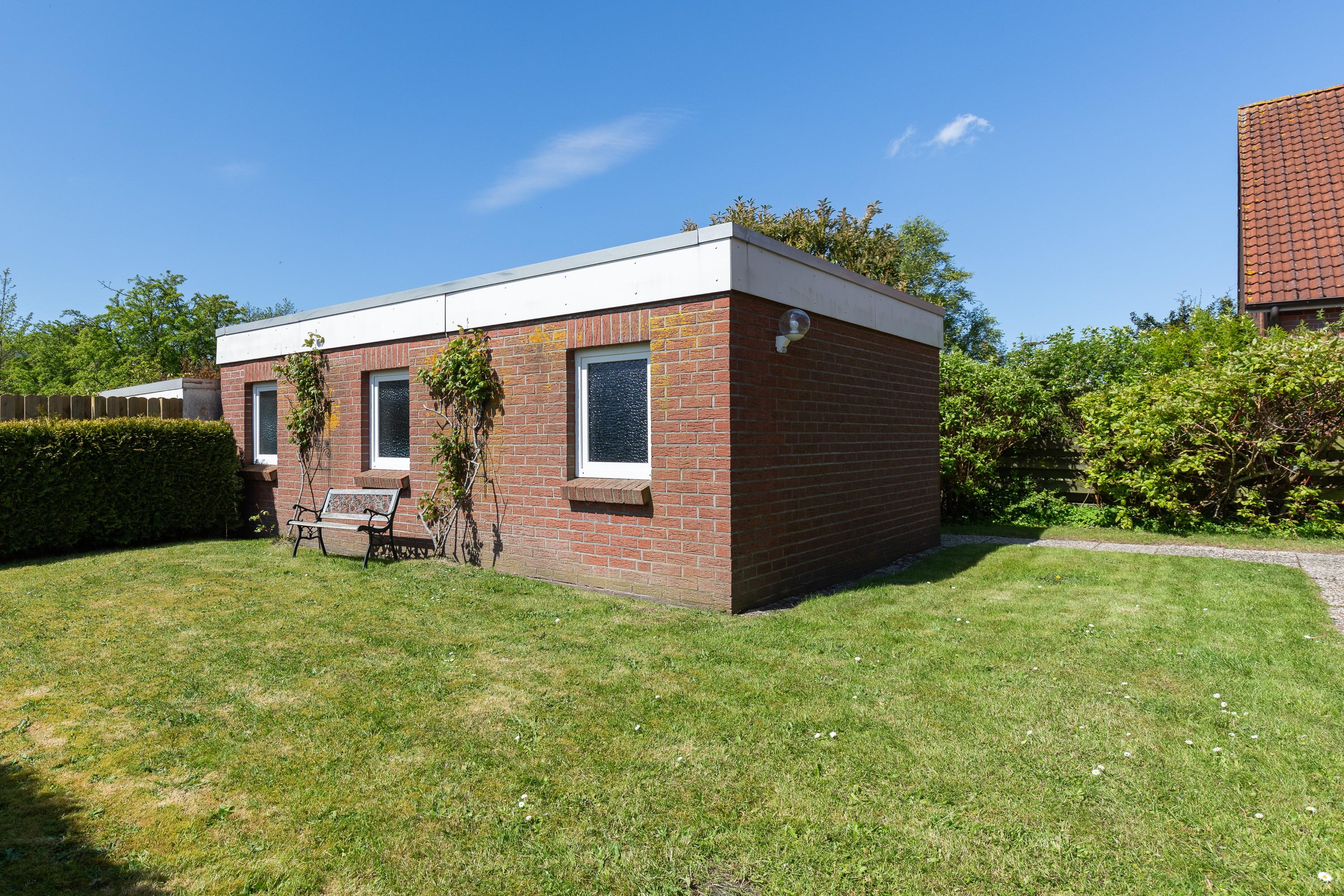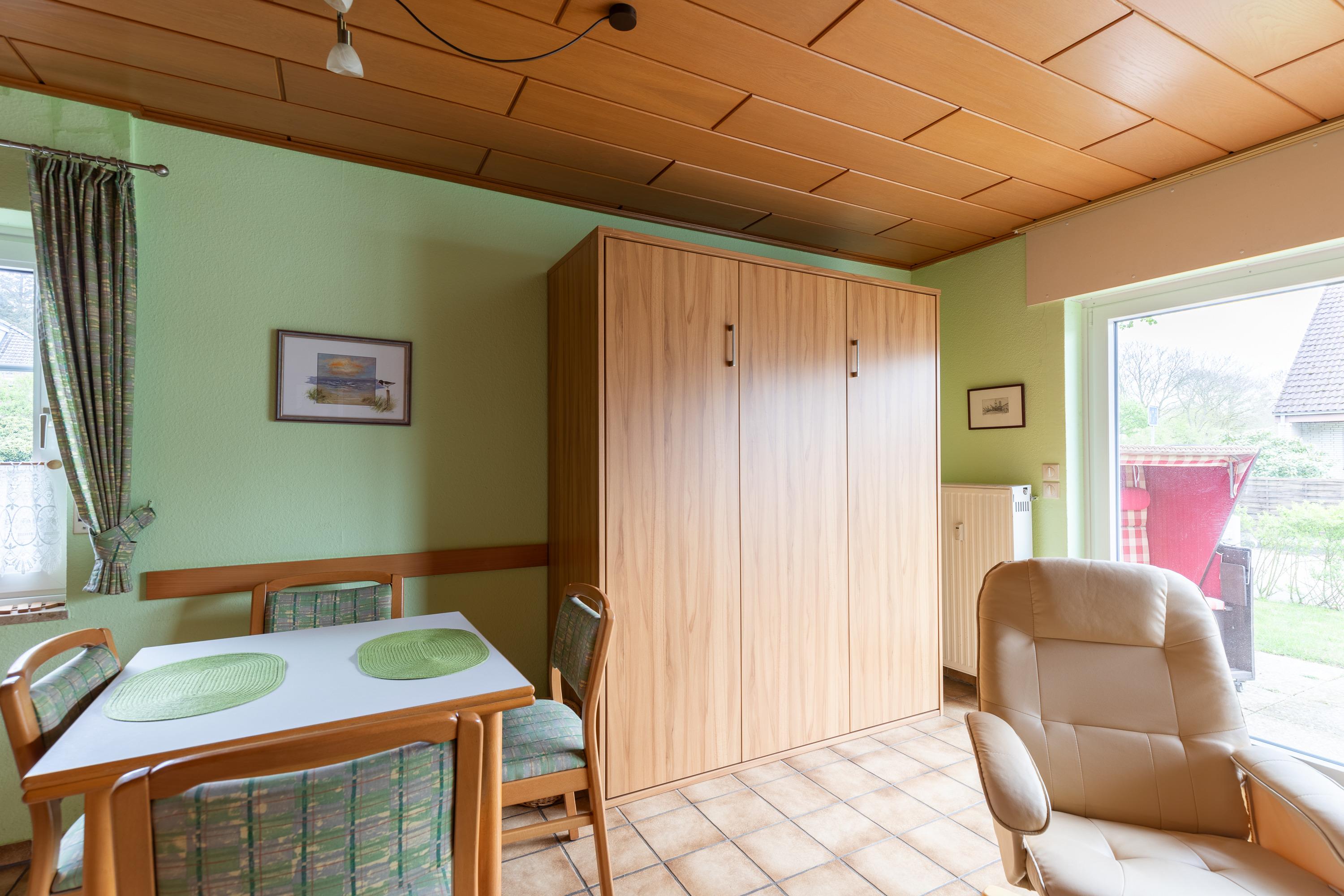 Im Schlafzimmer befindet sich ein Doppelbett. 2 weitere Schlafmöglichkeiten sind in einem ausklappbaren Doppelbett im Wohnbereich. Bad mit Waschbecken, Waschmaschine, Dusche und WC. Große sonnige Terasse mit Strandkorb und Gartenmöbeln.