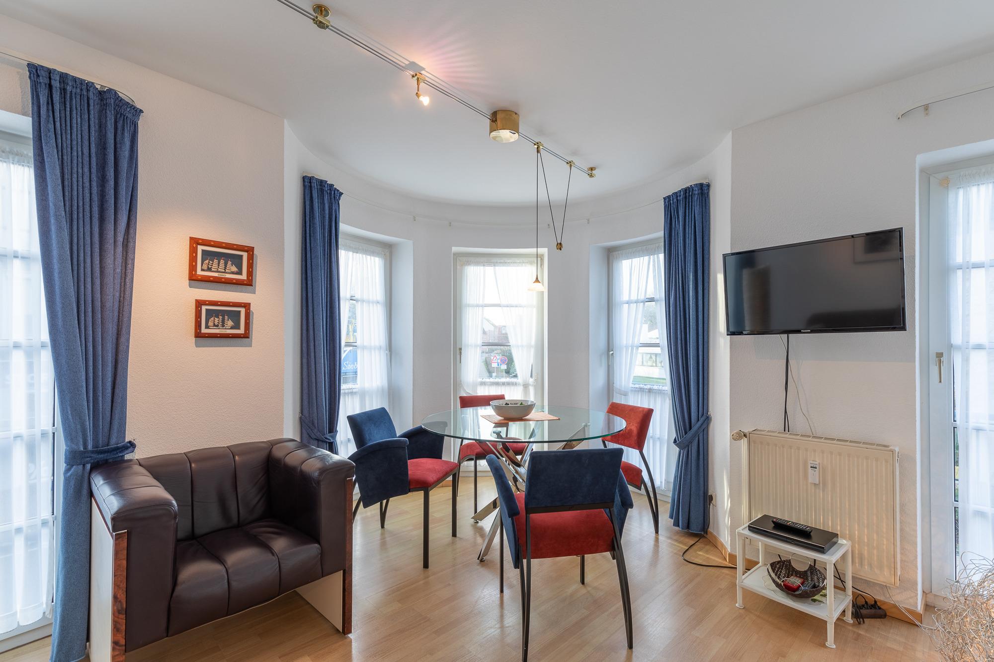 Die Ferienwohnung mit einer Größe von ca. 45m² Wohnfläche (im 1. Obergeschoss) ist komplett bis zu 4 Personen ausgestattet. 1 Wohnzimmer mit Essplatz am Fenster, Sofa-/Schlafsofa, Sessel, 1 Flachbildfernseher, 1 DVD Player, Küchenzeile (Cerankochfeld, kleiner Backofen, Kühlschrank, Kaffeemaschine, Wasserkocher, Toaster und Mikrowelle),1 Schlafzimmer mit Doppelbett (180x200cm) und Schrank, Flur mit Garderobe, Bad mit Dusche, WC, Waschbecken, Handtuchheizkörper und Spiegel, Fahrstuhl im Haus, Nichtraucherwohnung, keine Haustiere, Tiefgaragenstellplatz am Haus.