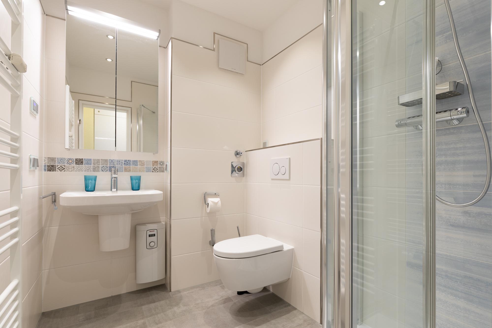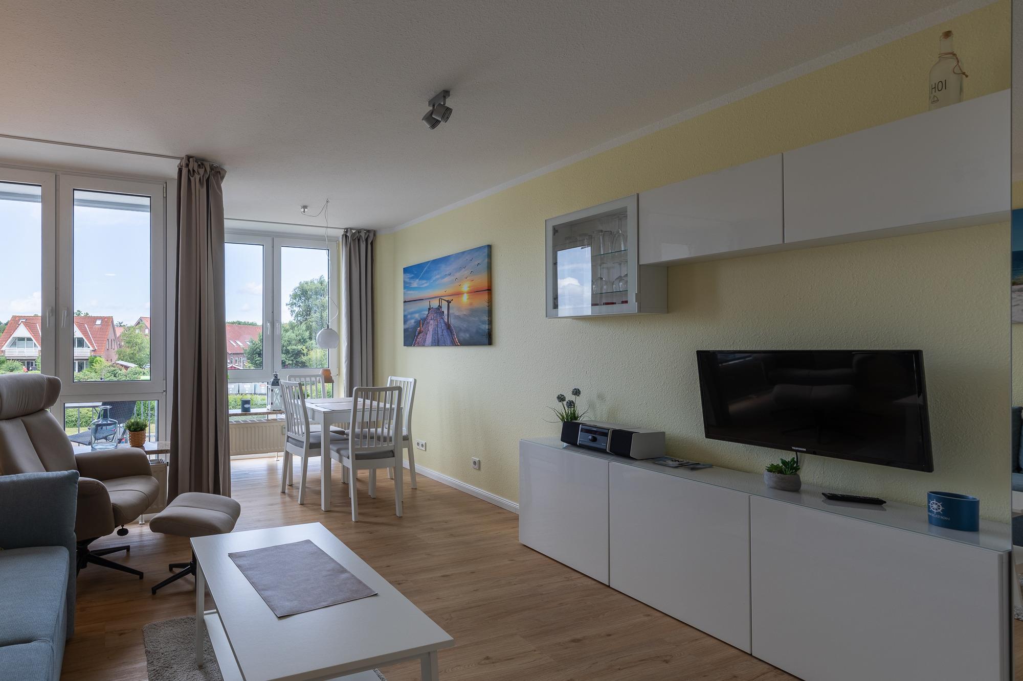 Die 1 Zimmer Wohnung, ca. 35m² ist für bis zu 3 Personen ausgestattet, helles Wohnzimmer mit Sofa (Schlafsofa), Sessel mit Fußteil, Flatscreen TV, Essplatz mit 4 Stühlen, abgetrennter Schlafbereich (Schlafnische, ohne Tür) mit 2 Einzelbetten (jeweils 90 x 200 cm) und Zugang zum Balkon (kleiner Nordbalkon - bietet Platz für 2 Personen, mit Gartenmöbel), Küchenzeile (Ceranfeld mit 2 Kochstellen, Mikrowelle, Kühlschrank - mit Gefrierfach, Geschirrspüler, Kaffeemaschine, Wasserkocher, Toaster), 1 Bad mit Dusche (mit Regenschauerdusche) und WC, Flur, WLAN inkl., PKW-Stellplatz am Haus, Nichtraucher, es sind keine Tiere erlaubt.