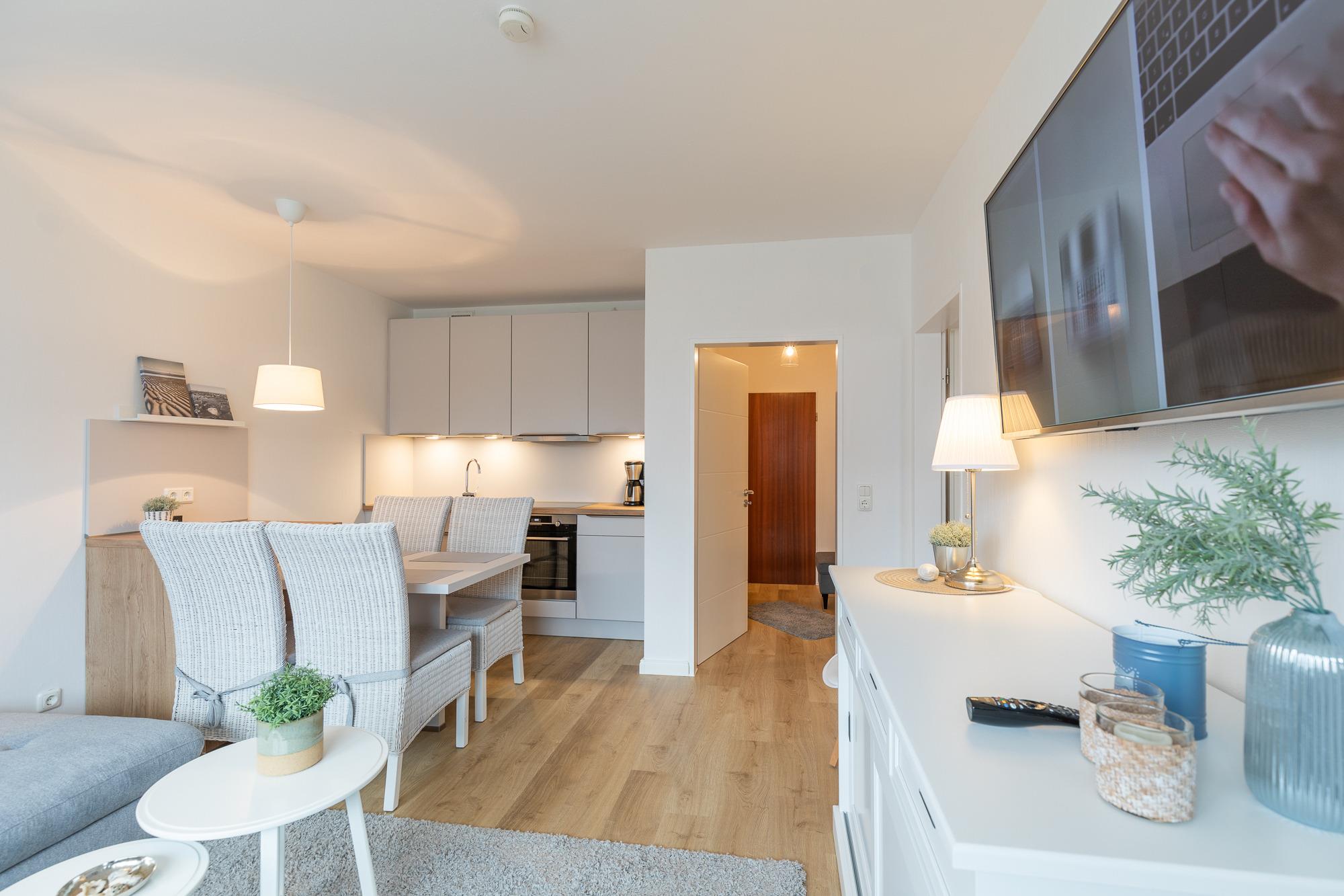 Mit einer Größe von ca. 54 m² Wohnfläche ist die Wohnung komplett bis zu 4 Personen ausgestattet, Wohnzimmer mit kompletter Einbauküche (Backofen, Cerankochfeld, Geschirrspüler, Toaster, Wasserkocher, Kühlschrank), Essplatz, Sofa-Ecke und direktem Zugang zum Balkon, 1 Schlafzimmer mit Doppelbett und TV, 2. Schlafzimmer innenliegend mit Etagenbett, Bad mit Dusche und WC, 1 Flatscreen TV im Wohnzimmer, Nichtraucherwohnung, keine Haustiere, PKW-Stellplatz direkt am Haus.