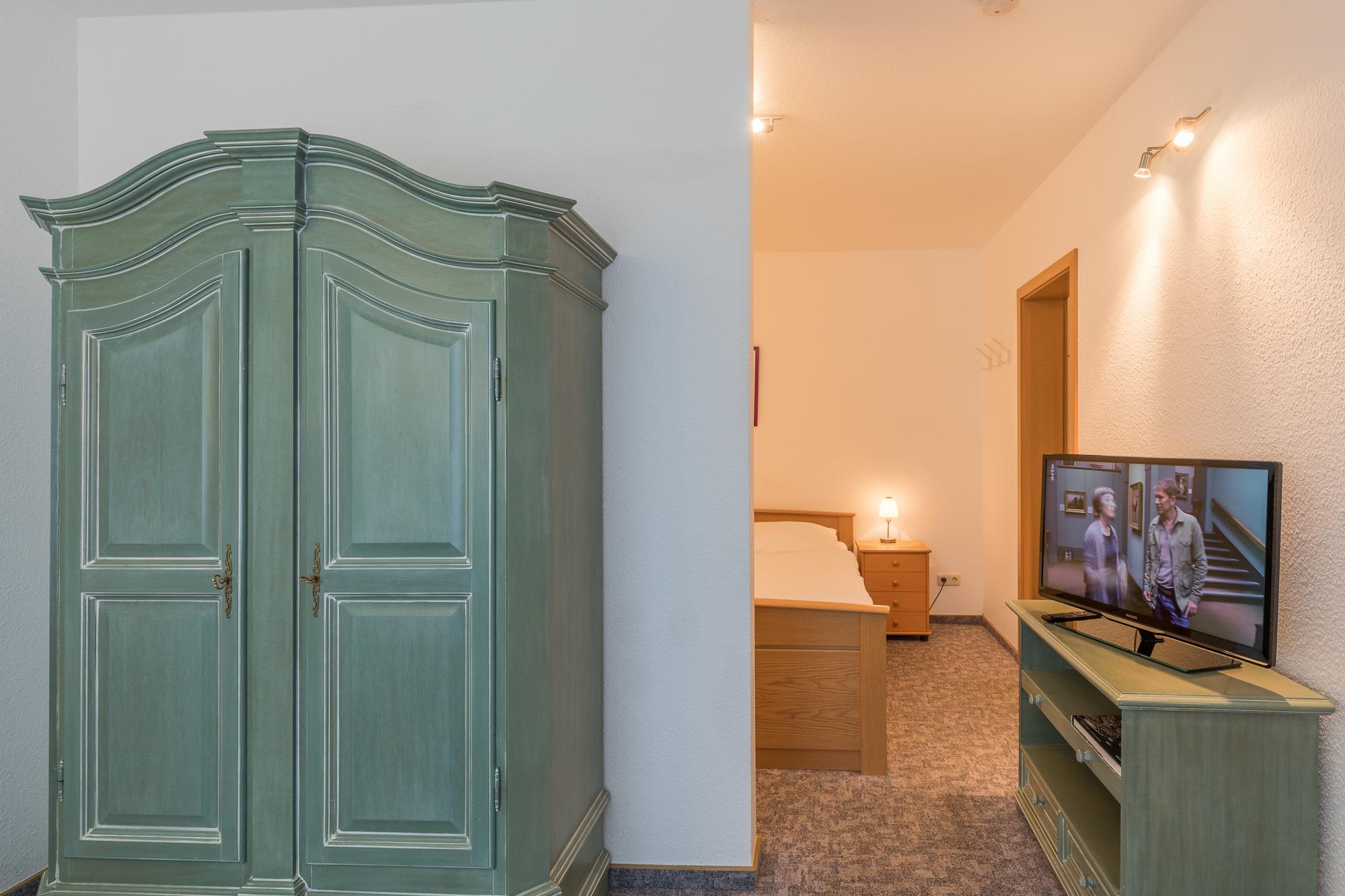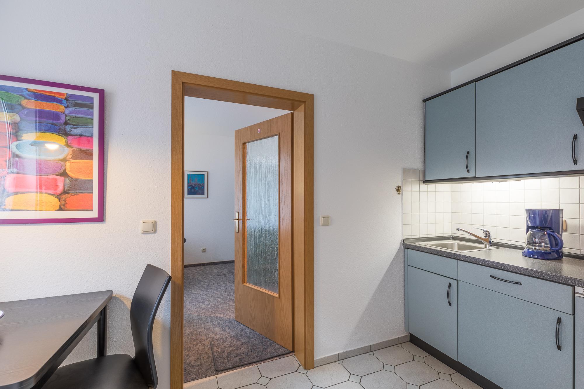 Die Ferienwohnung 1, mit einer Größe von ca. 30 m² Wohnfläche ist komplett bis zu 2 Personen ausgestattet. Wohnzimmer mit Sitzmöglichkeiten, TV und abgetrennten Betten (Doppelbett), Eingangsbereich mit Einbauküche (Cerankochfeld, Kaffeemaschine, Toaster, Wasserkocher), Essplatz, Sofa-Ecke, Bad mit Dusche und WC, Nichtraucherwohnung, keine Haustiere, PKW Stellplatz direkt am Haus.