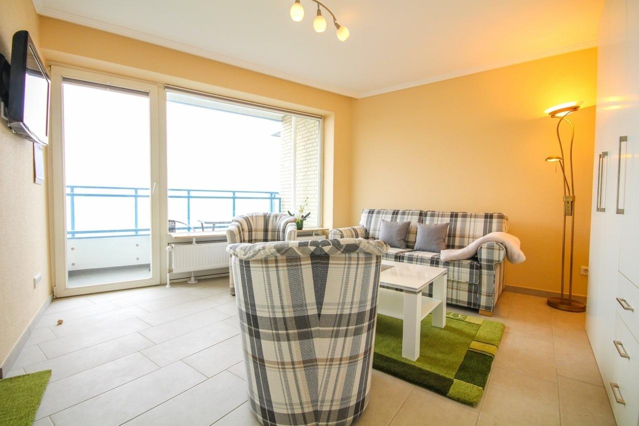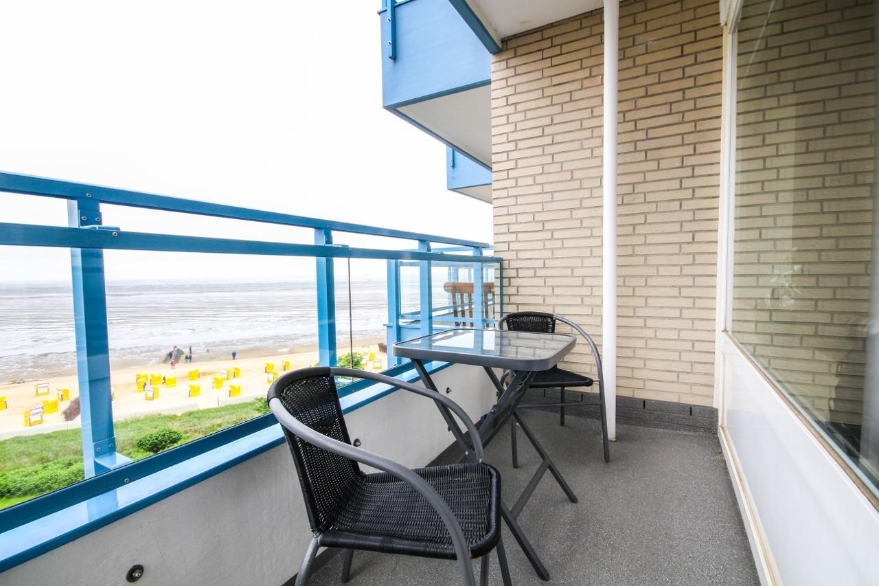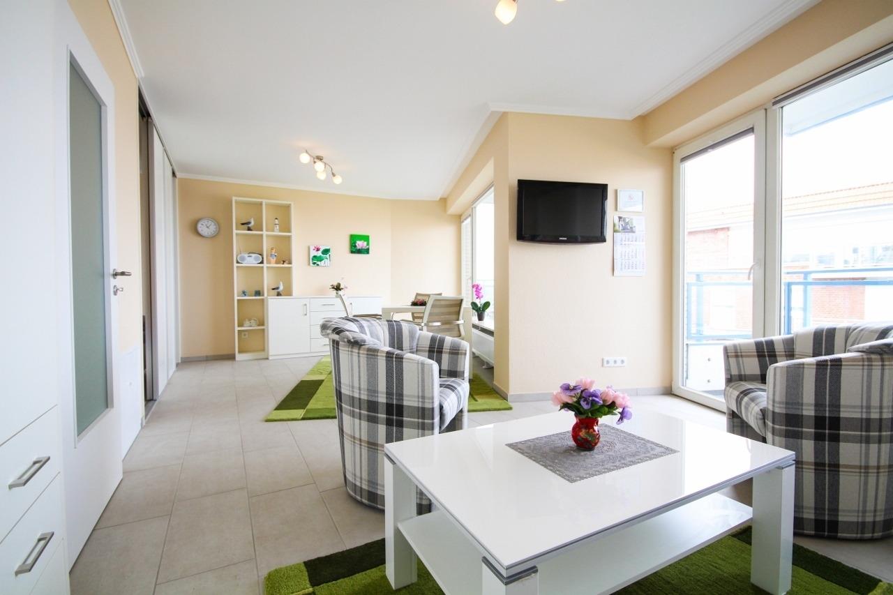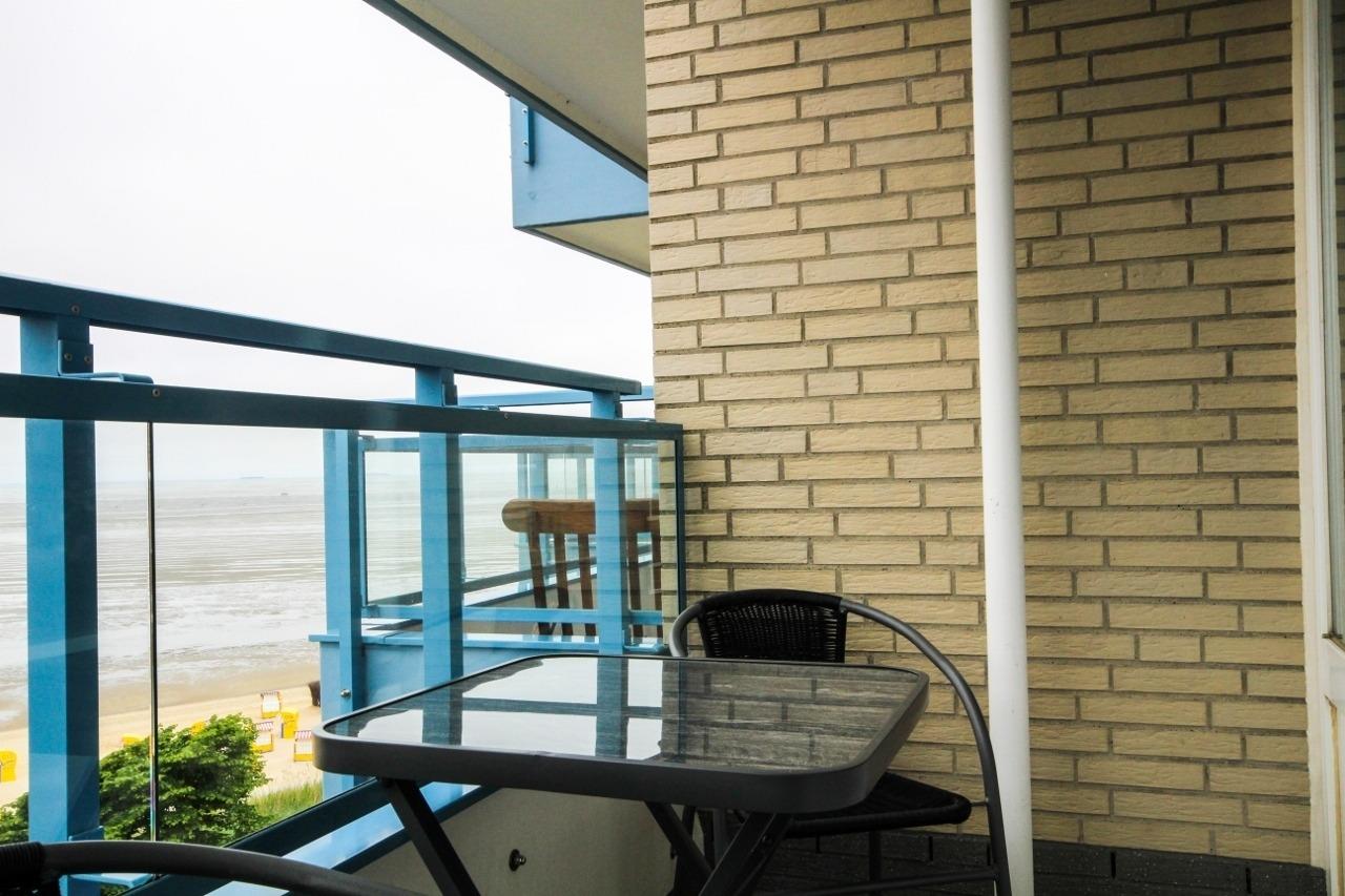 Die modern eingerichtete Ferienwohnung, in der 3. Etage, mit einer Größe von ca. 46 m² Wohnfläche ist komplett bis zu 2 Personen ausgestattet. 1 großes Wohnzimmer mit Essplatz, Sofa Ecke, Flatscreen TV, direkter Zugang zu den 2 Balkonen mit Blick zur Insel Neuwerk, abgetrennte Schlafnische mit 1 Doppelbett, Einbauküche (Cerankochfeld, Kaffeemaschine, Wasserkocher, Mikrowelle), 1xDusche (ebenerdig) mit WC, Nichtraucherwohnung, keine Haustiere.
