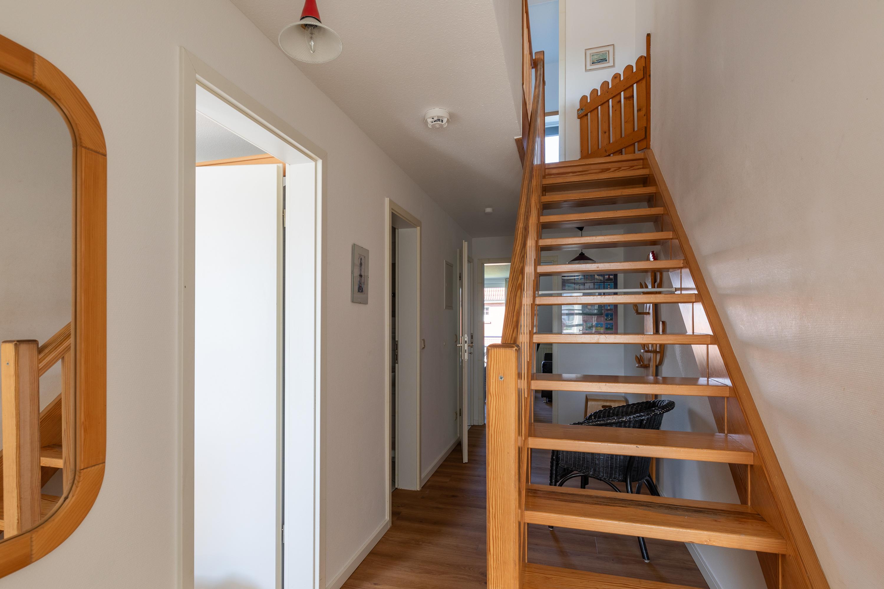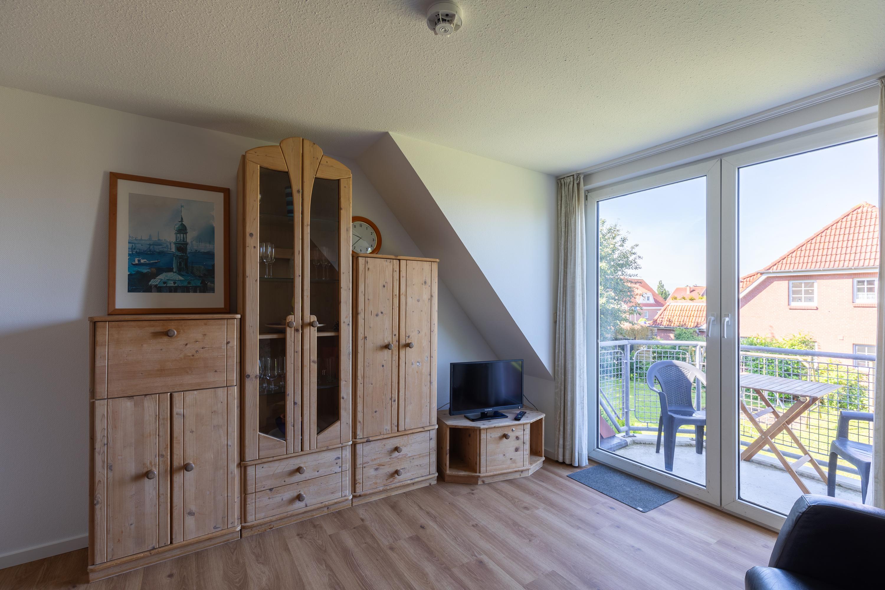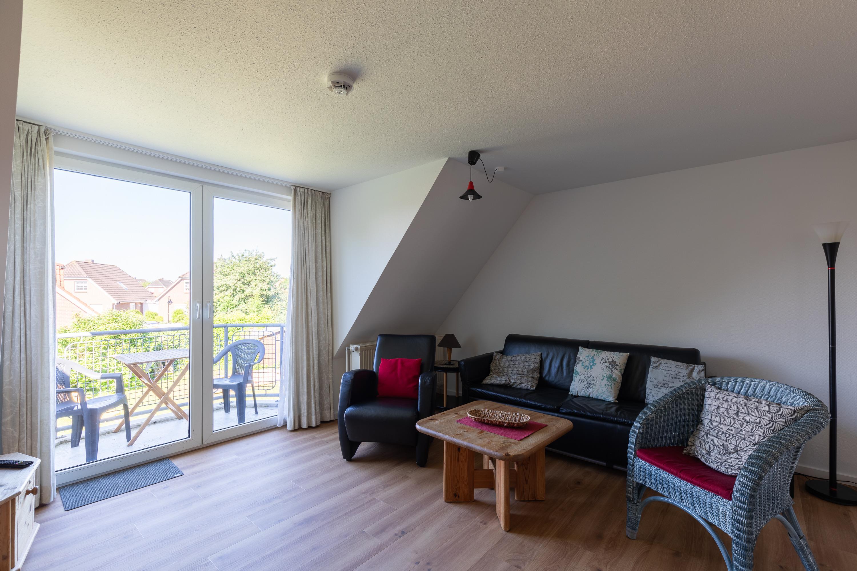 Die 4 Zimmer Studiowohnung (1. Obergeschoss) ca. 76m² ist für bis zu 5 Personen ausgestattet, helles großes Wohnzimmer mit Sofa, Flatscreen TV, Essplatz mit 5 Stühlen und Zugang zum Süd Balkon (mit Gartenmöbel), Küchenzeile (Backofen, 4 - Plattenherd, Mikrowelle, Kühlschrank, Kaffeemaschine, Wasserkocher, Toaster), 2 Bäder mit jeweils Dusche und WC, großer Flur mit Treppe in das Dachgeschoss, 1 Schlafzimmer mit Doppelbett (140x200) im 1. Obergeschoss, folgende Schlafzimmer befinden sich im Dachgeschoss: 1 Schlafzimmer mit Einzelbett (90x200), 1 Schlafzimmer mit Doppelbett (2 Matratzen mit 90x200), PKW-Stellplatz am Haus, Nichtraucher, es sind keine Tiere erlaubt.