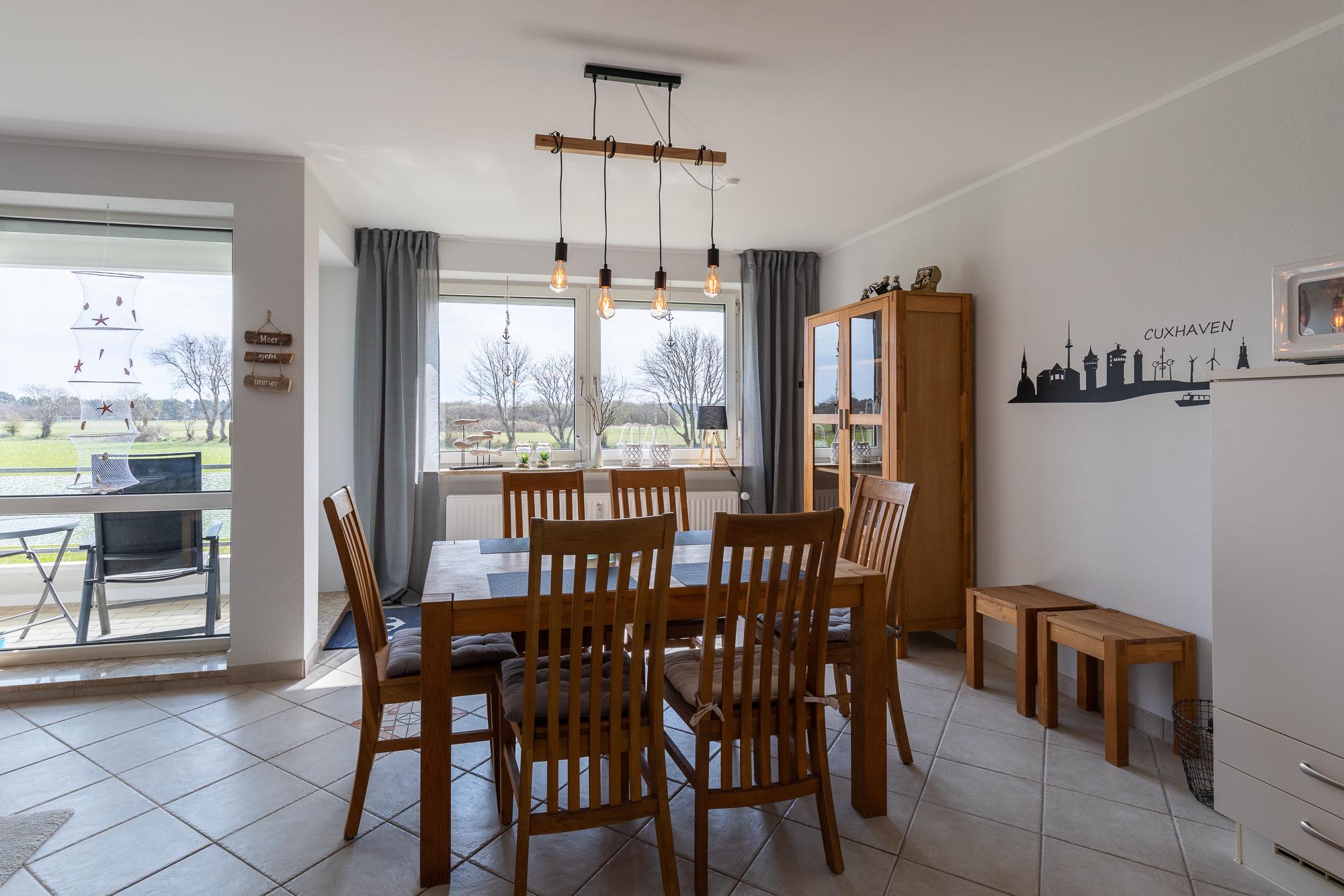 Die 3 Zimmer Wohnung, ca. 76m² ist für bis zu 4 Personen ausgestattet, helles großes Wohnzimmer mit Sofa, TV, Essplatz mit 4 Stühlen und Zugang zum Süd Balkon (mit Gartenmöbel und Blick auf die Duhner Heide), Küchenzeile (Ceranfeld, Backofen, Dunstabzugshaube, Mikrowelle, Geschirrspüler, Kaffeemaschine, Wasserkocher, Toaster), 1 Bad mit Dusche und WC, Flur, die Schlafzimmer befinden sich im Souterrain (an heißen Tagen erwartet Sie hier eine angenehme Kühle und ein gutes Raumklima), 1 Schlafzimmer mit Doppelbett (mit Außenrollo), Kinderbett und Kleiderschrank, 1 Schlafzimmer mit 2 Einzelbetten (mit Außenrollo) und Kleiderschrank, PKW-Stellplatz am Haus, Nichtraucher, es sind keine Tiere erlaubt.