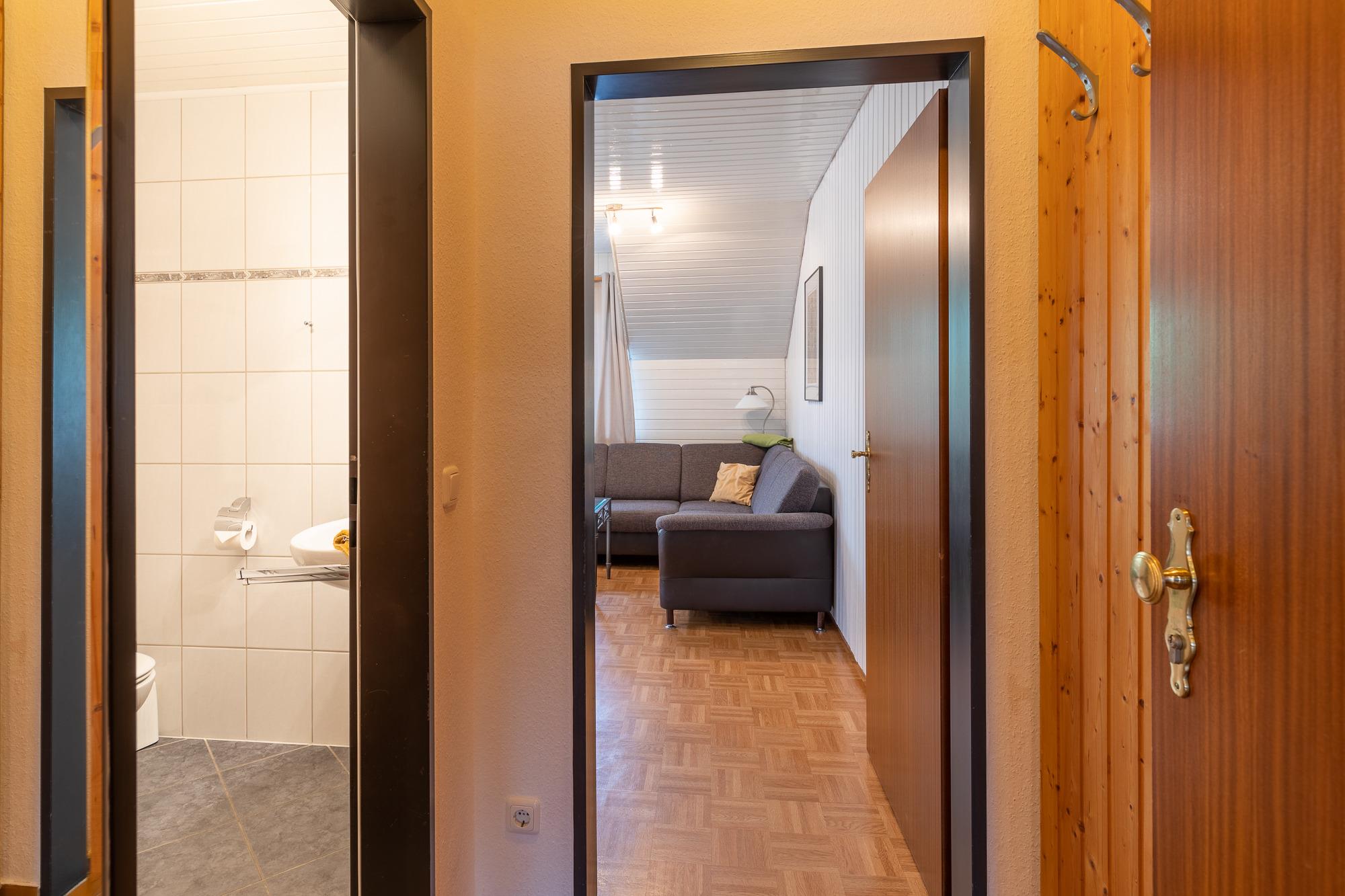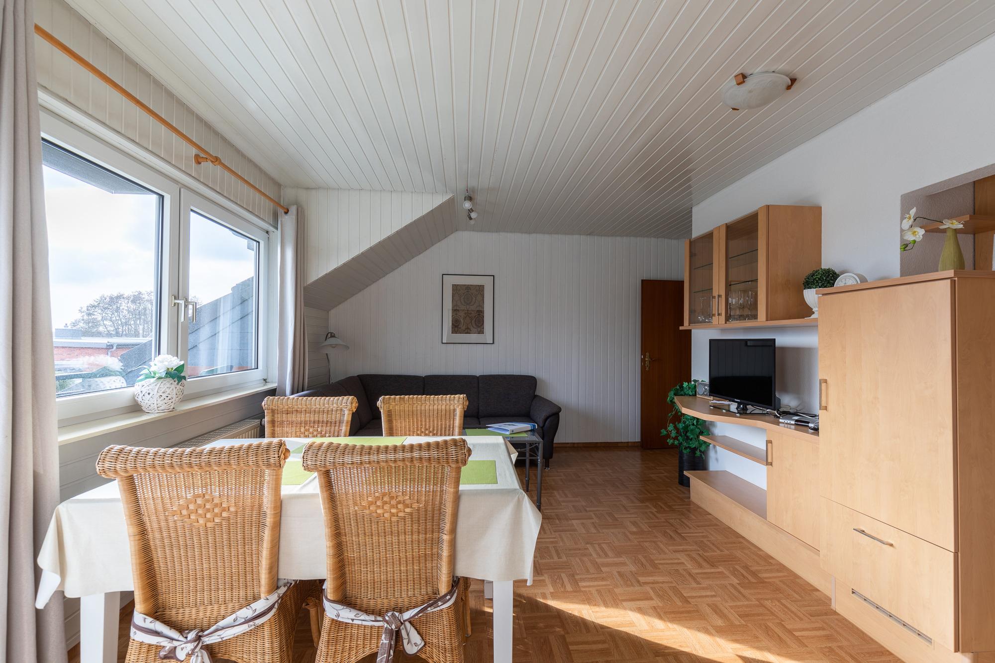 Die 3 Raum Ferienwohnung (befindet sich im 1. OG) mit einer Größe von ca. 58 m² Wohnfläche ist komplett bis zu 4 Personen (1 Zustellbett ist möglich) ausgestattet.