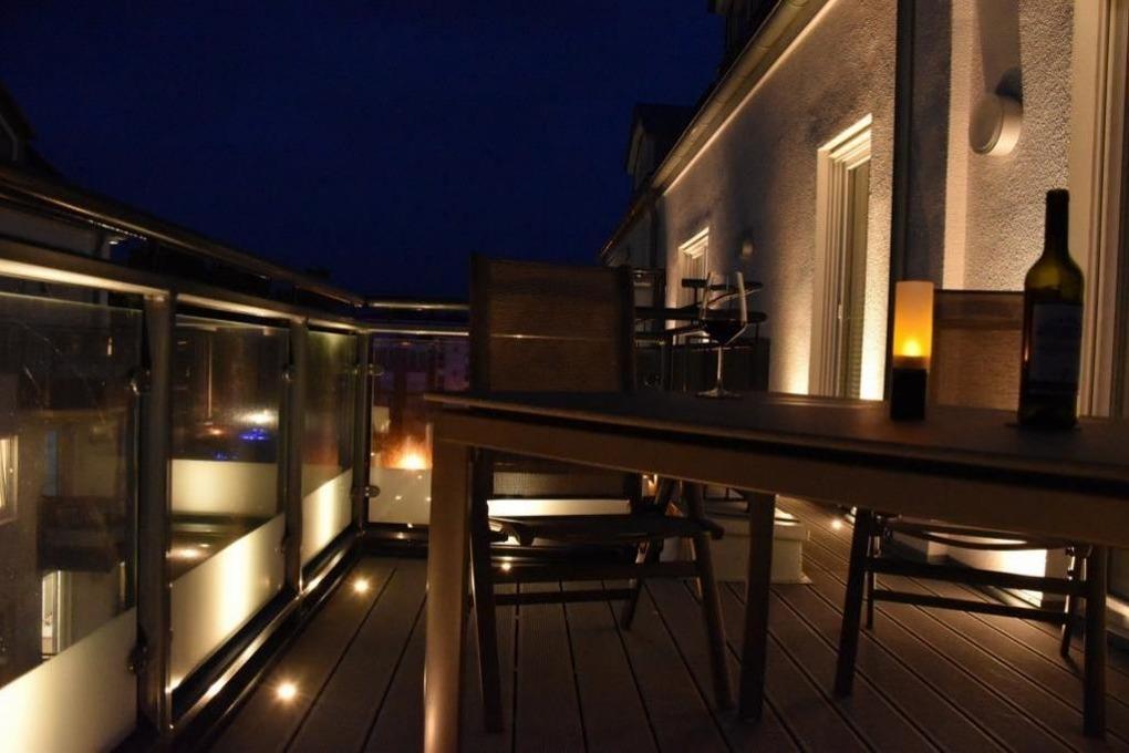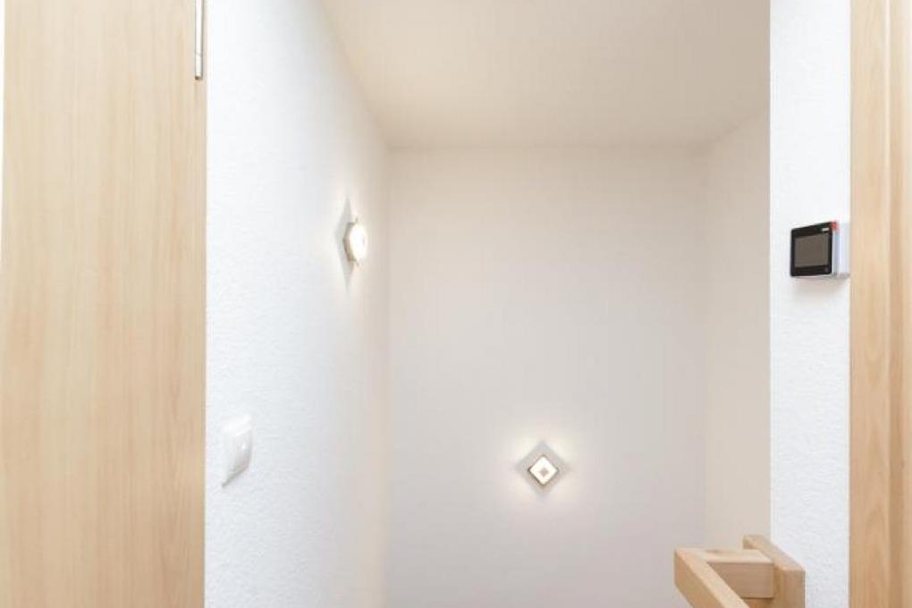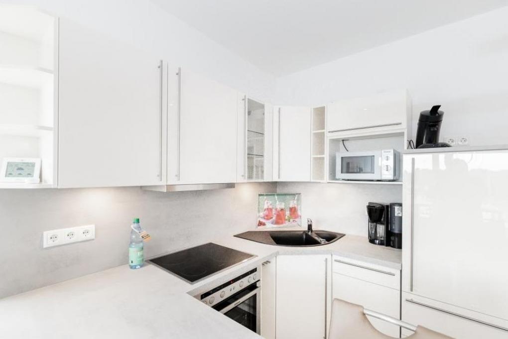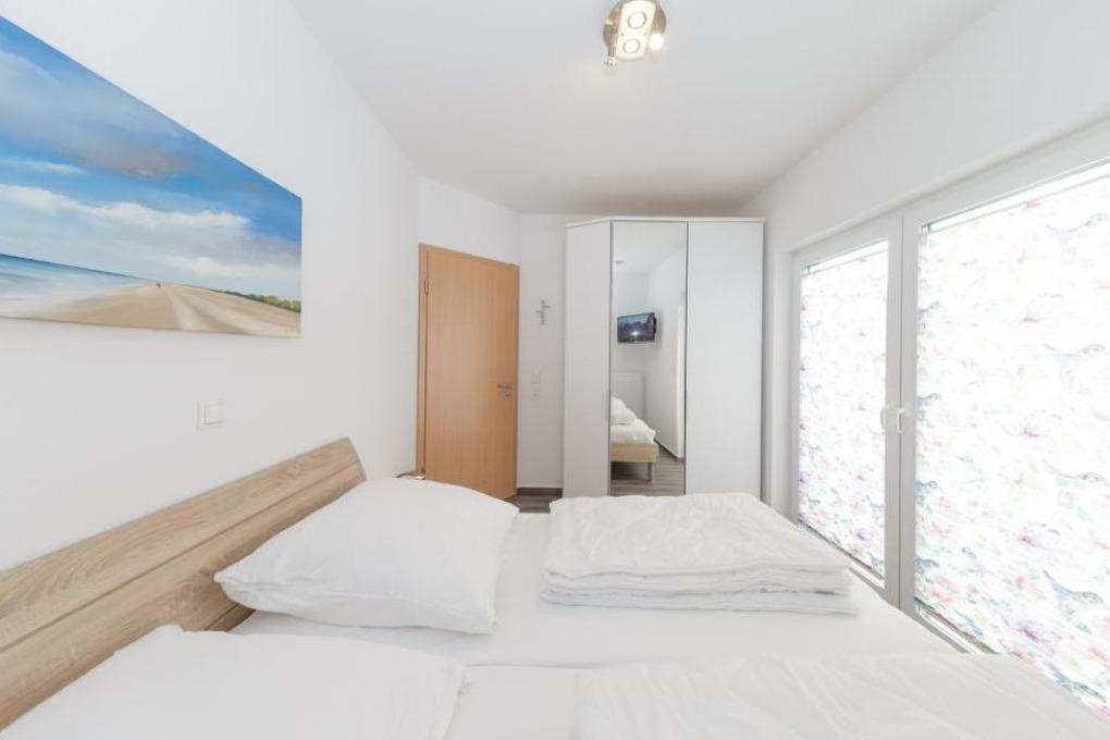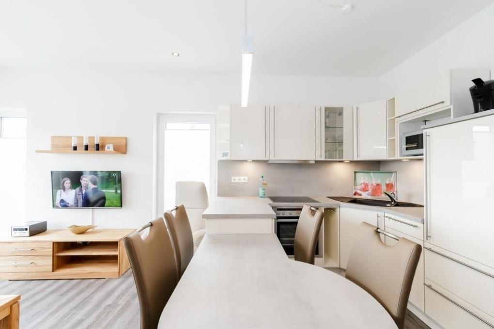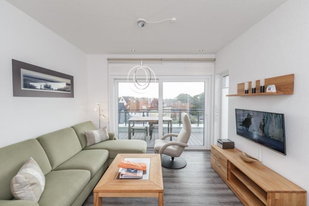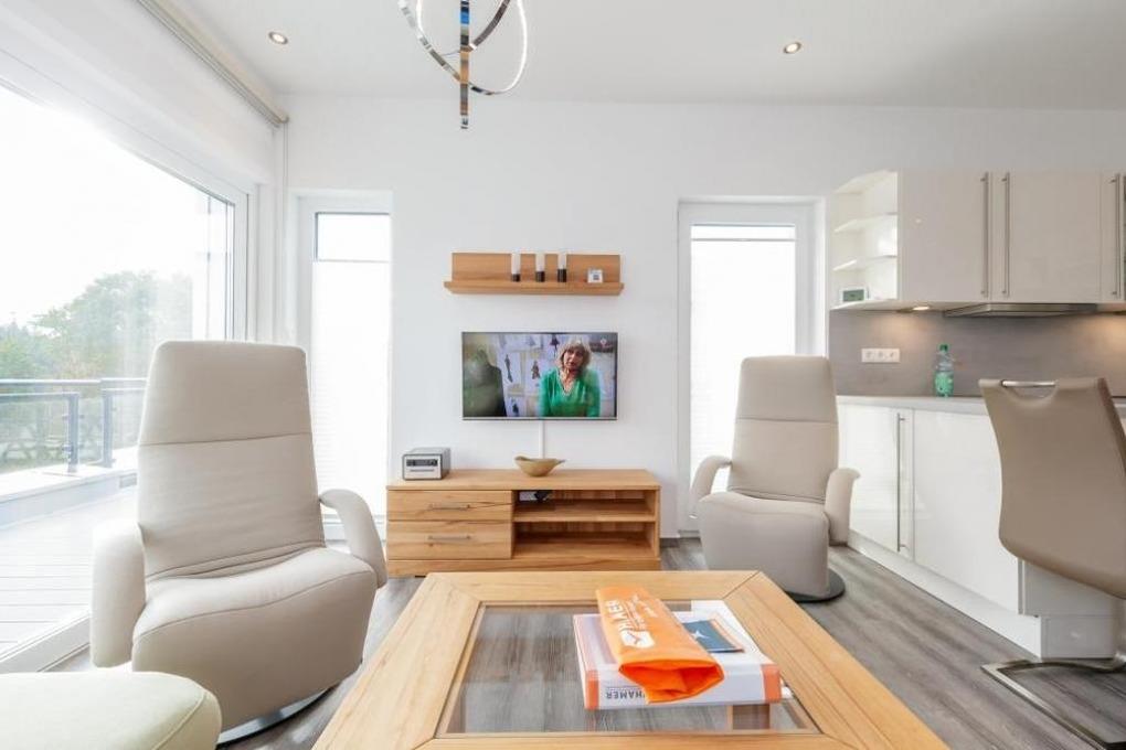 Sonnige, moderne 2-Raum-Penthouse-Wohnung für 2 Pers. auf der 3.Etage, 1 Schlafzimmer mit Doppelbett, TV und Außenjalousien., 2x Dusche/WC, Wohnzimmer mit vollausgestatteter Küchenzeile (Back., Mikrow., Geschirrspüler), sonniger Süd-Balkon, 2xSAT-TV, Sonoro-HiFi-Anlage, Blue-Ray-DVD, kostenfreies W-Lan, Personenaufzug, reservierter Pkw-Stellplatz in ebenerdiger Doppelgarage #16, keine Haustiere erlaubt, Nichtraucher.