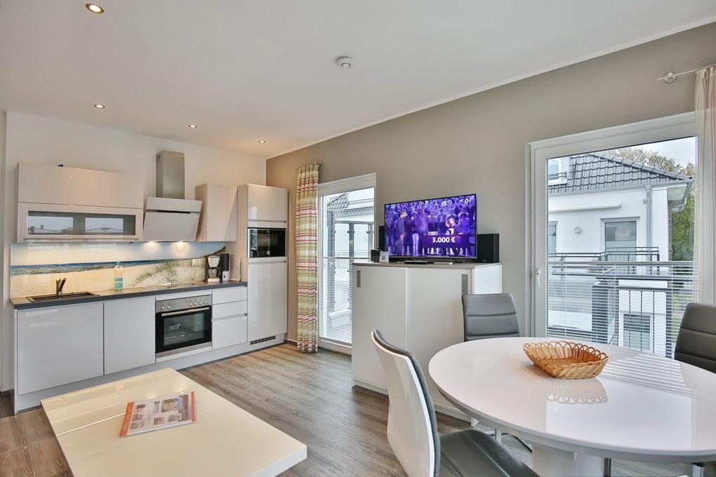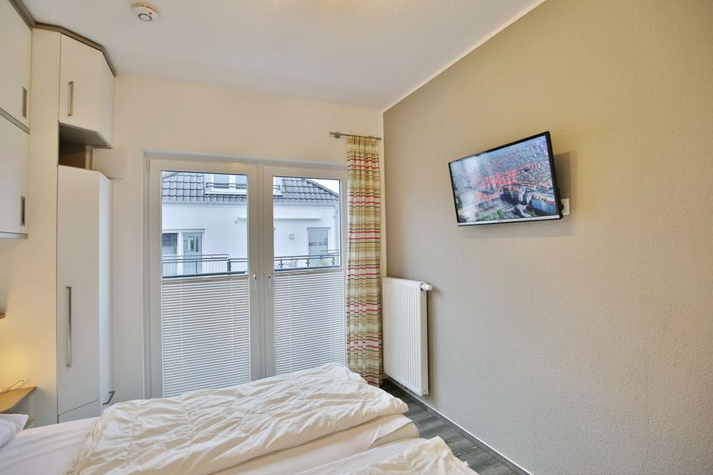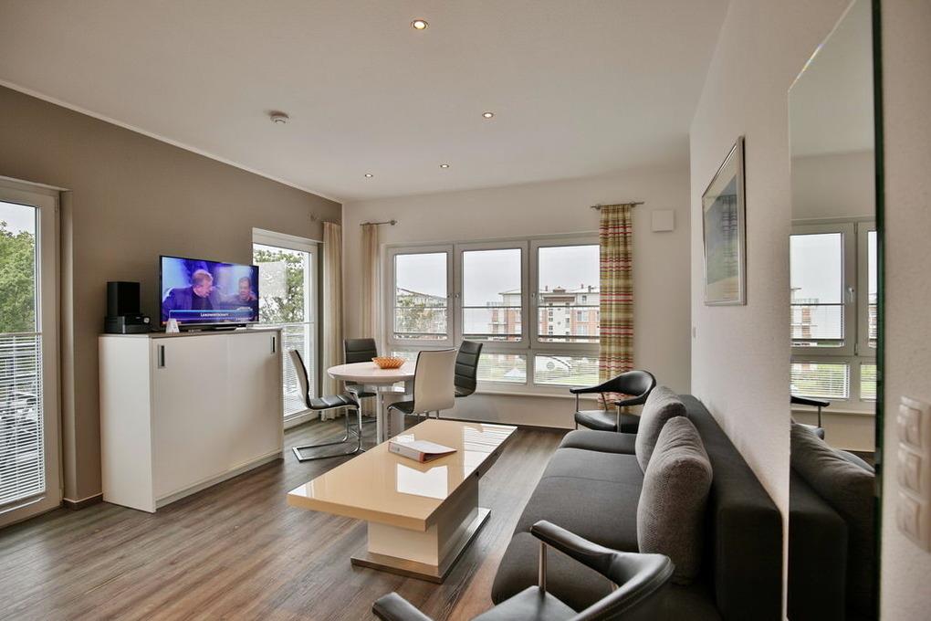 Sehr schöne, moderne 3-Raum-Wohnung bis 4 Pers. mit Seesicht. (ca. 65m²), 3.Etage, 1 Schlafzimmer mit Doppelbett und Außenjalousien, 1 Schlafzimmer mit zwei Einzelbetten, Wohnzimmer mit vollausgestatteter Küchenzeile (Back., Mikrow., Geschirrspüler), Schlafsofa, 2xSAT-TV, CD-Radio, kostenfreies W-Lan, 2xDu/WC, Haarföhn, Balkon (nord/west), Klimagerät im Wohnzimmer, Personenaufzug, reservierter Pkw-Stellplatz i.d. Tiefgarage, keine Haustiere erlaubt, Nichtraucher.