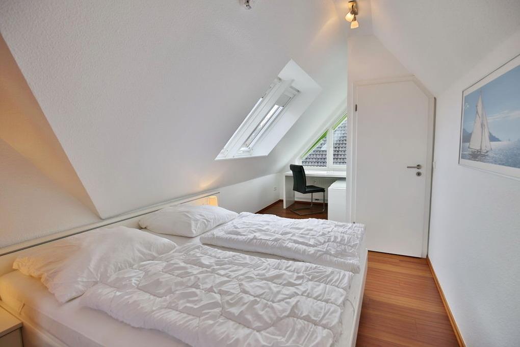 Schöne 2 Zimmer Maisonette Wohnung (ca. 50m²) in der 1. Etage. Nichtraucher, Schlafzimmer mit Doppelbett [&] TV im Dachgesch., Wohnzimmer mit großem Südbalkon, Kabel-TV, kostenfreies Wlan, Stereo, Küchenzeile (Gefrief., Backofen und Geschirrspüler), Dusche/Wc, Nichtraucher, keine Haustiere, Pkw-Stellplatz #6.