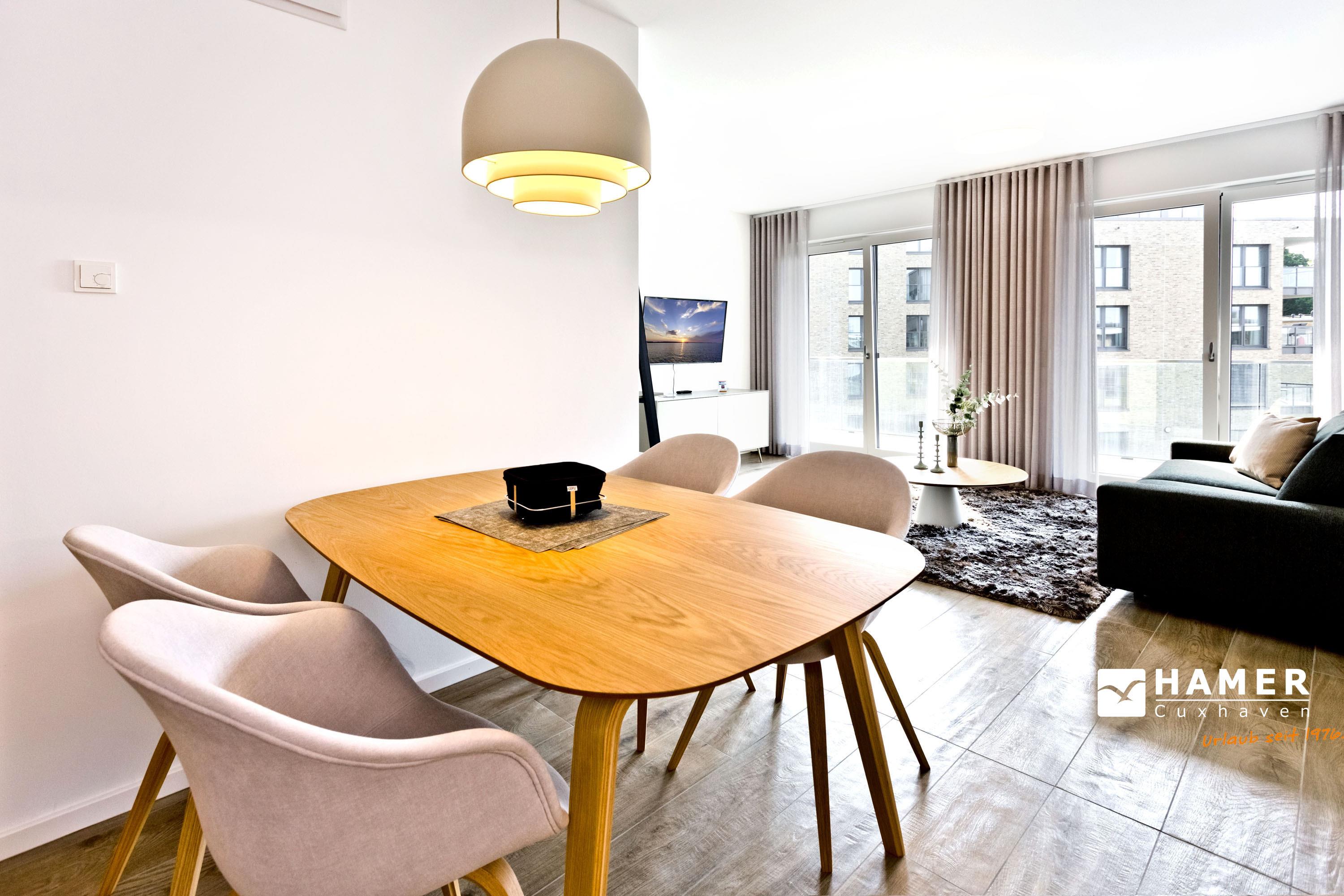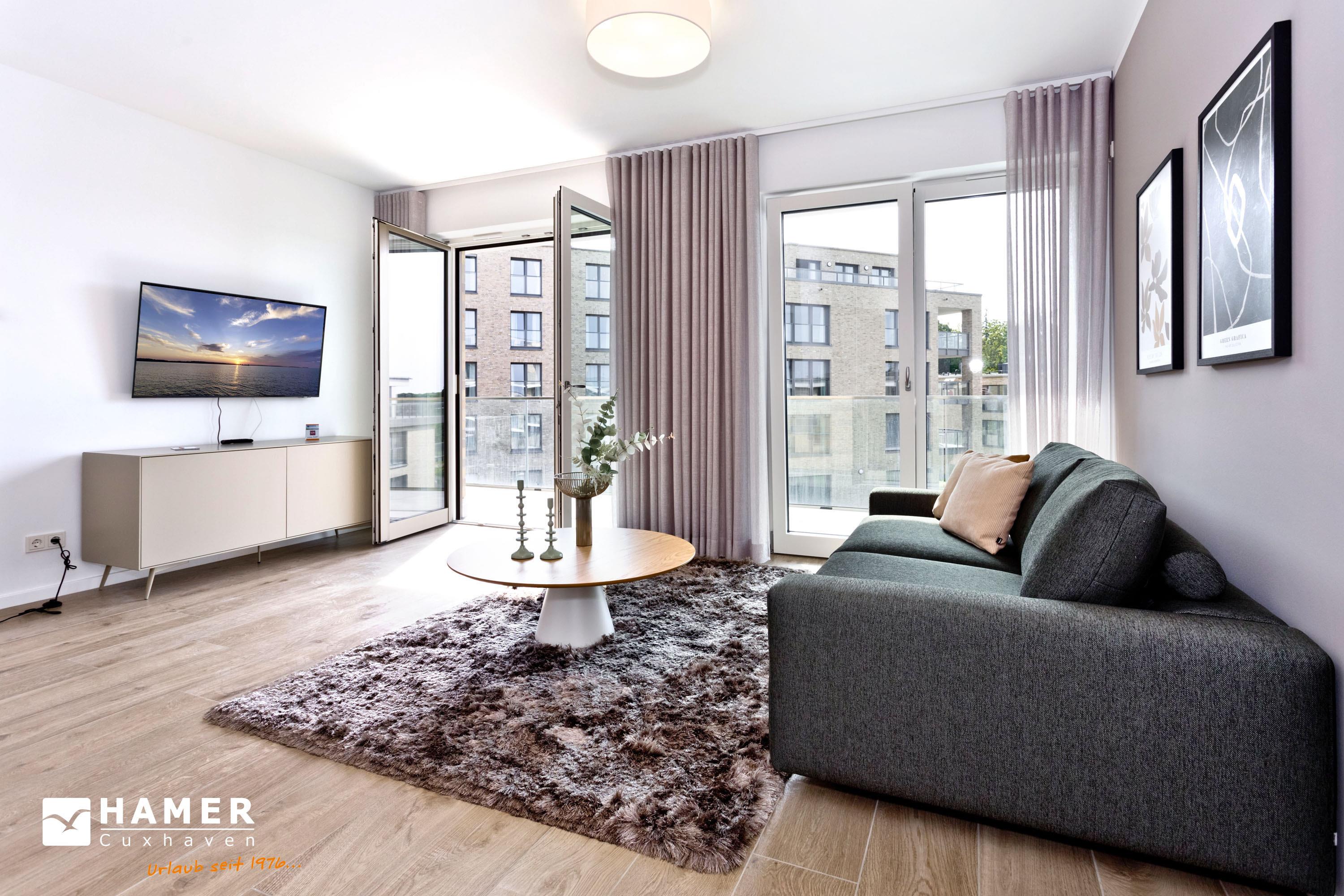 Sehr schöne, großzügige 2-Raum-Ferienwohnung auf ca. 55m² für bis zu 4 Personen (max. 2 Erw. 2 Kinder bis 16J.) geeignet. Sonniges Wohn- / Schlafzimmer mit hochwertiger Schlafcouch, TV, Radio, kostenloses W-LAN-Internet, Essplatz, Außenjalousien u. Plissees, Zugang zum sonnigen Südbalkon.