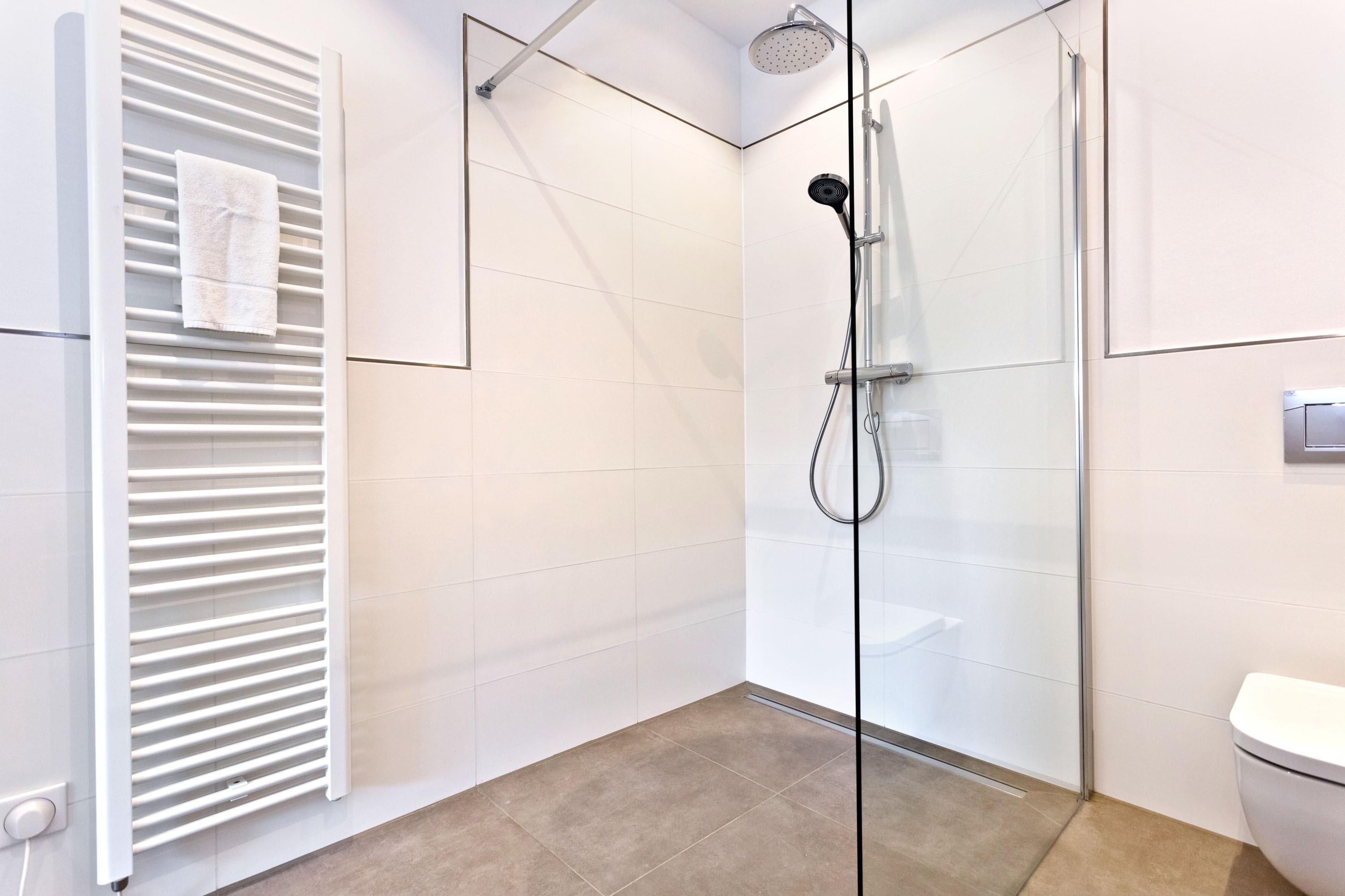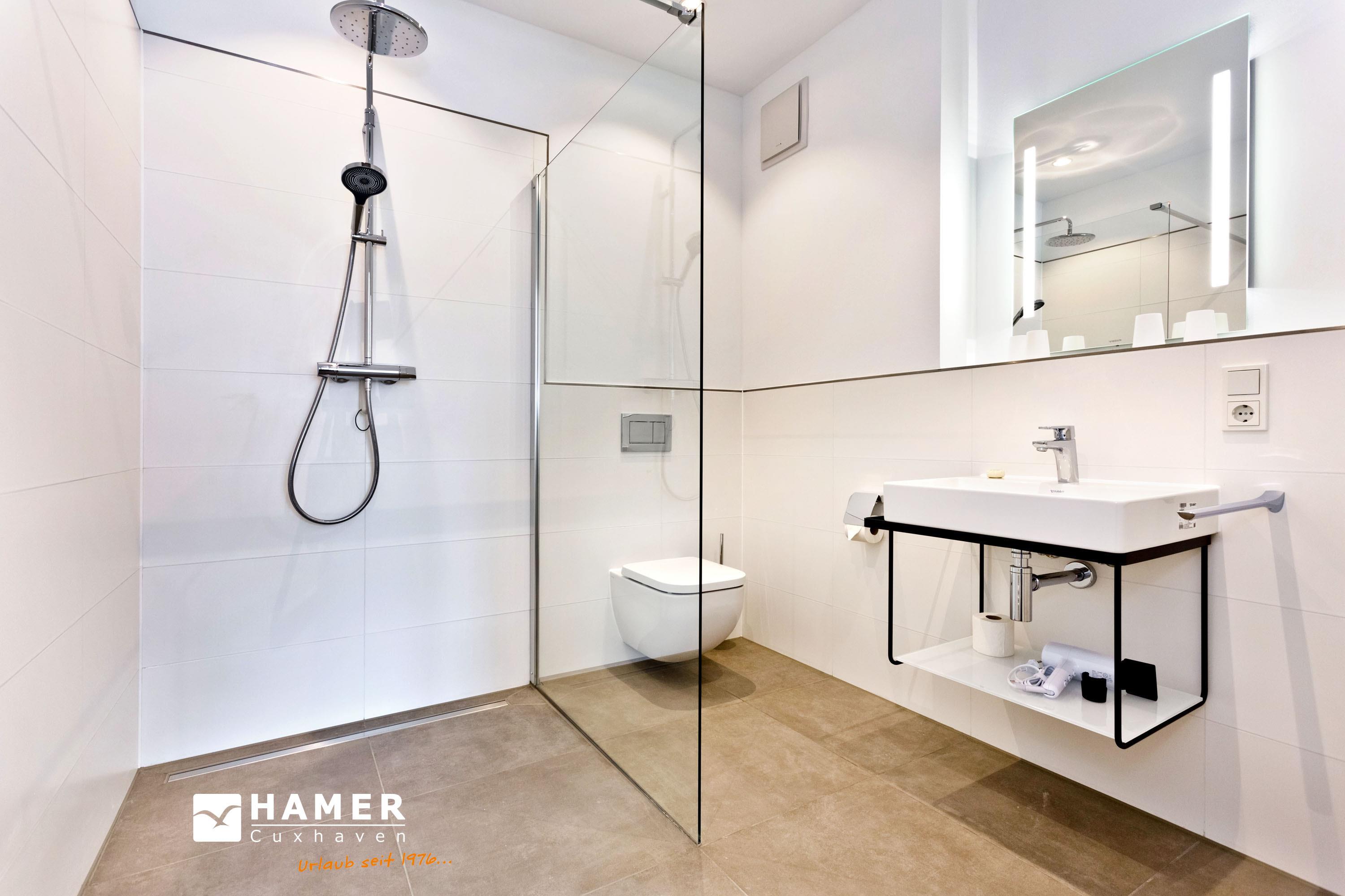 Großzügige, barrierefreie Dusche, WC.