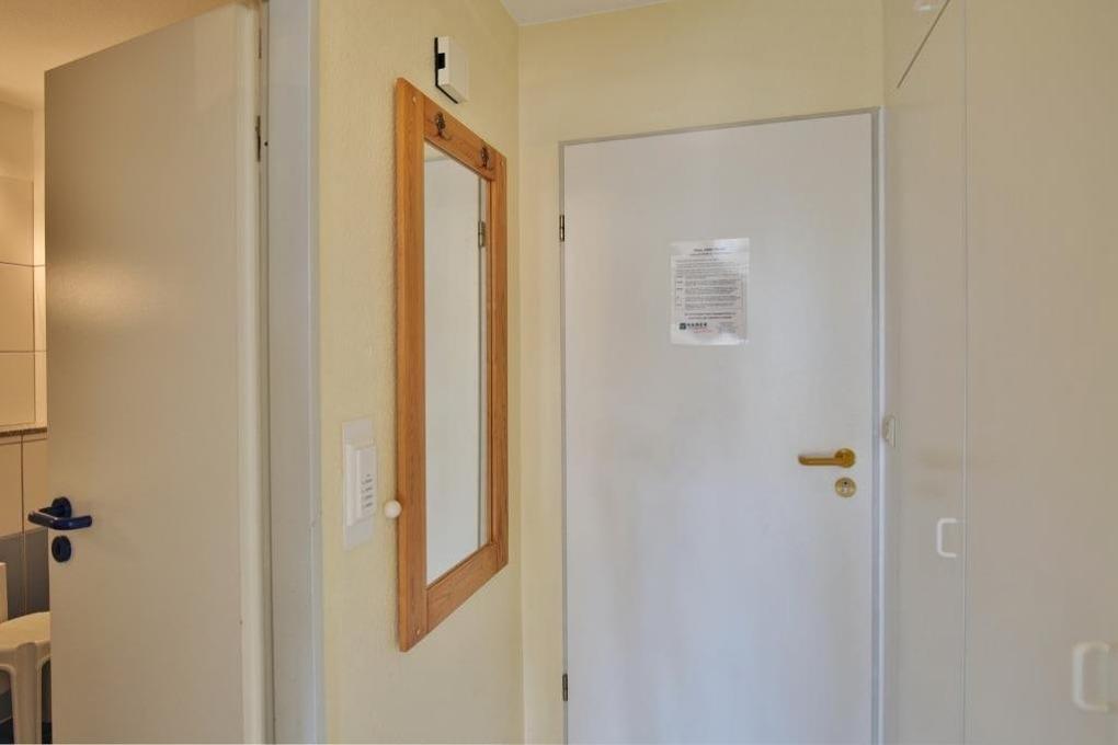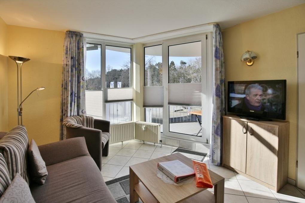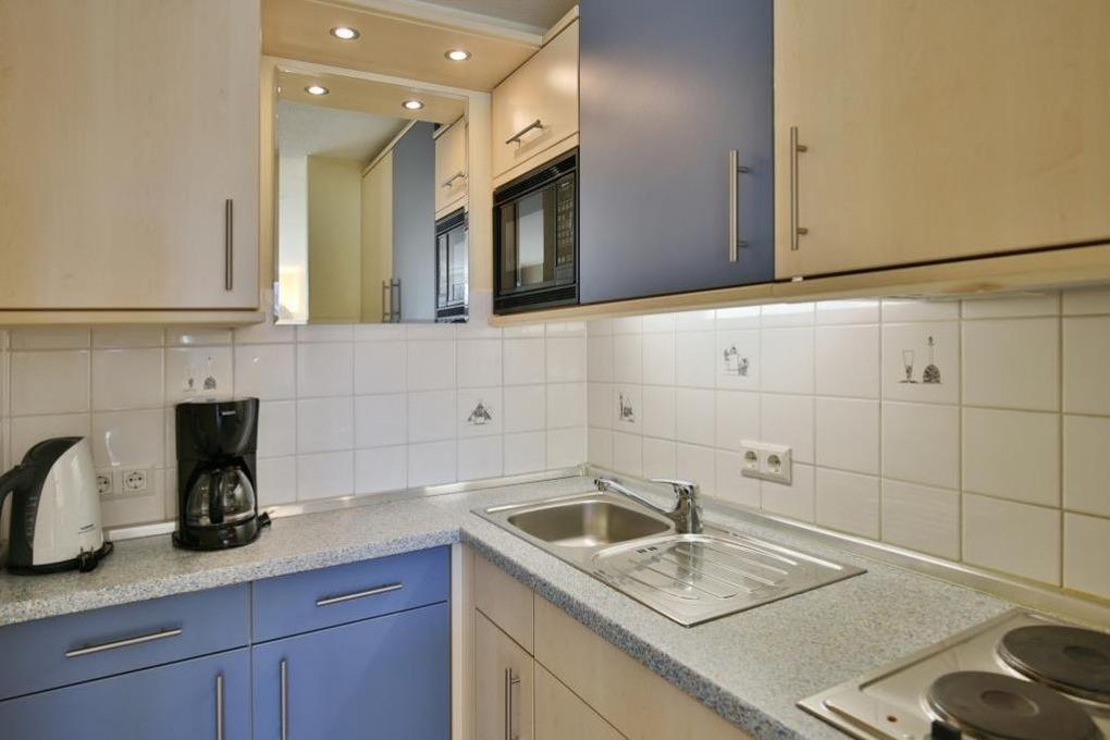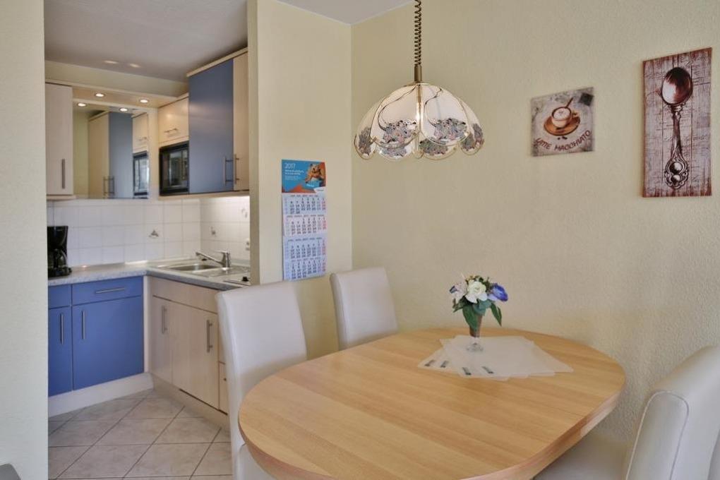 2-Raum-Wohnung auf ca. 40m², 1. Etage, komplett ausgestattet und aufwendig renoviert bis 4 Pers., 1 Schlafzimmer mit 2 Einzelbetten (1,90m), 1 kombiniertes Wohn/Schlafzimmer mit Doppelbetteckcouch, SAT-TV, kostenloses W-Lan,[nbsp][nbsp]schöne Küchenzeile mit Gefrierf. u. Mikrowelle, Dusche/WC, Flur, Balkon (west, mit Balkonmöbeln [&] Sonnenschirm, saisonabhängig), keine Haustiere, Tiefgarage.