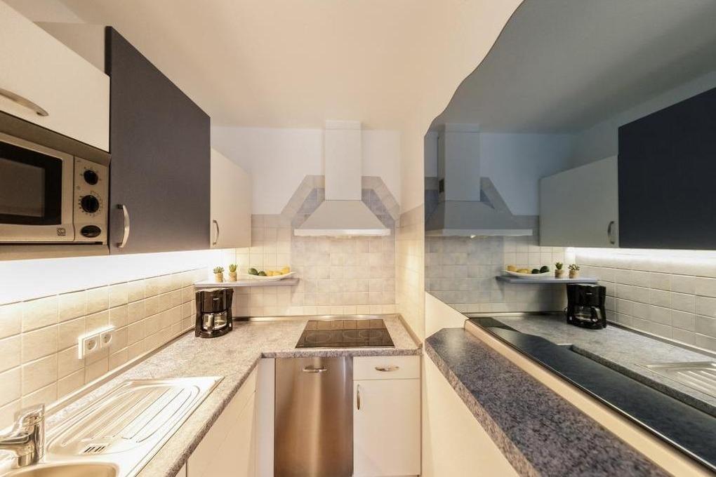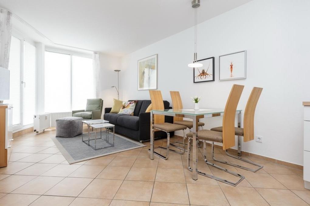 2-Raum-Wohnung auf ca. 40m², 3. Etage, sehr schön renoviert und komplett ausgestattet bis 3 Pers., 1 Schlafzimmer mit 2 Einzelbetten (2,00 m), 1 kombiniertes Wohn/Schlafzimmer mit Eckschlafcouch, Sat-TV, kostenloses W-Lan, gute Einbauküche mit Mikrowelle u. Geschirrspüler , Dusche/WC, Fön, Flur, komplett gefliest, Balkon (ost) mit Teilseesicht, keine Haustiere, Nichtraucher, Tiefgarage #305.