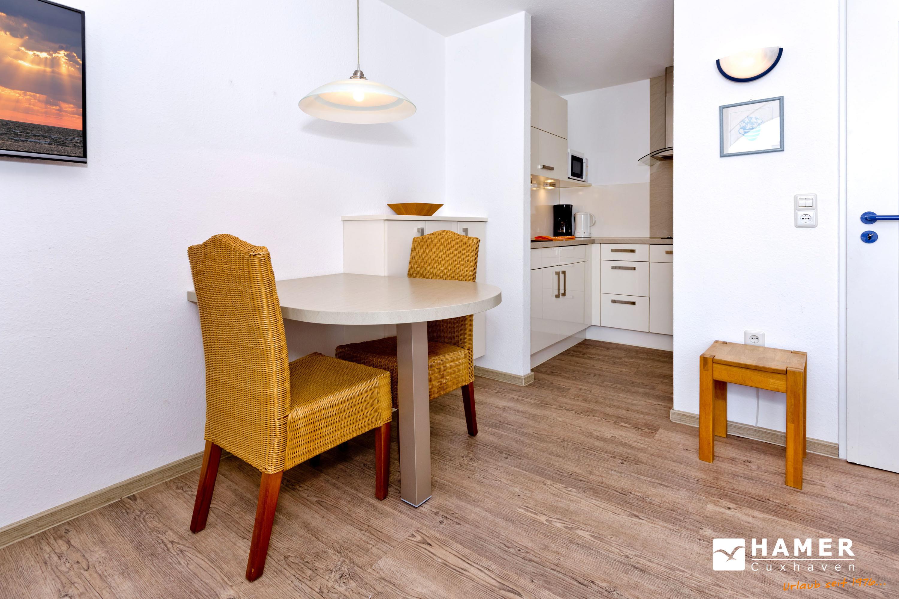 Neu renoviertes 1-Raum-Appartement auf ca. 28m², 4. Etage, komplett ausgestattet bis 2 Pers., 1 kombiniertes Wohn/Schlafzimmer mit hochwertiger Doppelbettcouch, neue Dusche/WC, SAT-TV, kostenloses W-Lan Internet, Küchenzeile mit Geschirrspüler u. Mikrowelle, Flur, Seesichtdachterrasse (ost) mit Balkonmöbeln und Sonnenschirm (saisonabhängig), keine Haustiere, reservierter Pkw-Stellplatz #405 am Haus.