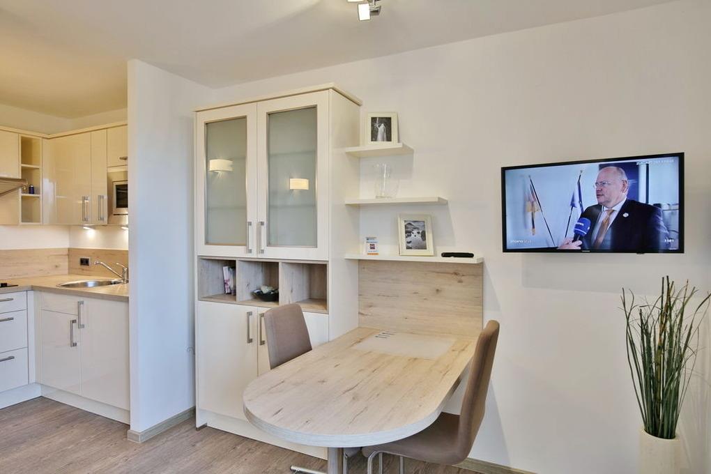 Schönes, neu renoviertes 1-Raum-Appartement auf ca. 28m², 4. Etage, Nichtraucher, komplett ausgestattet bis 2 Pers., 1 kombiniertes Wohn/Schlafzimmer mit Schlafcouch, 1 Einzelbett (0,90x2m)im Nebenraum, SAT-TV, Radio, kostenloses W-Lan,[nbsp][nbsp]Küchenzeile mit Mikrowelle/Grill, Dusche/WC, Flur, Dachterrasse (west) mit Balkonmöbeln und Sonnenschirm (saisonabhängig), Pkw-Stellplatz #406 in der Tiefgarage
