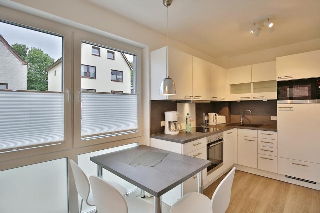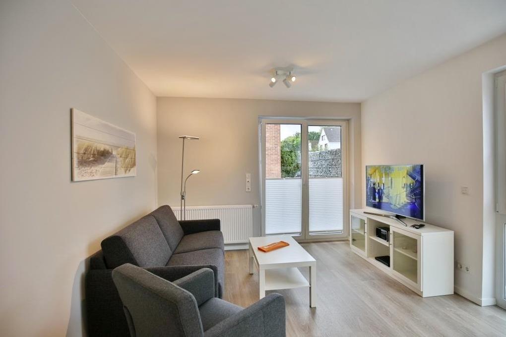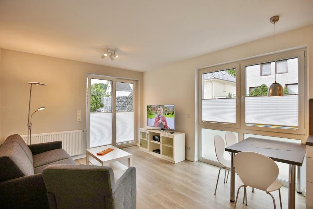 Schöne, geschmackvoll ausgestattete Wohnung auf ca. 47m² bis 3 Pers., parterre mit großer Terrasse (süd), 1 Schlafzimmer mit Doppelbett u. TV, Wohn-/Schlafzimmer mit hochwertiger Schlafcouch, TV, Blue-Ray-DVD, kostenfreies W-LAN, vollständige Küchenzeile mit Geschirrspüler, Mikrowelle, Backofen, Gefrierfach, ebenerdige Dusche/Wc, Föhn, alle Räume mit Rollladen, Nichtraucher, Pkw-Stellplatz #13, keine Haustiere gestattet. Hinweis der Eigentümer: Elektrofahrzeuge dürfen nicht am Ferienobjekt geladen werden.