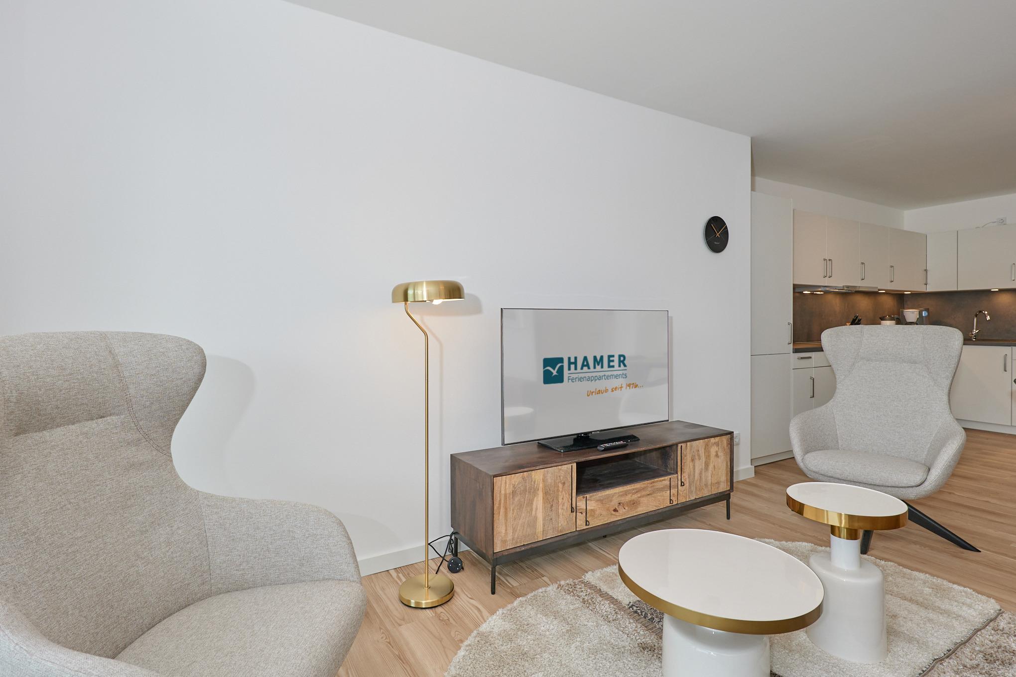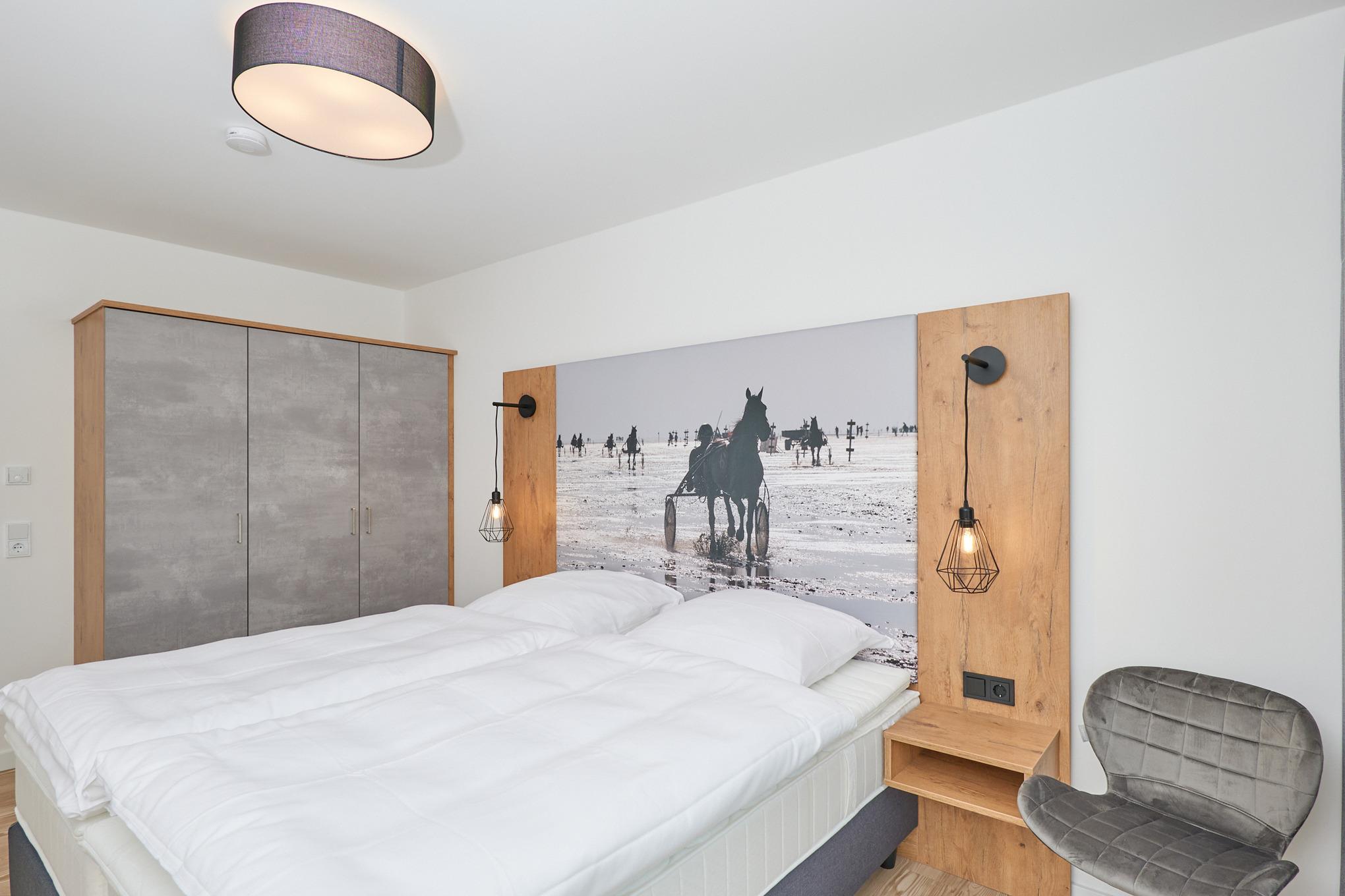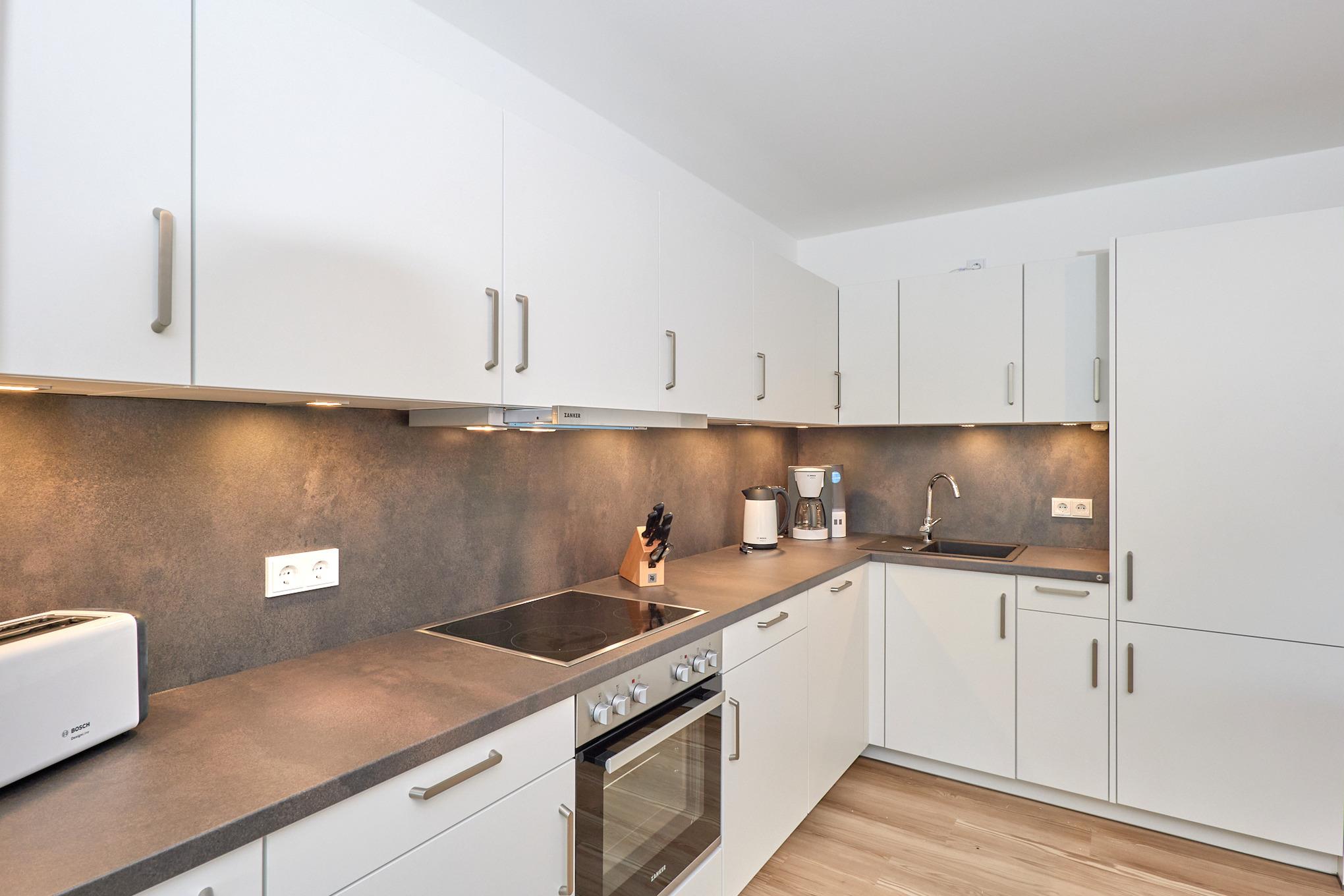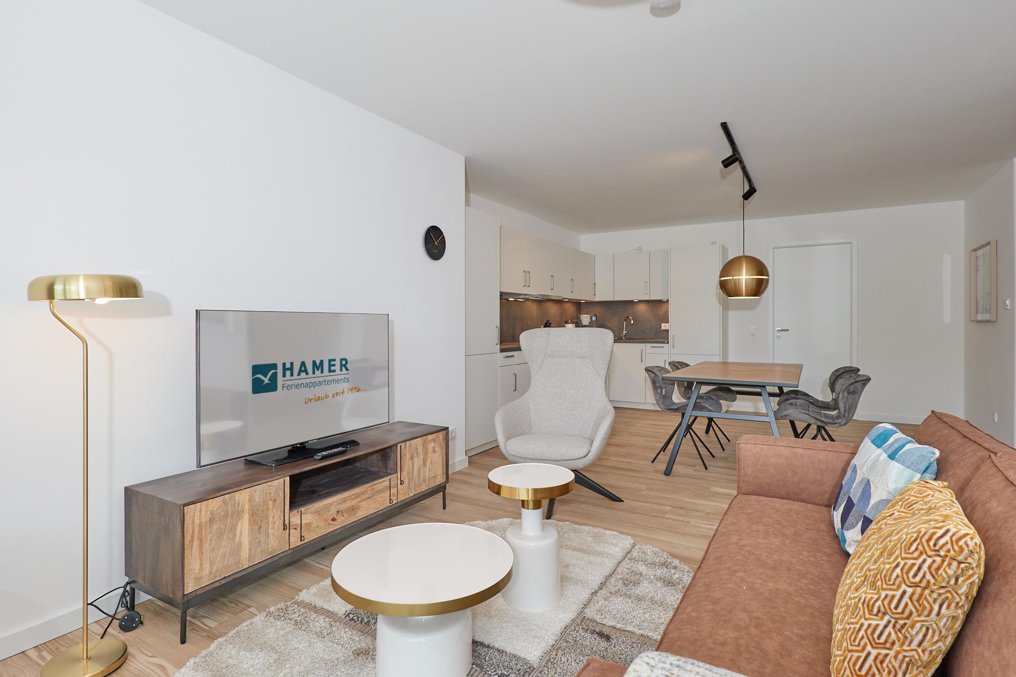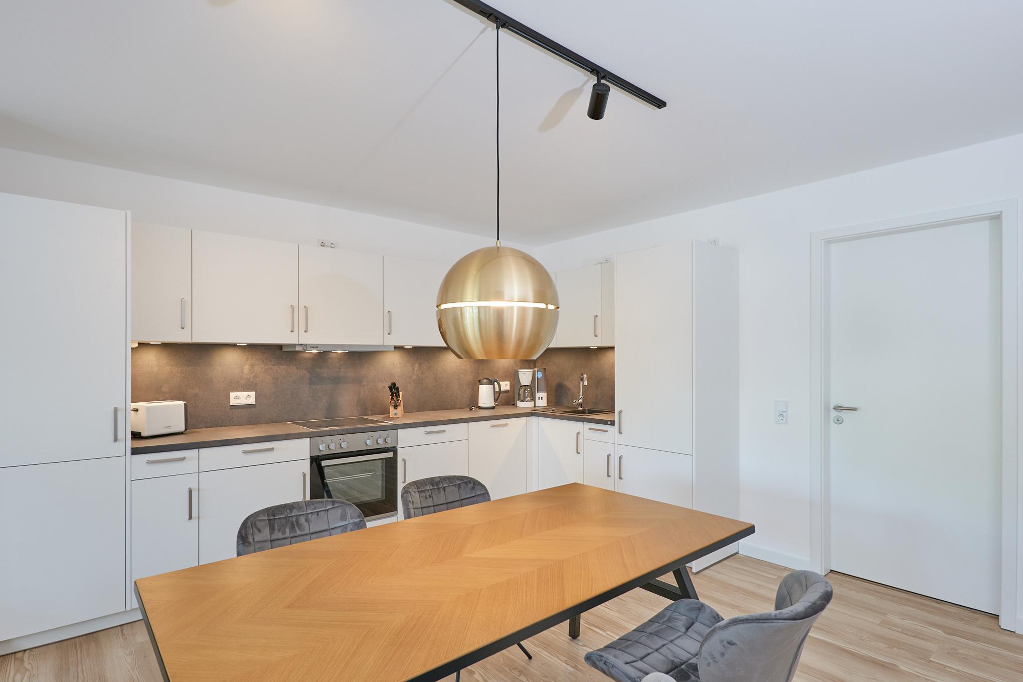Neubau Mai 2023! Sehr schöne, moderne 3-Raum-Wohnung bis 4 Pers. voll ausgestattet auf ca. 89 m² in der 2.Etage gelegen, 2 Schlafzimmer (1x Doppelbett, 1x 2 Einzelbetten) und Außenjalousien an allen Fenstern, ebenerdige Dusche/WC, Wohnzimmer mit großer Küchenzeile (Backofen, Geschirrspüler, Mikrowelle), 2x Kabel-TV, Radio, kostenfreies W-LAN-Internet, großer Balkon (west) mit Teilseesicht, Personenaufzug, reservierter Pkw-Stellplatz in der Tiefgarage inkl., es sind keine Haustiere erlaubt und natürlich Nichtraucher. Durchfahrtshöhe Tiefgarage: 2,05m.