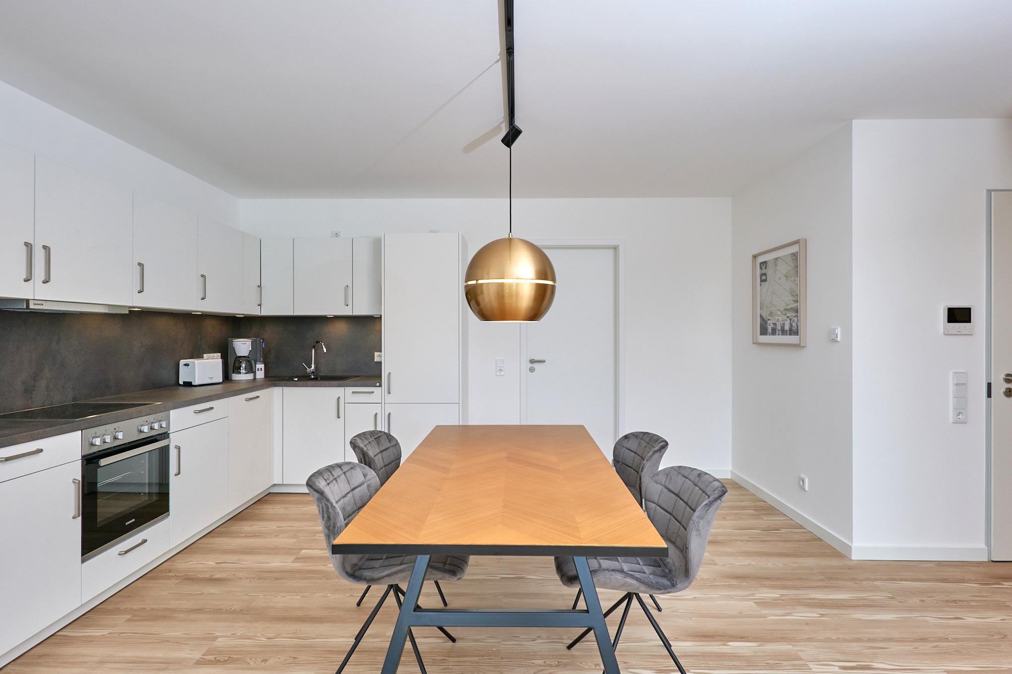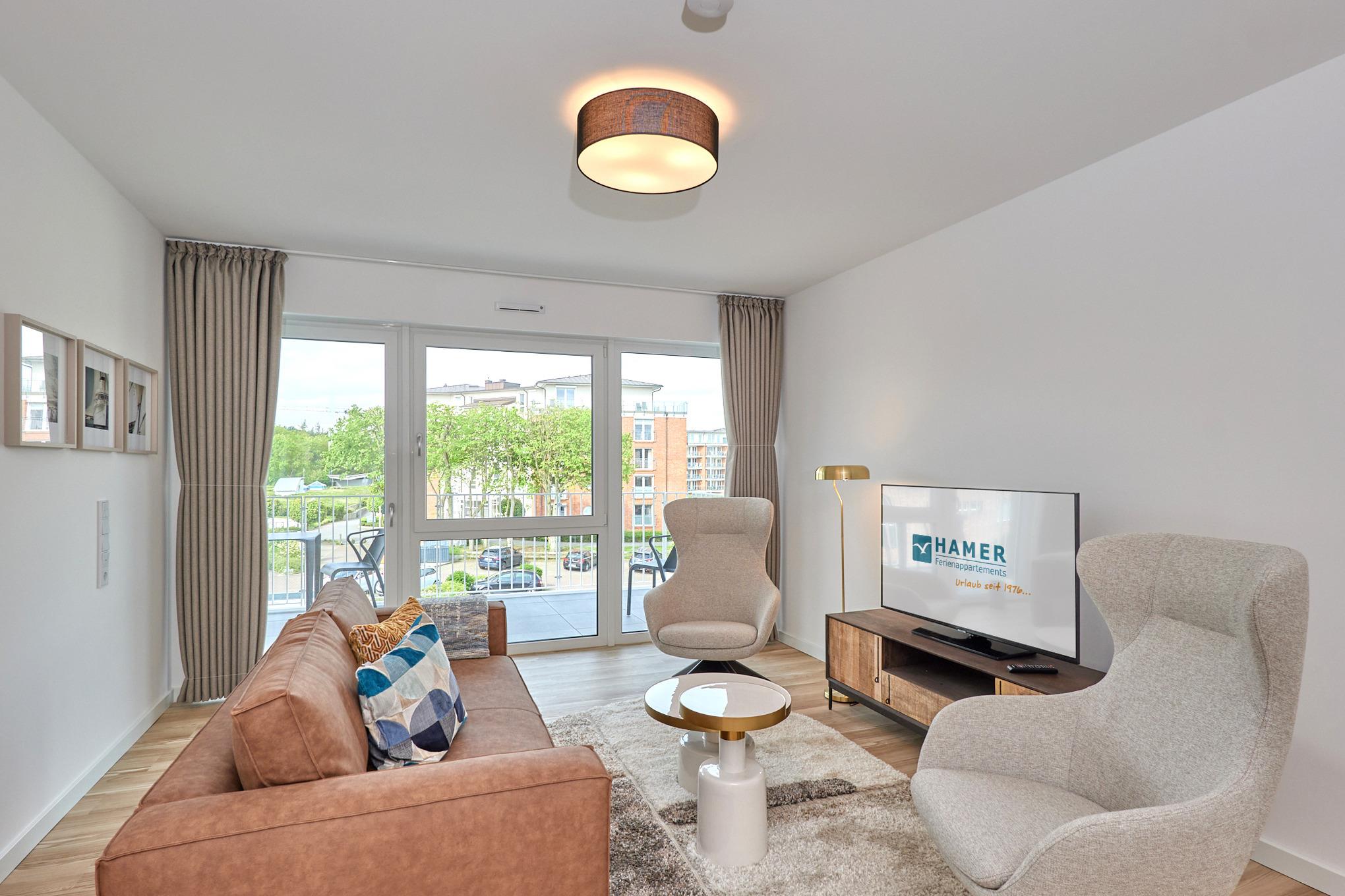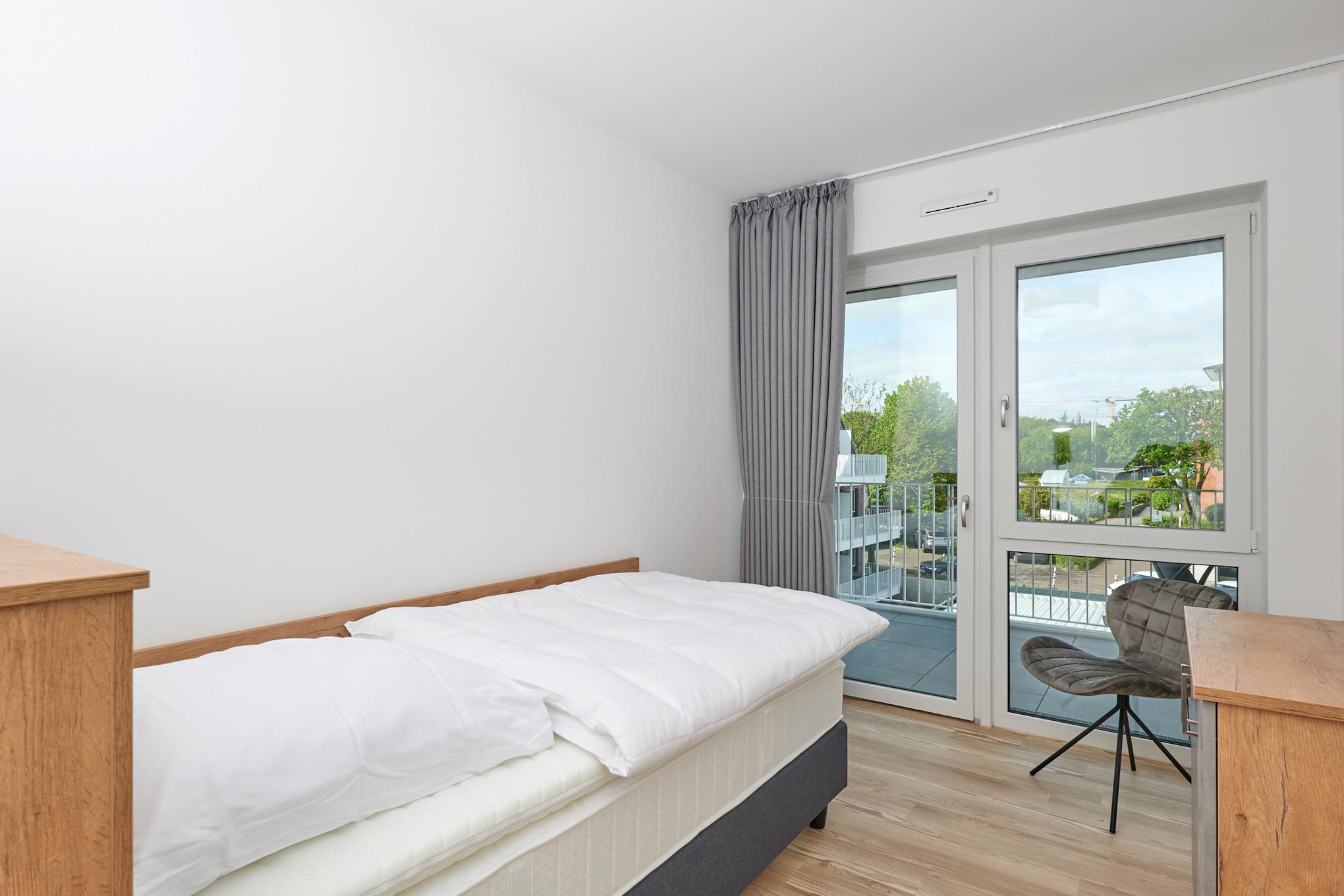 Neubau Mai 2023! Sehr schöne, moderne 3-Raum-Wohnung bis 4 Pers. voll ausgestattet auf ca. 89 m² in der 3.Etage gelegen, 2 Schlafzimmer (1x Doppelbett, 1x 2 Einzelbetten) und Außenjalousien an allen Fenstern, ebenerdige Dusche/WC, Wohnzimmer mit großer Küchenzeile (Backofen, Geschirrspüler, Mikrowelle), 2x Kabel-TV, Radio, kostenfreies W-LAN-Internet, großer Balkon (west) mit Teilseesicht, Personenaufzug, reservierter Pkw-Stellplatz in der Tiefgarage inkl., es sind keine Haustiere erlaubt und natürlich Nichtraucher. Durchfahrtshöhe Tiefgarage: 2,05m.