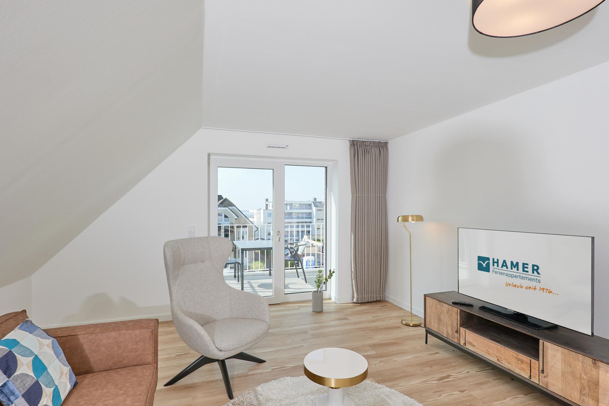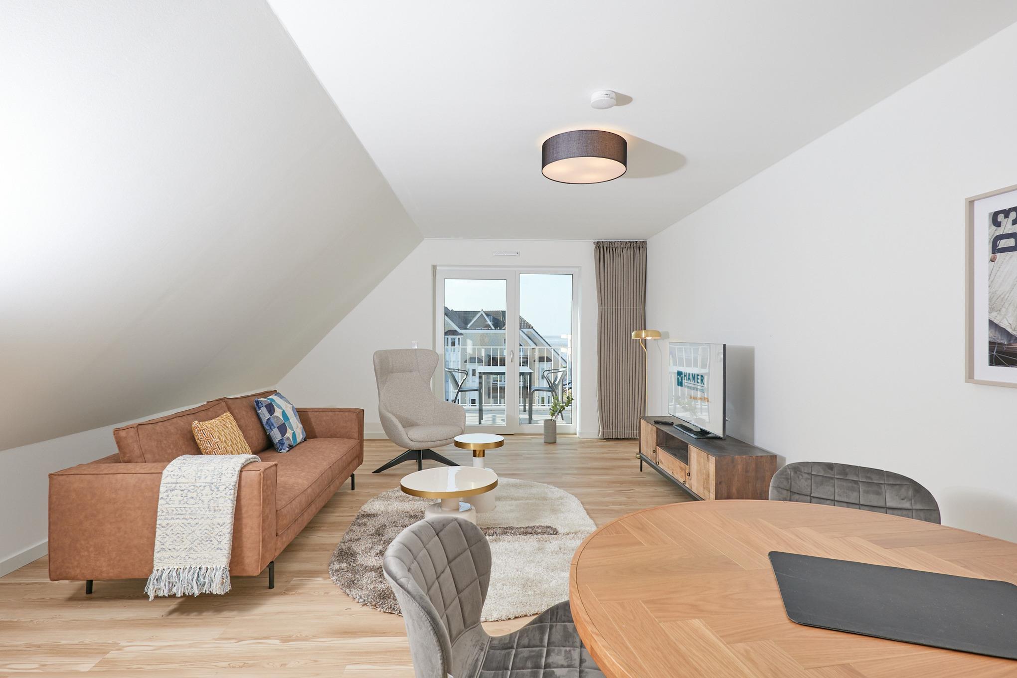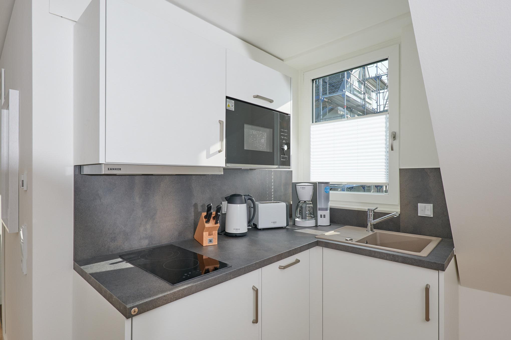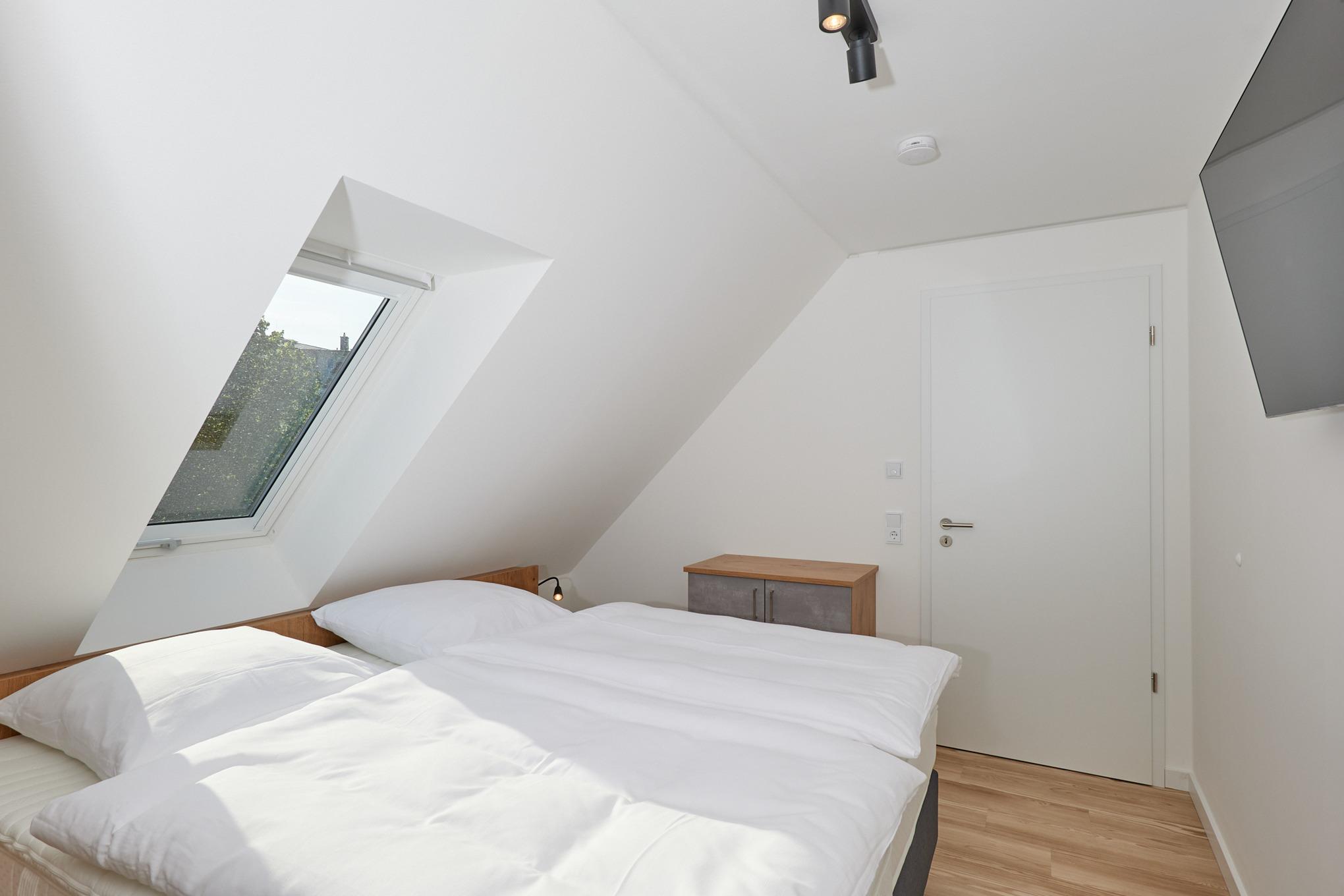 Neubau Mai 2023! Sehr schöne, moderne 2-Raum-Wohnung bis 2 Pers. voll ausgestattet auf ca. 49 m² in der 3.Etage gelegen, 1 Schlafzimmer mit komfortablen Doppelbett (Bettwäsche inkl.) und Außenjalousien an allen Fenstern (Veluxfenster mit Rollo innen), ebenerdige Dusche/WC, Wohnzimmer mit Küchenzeile (2 Platte, Mikrowelle/Backkombi, Geschirrspüler) 2x Kabel-TV, Radio, kostenfreies W-LAN-Internet, großer Balkon mit Teilseesicht (nord/west), beide Zimmer mit Dachschrägen, Personenaufzug, die Wohnung ist barrierefrei erreichbar, reservierter Pkw-Stellplatz in der Tiefgarage inkl., es sind keine Haustiere erlaubt und natürlich Nichtraucher. Durchfahrtshöhe Tiefgarage: 2,05m.