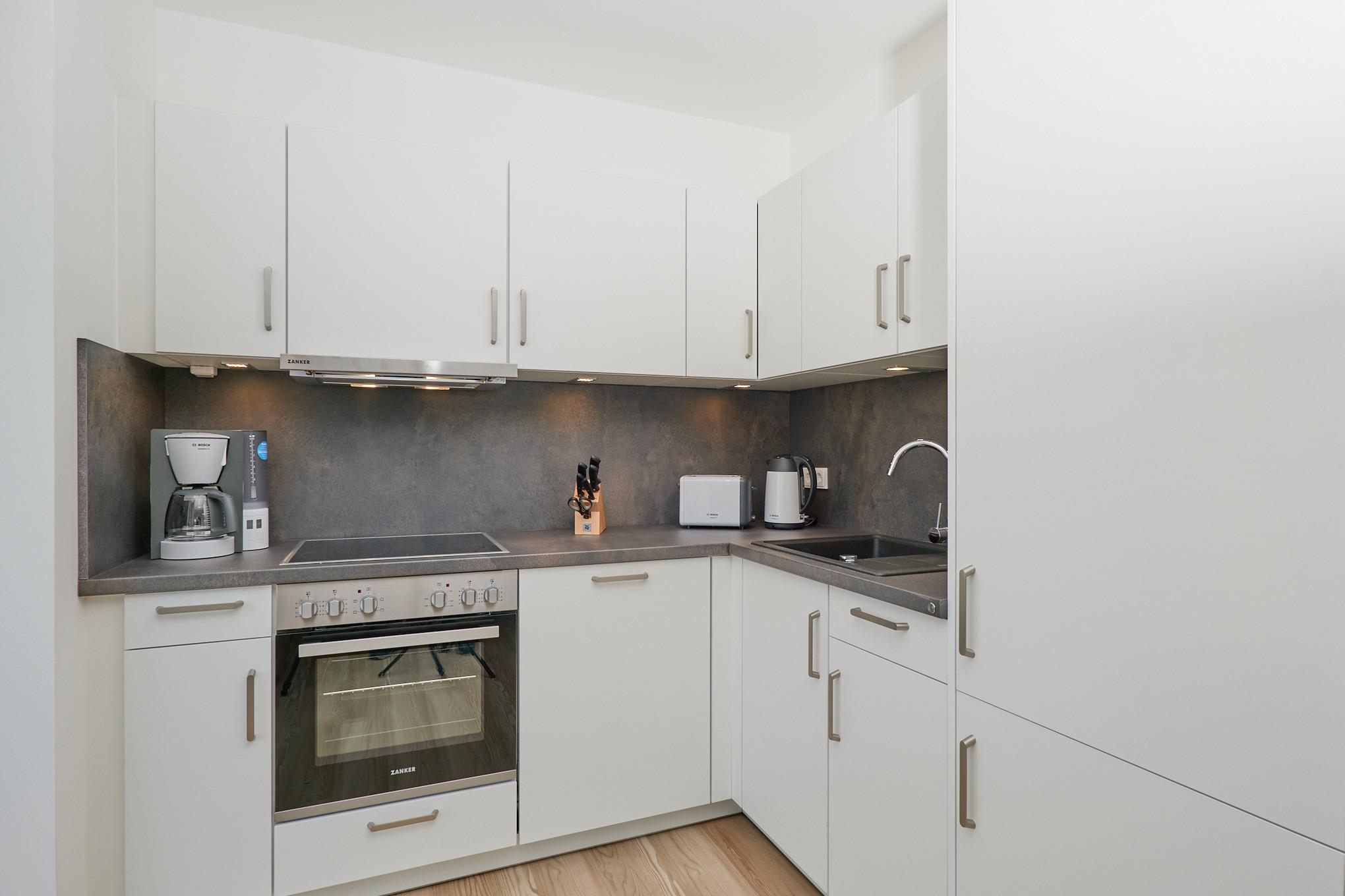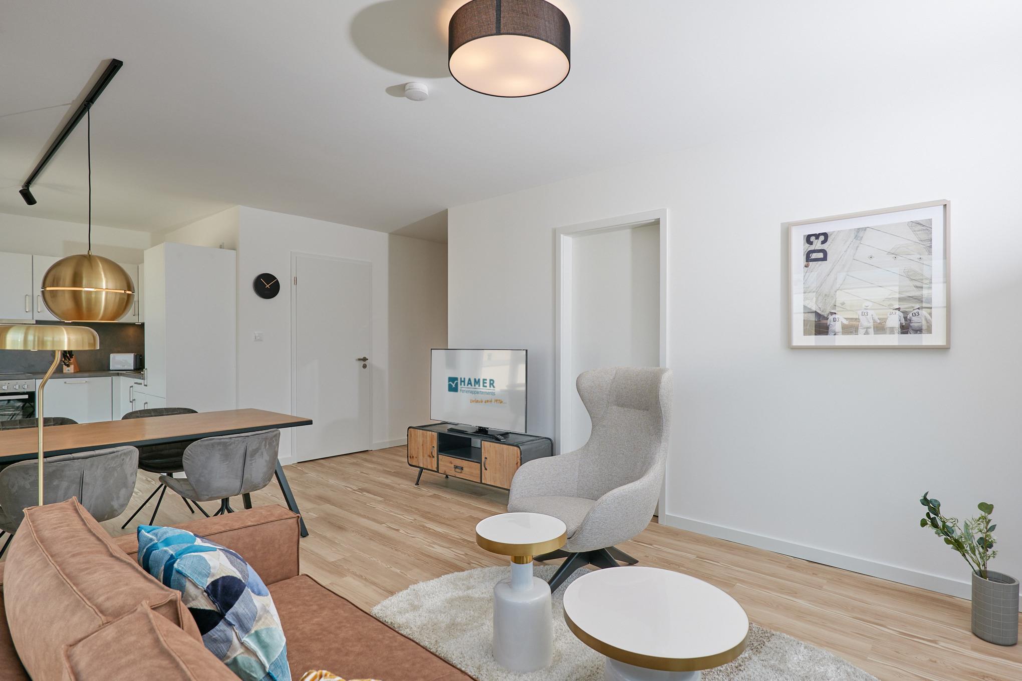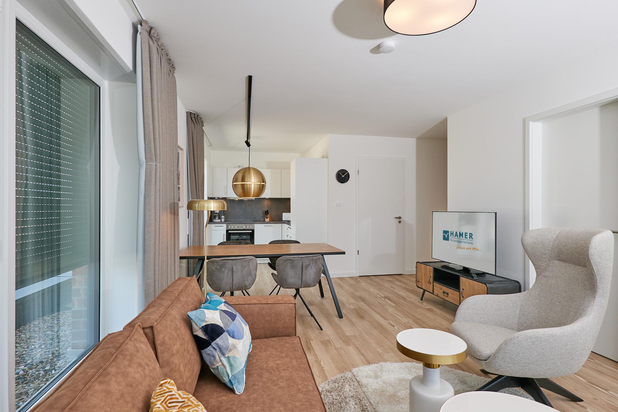 Neubau Mai 2023! Sehr schöne, moderne 3-Raum-Wohnung bis 4 Pers. voll ausgestattet auf ca. 87 m² in der 3.Etage gelegen, 2 Schlafzimmer (1x Doppelbett, 1x 2 Einzelbetten) und Außenjalousien an allen Fenstern, ebenerdige Dusche/WC, Wohnzimmer mit großer Küchenzeile (Backofen, Geschirrspüler, Mikrowelle) und Teilseesicht, 2x Kabel-TV, Radio, kostenfreies W-LAN-Internet, großer Balkon (west) mit Teilseesicht, Personenaufzug, reservierter Pkw-Stellplatz in der Tiefgarage inkl., es sind keine Haustiere erlaubt und natürlich Nichtraucher. Durchfahrtshöhe Tiefgarage: 2,05m.