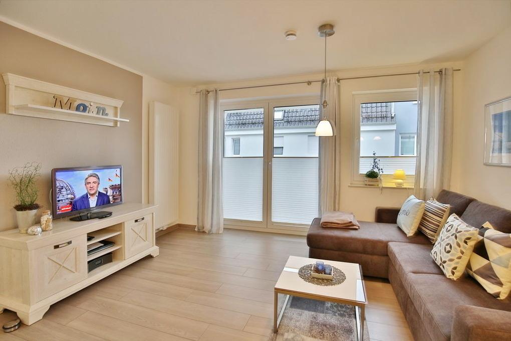 Schöne, vollständig ausgestattete Wohnung für 3 Pers., komplett mit hellen Bodenfliesen in Parkett-Optik, 1. Etage auf ca. 46 m²,[nbsp][nbsp]großer Süd-Balkon mit Balkonmöbeln und Sonnenschirm (saisonabhängig), 1 Schlafzi. mit Doppelbett, Wohn-/Schlafzi. mit Schlafcouch, teilweise mit Insektenschutz, 2x Sat-TV, W-LAN kostenlos., große Komfort-Küchenzeile (Geschirrspüler, Backofen, Mikrowelle, sep. Gefrierfach), Dusche mit bequemer Sitzfläche, Föhn, Kosmetikspiegel, Rollläden, breiter Pkw-Stellplatz #5, Nichtraucher, keine Haustiere