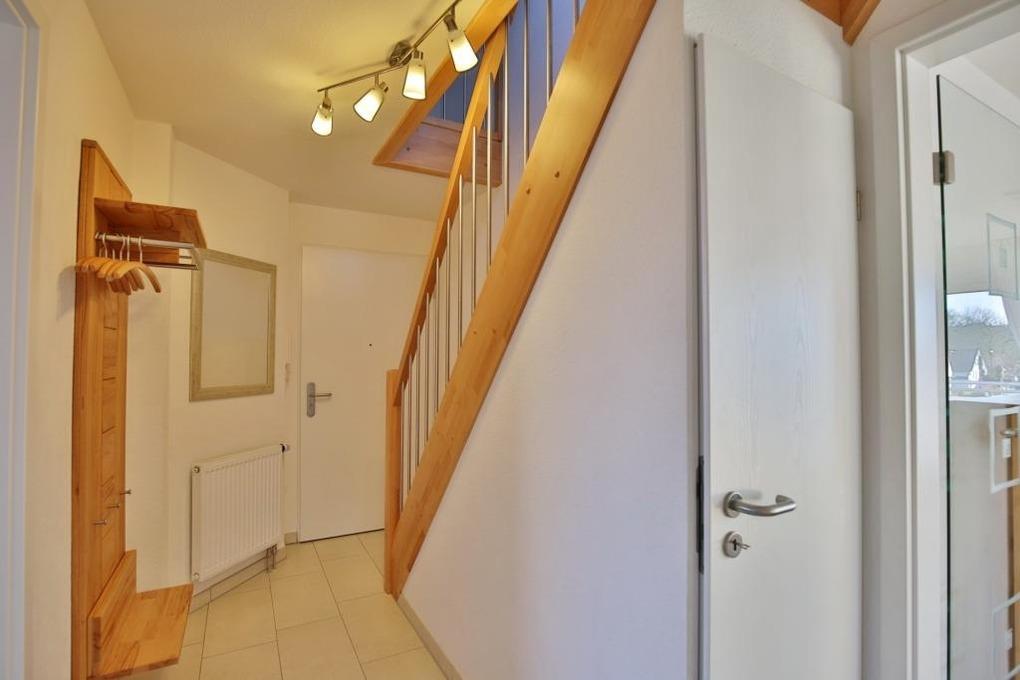 Sehr schöne, helle 3-Raum-Maisonette-Wohnung (58m²) bis 4 Pers., 2.Etage, 1 Schlafzimmer mit Doppelb., 1 Schlafzimmer im Dachgeschoss mit Einzelbetten, Du/Wc u. Gäste-Wc, teilweise mit Insektenschutz, Föhn, Wohnzimmer mit vollständiger Küchenzeile (Gefrierfach, Back., Mikrow., Geschirrspüler) 2xSAT-TV, Stereo, W-LAN kostenlos, großer Balkon (süd), Rollläden, Pkw-Stellplatz #9, keine Haustiere erlaubt, Nichtraucher.