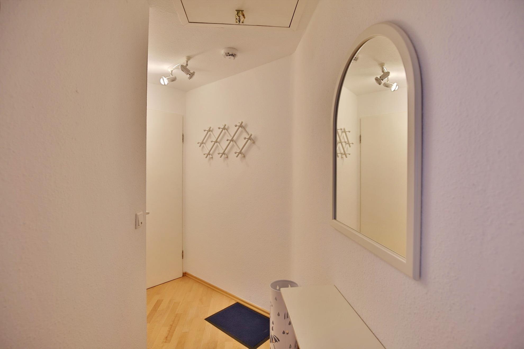 Zentral gelegene 2-Raum-Wohnung in der 1. Etage, ca. 35m², komplett ausgestattet bis 2 Pers., 1 Schlafzimmer mit Doppelbett, 1 Wohnzimmer mit kleinem West-Balkon, Küchenzeile (Backofen, Geschirrspüler und Mikrowelle), Kabel-TV, DVD-Player, Radio, Du/WC, Flur, keine Haustiere, Nichtraucher, allergikergerecht, reservierter Pkw-Stellplatz #12 auf dem Außengelände.
