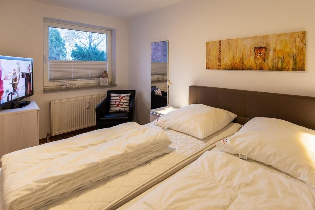 2-Raum-Parterrewohnung mit ca. 52m². Komplett ausgestattet bis 4 Pers. Wohnzimmer mit Küchenzeile vollausgestatter Küchenzeile (Geschirrspüler, Backofen etc.), Doppelbettcouch und Zugang zur Terrasse (west), Kabel-TV, W-Lan kostenfrei. 1 Schlafzimmer mit Doppelbett [&] TV, Du/WC, keine Haustiere, Nichtraucher, reservierter Pkw-Stellplatz #13 vor dem Haus.