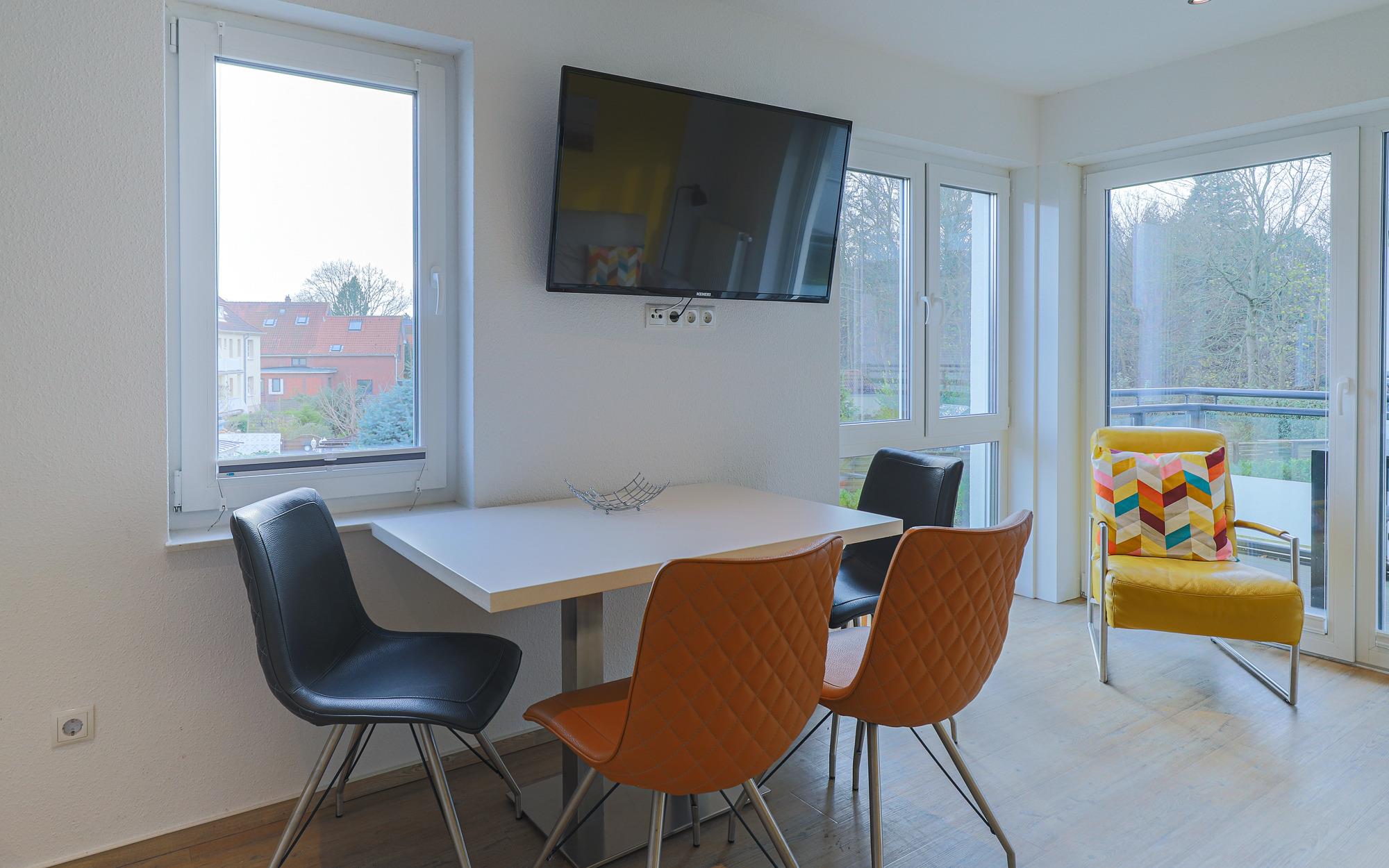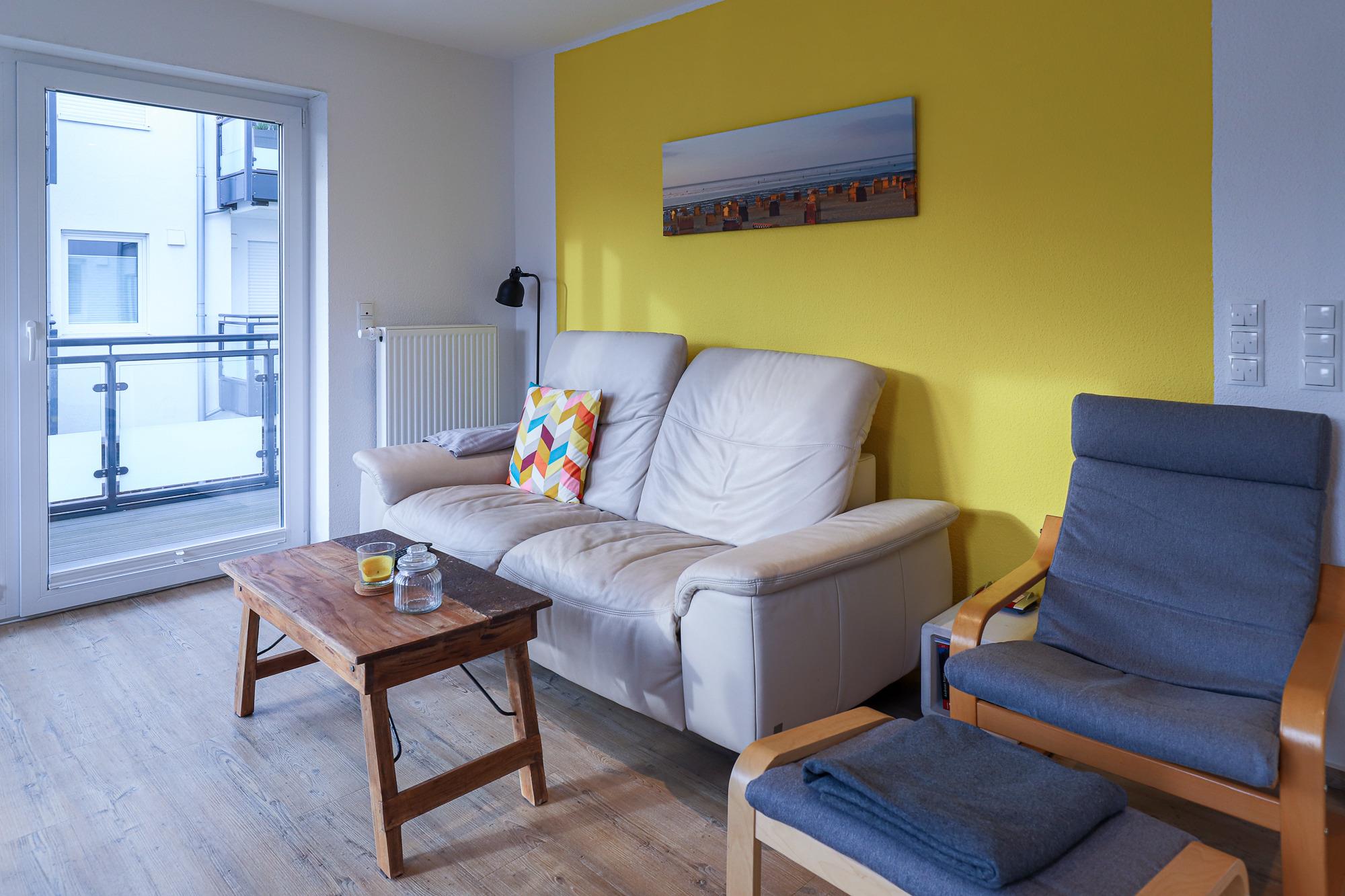 Der Wohn-, Ess- und Küchenbereich der Wohnung ist nicht nur hell, sondern auch gemütlich und geschmackvoll eingerichtet. Hier können Sie sich nach einem ereignisreichen Tag am Strand oder bei Ausflügen wunderbar entspannen. Vom Wohnbereich gelangen Sie zudem auf den großartigen Balkon, der mit komfortablen Sitzmöbeln ausgestattet ist. Genießen Sie hier die frische Nordseeluft und lassen Sie Ihre Seele baumeln.