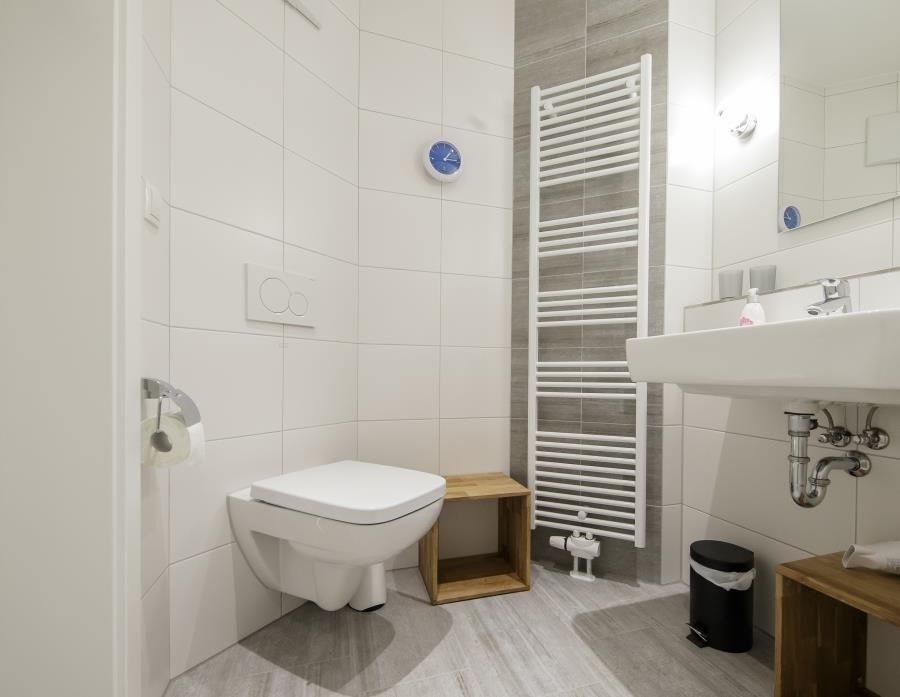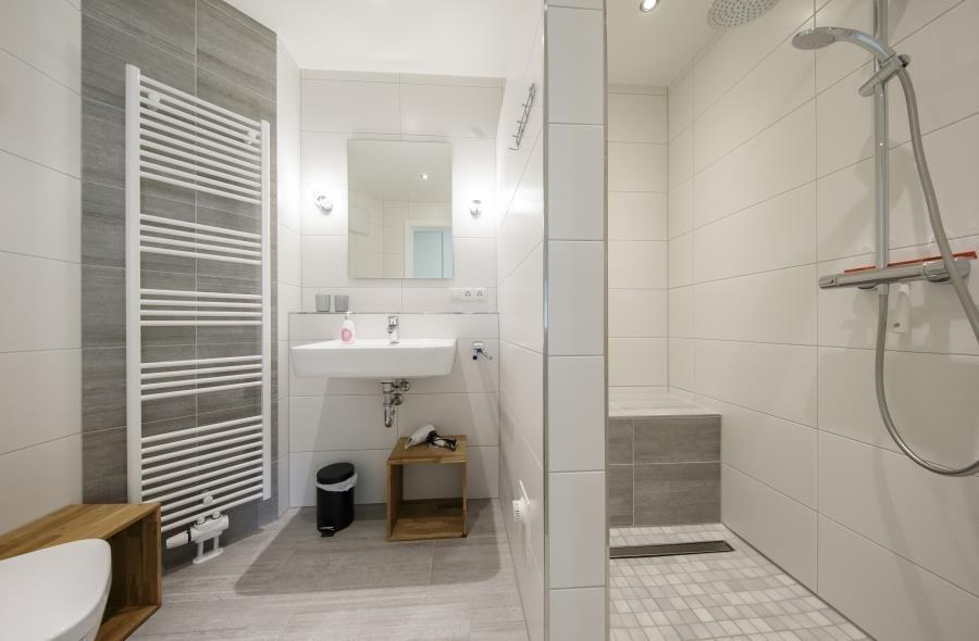 Das Badezimmer ist mit einer ebenerdigen Dusche ausgestattet, die über eine Sitzbank verfügt. Somit ist auch für Menschen mit eingeschränkter Mobilität ein komfortables Duscherlebnis gewährleistet. Selbstverständlich steht Ihnen auch ein WC zur Verfügung.