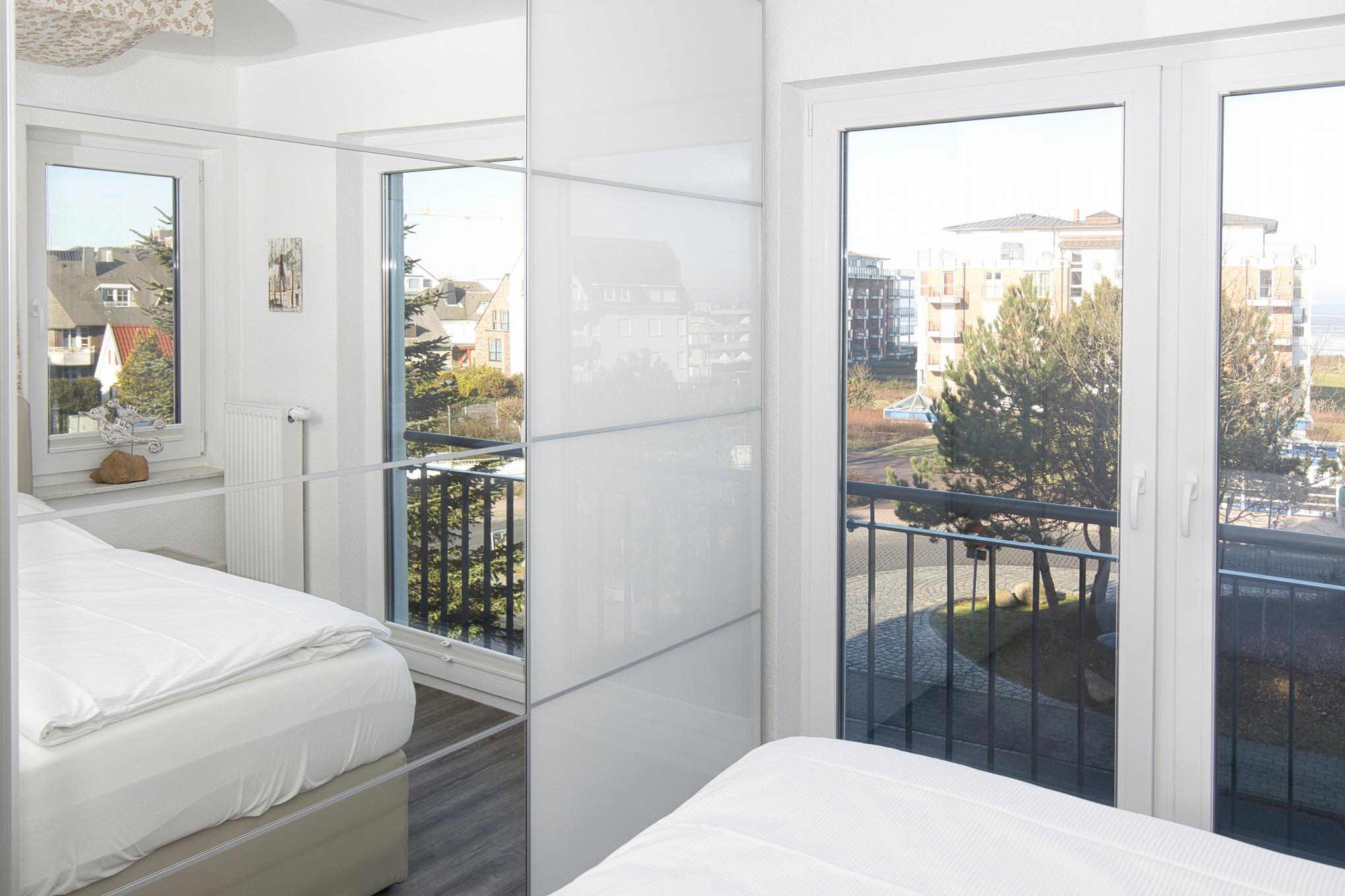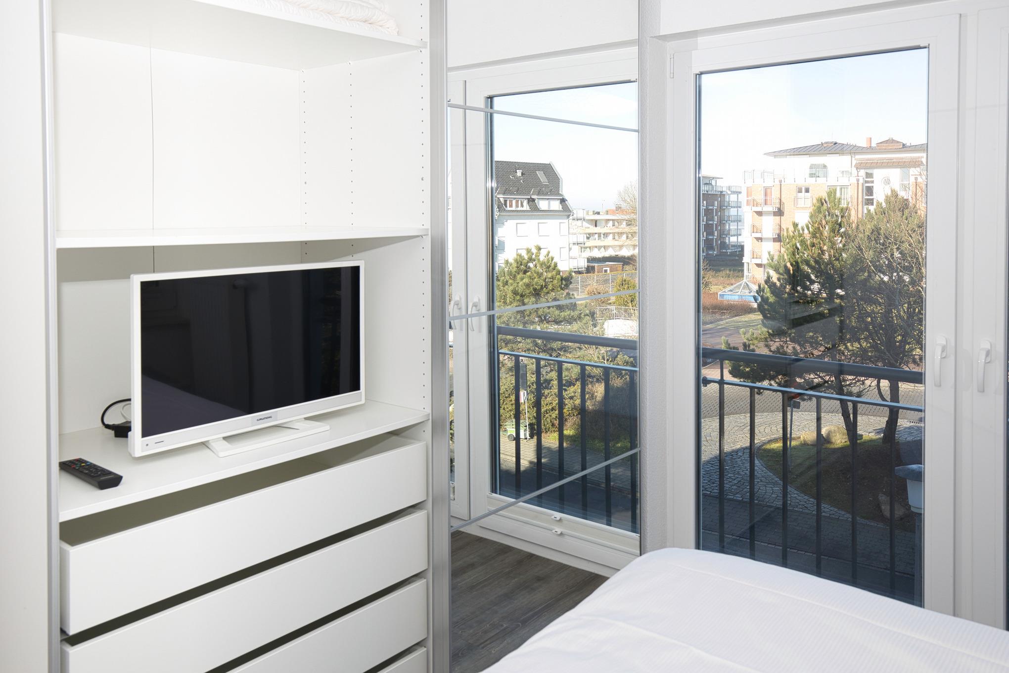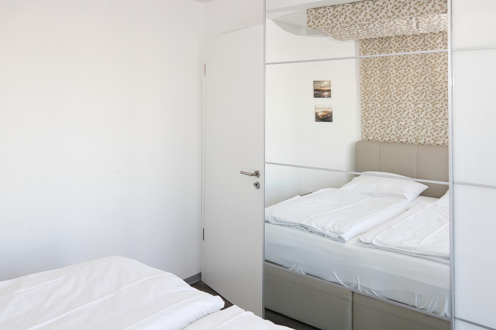 Der Schlafbereich verfügt über bequeme Betten und einen geräumigen Kleiderschrank mit einem zusätzlichen Fernseher für Ihre Unterhaltung. Eine schallgedämmte Wohnungs-Eingangstür gewährleistet Ihre Privatsphäre und Ruhe. Das Duschbad mit WC und Handtuchhalter bietet Ihnen Komfort und Funktionalität.