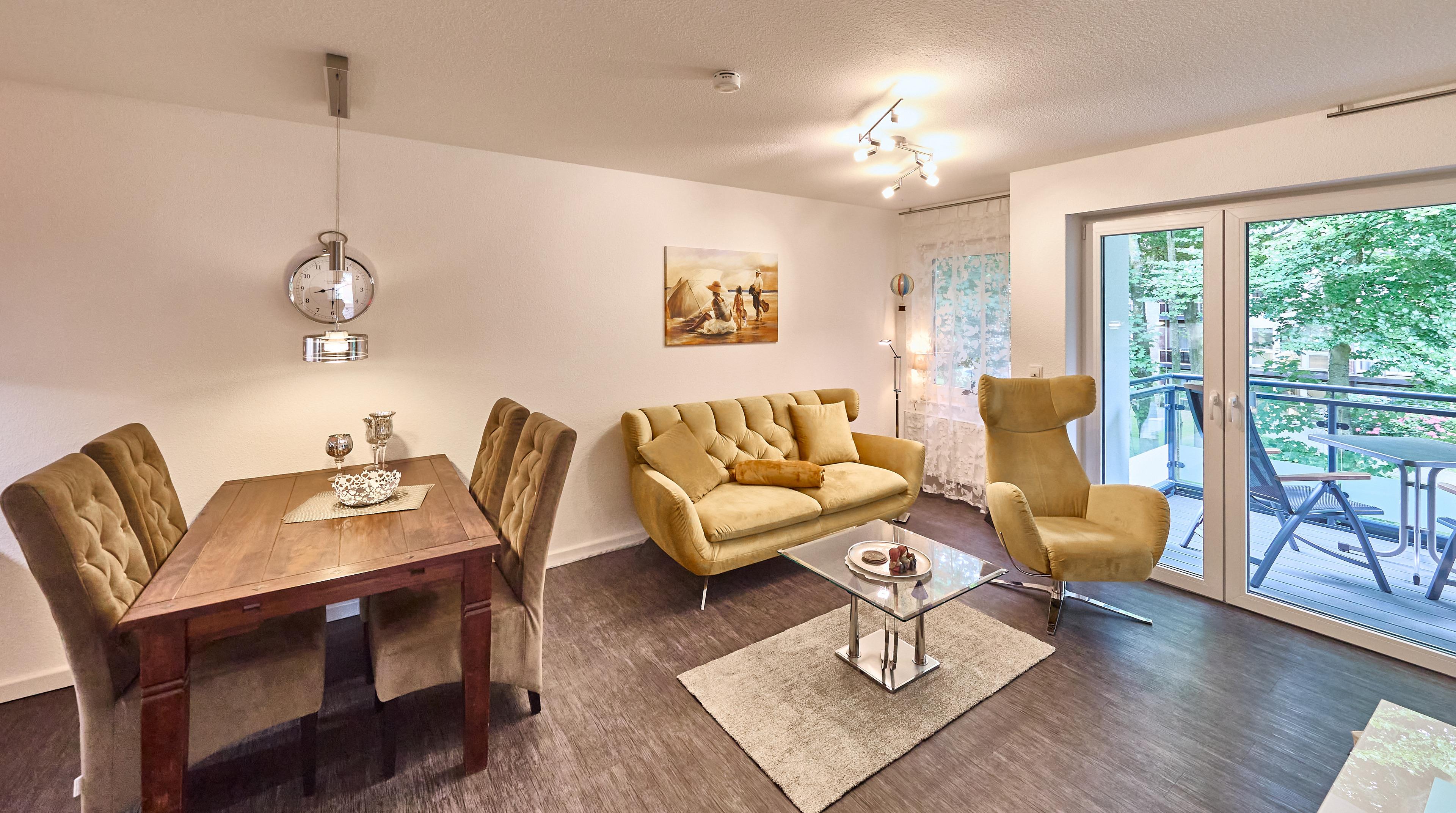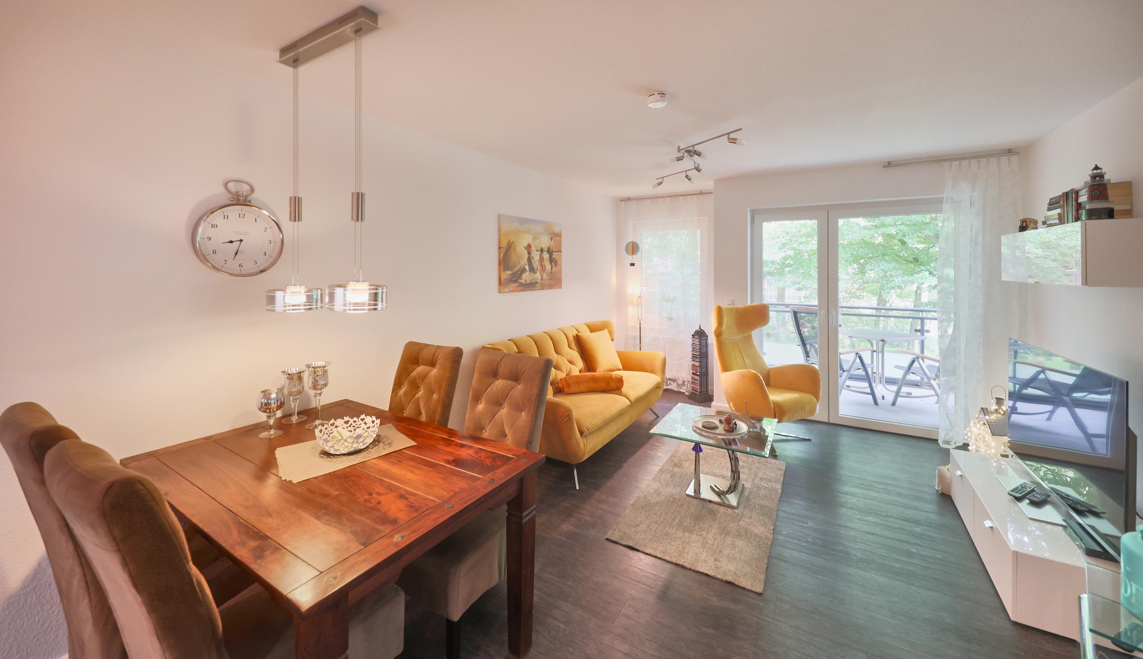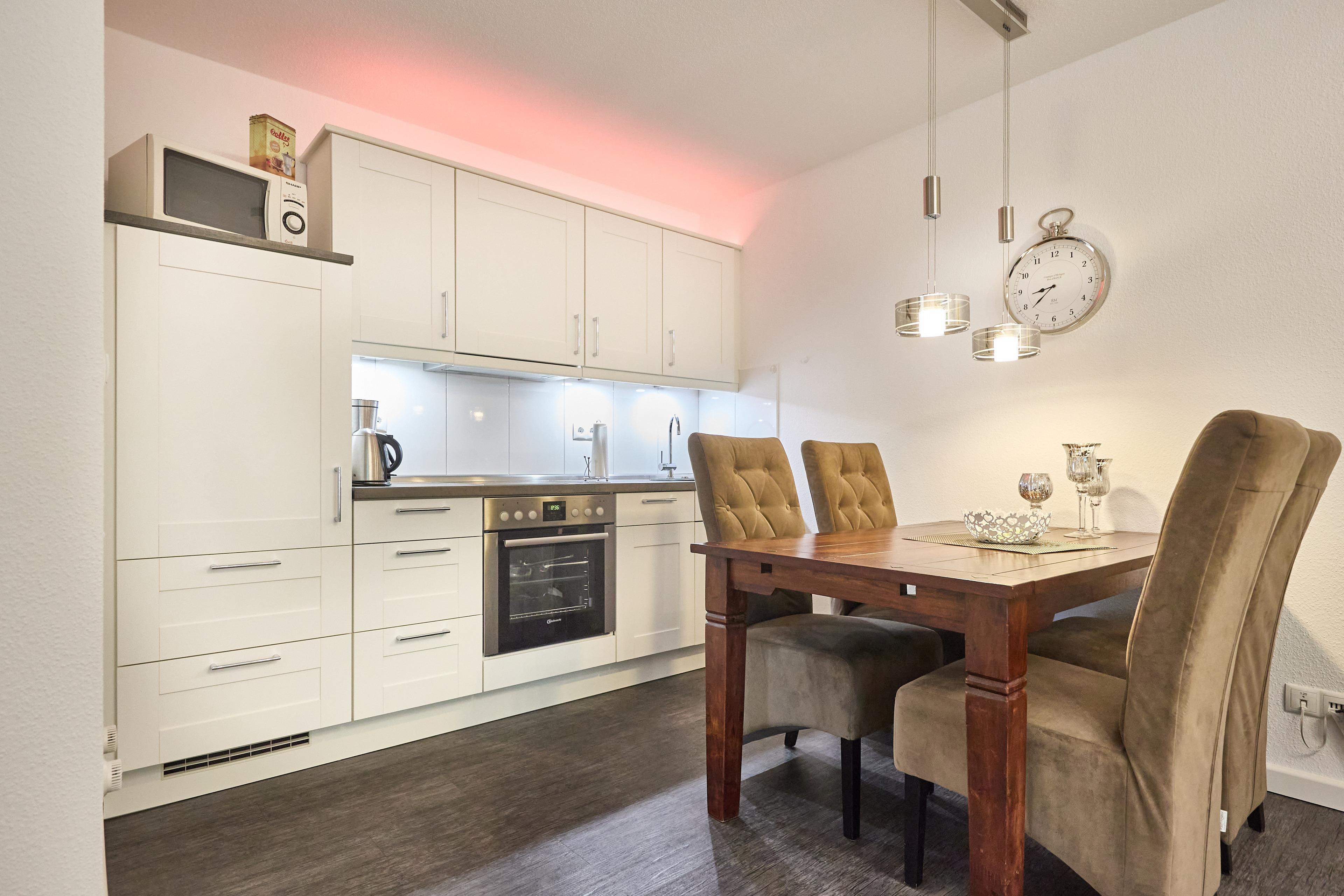 Der Wohn-, Küchen- und Essbereich ist mit einer komfortablen Einbauküche inklusive Geschirrspüler ausgestattet. Der Esstisch mit 4 Stühlen lädt zum gemeinsamen Mahl ein, während das Sofa mit einem Sessel zum Entspannen einlädt. Vom Wohnbereich aus gelangen Sie auf den Balkon, der Ihnen ebenfalls eine kleine Aussicht auf das Meer bietet und am Strandpalais Duhnen vorbeiführt.