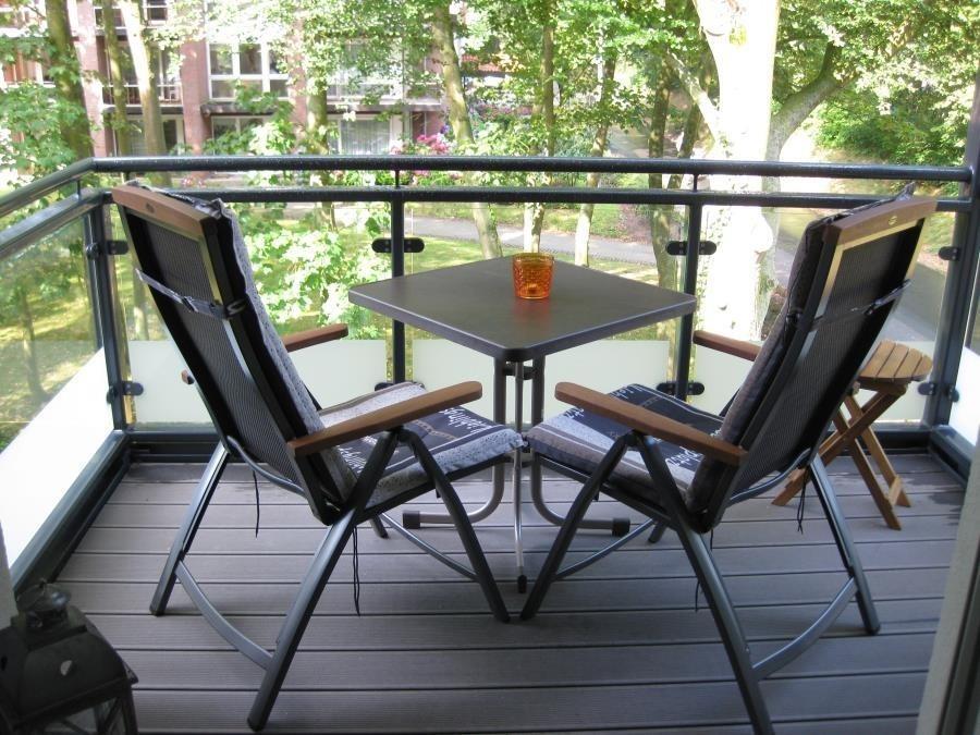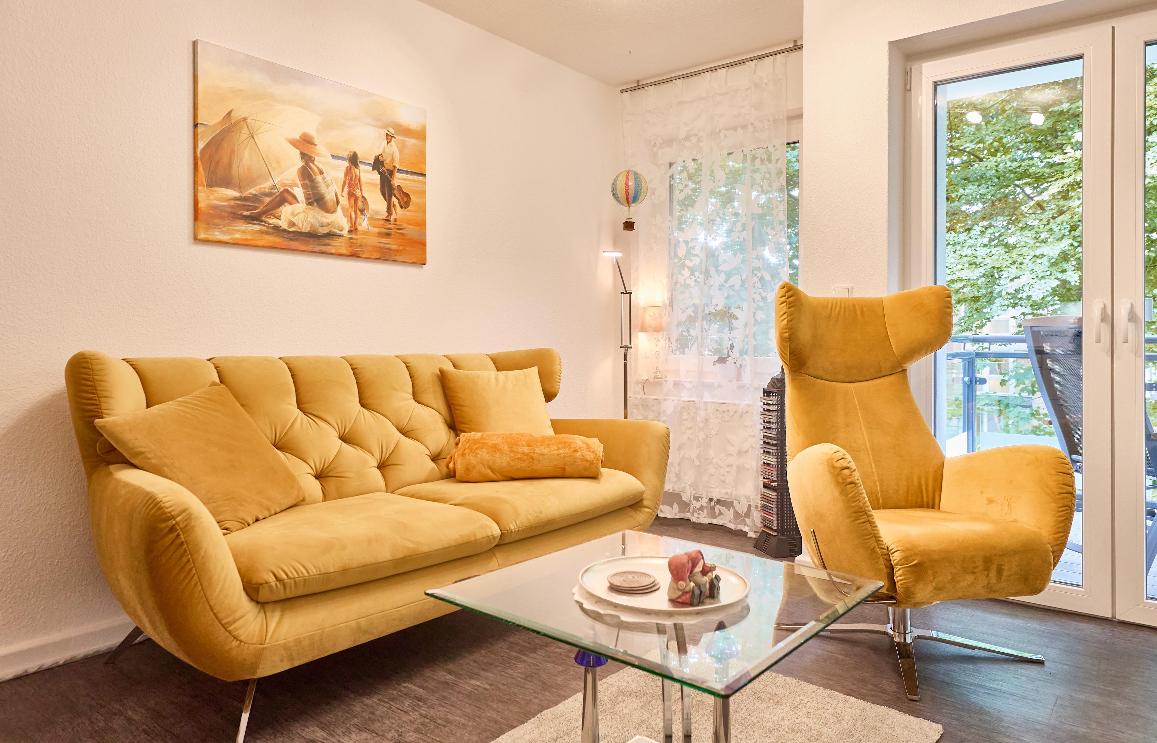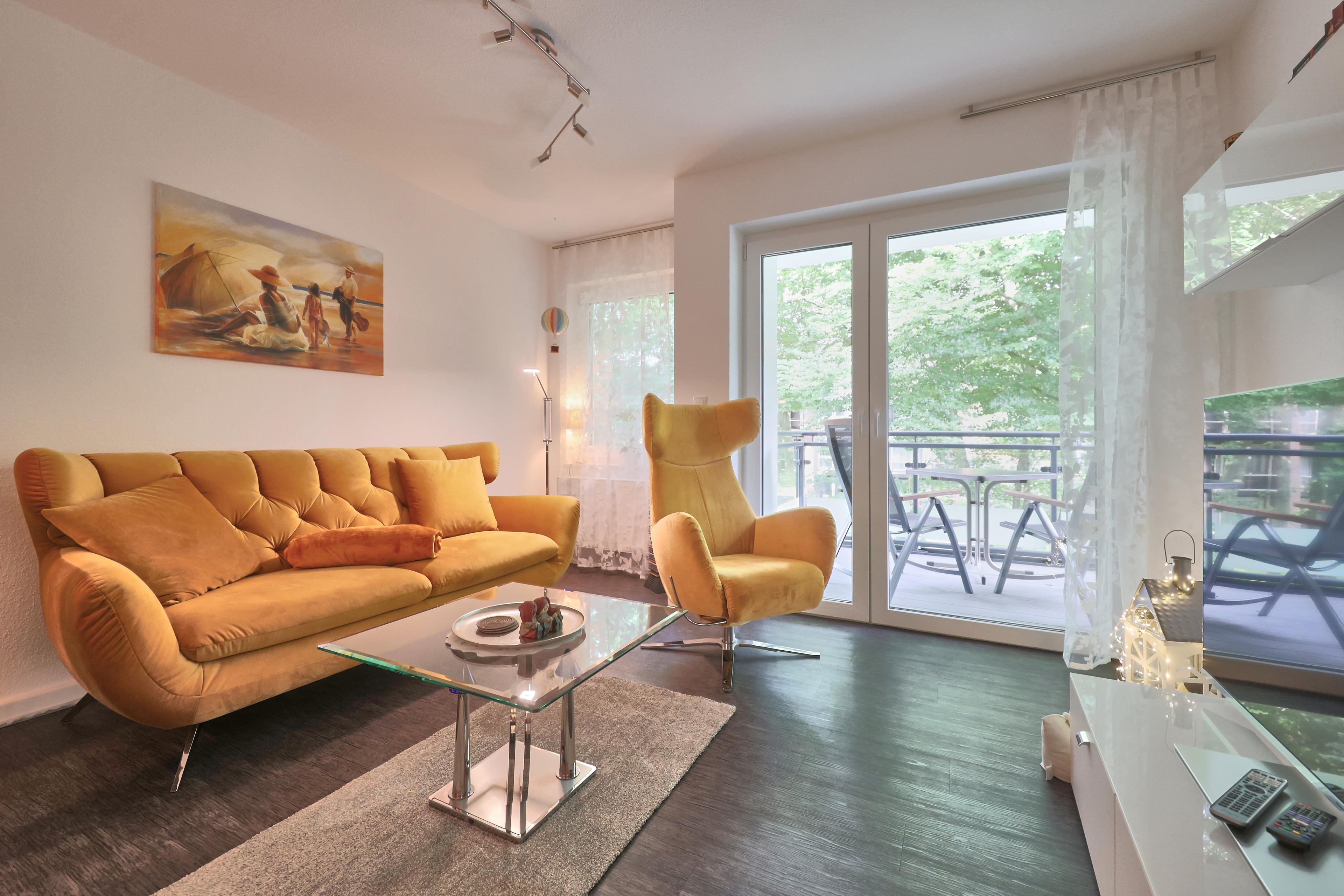 Der Wohn-, Küchen- und Essbereich ist mit einer komfortablen Einbauküche inklusive Geschirrspüler ausgestattet. Der Esstisch mit 4 Stühlen lädt zum gemeinsamen Mahl ein, während das Sofa mit einem Sessel zum Entspannen einlädt. Vom Wohnbereich aus gelangen Sie auf den Balkon, der Ihnen ebenfalls eine kleine Aussicht auf das Meer bietet und am Strandpalais Duhnen vorbeiführt.