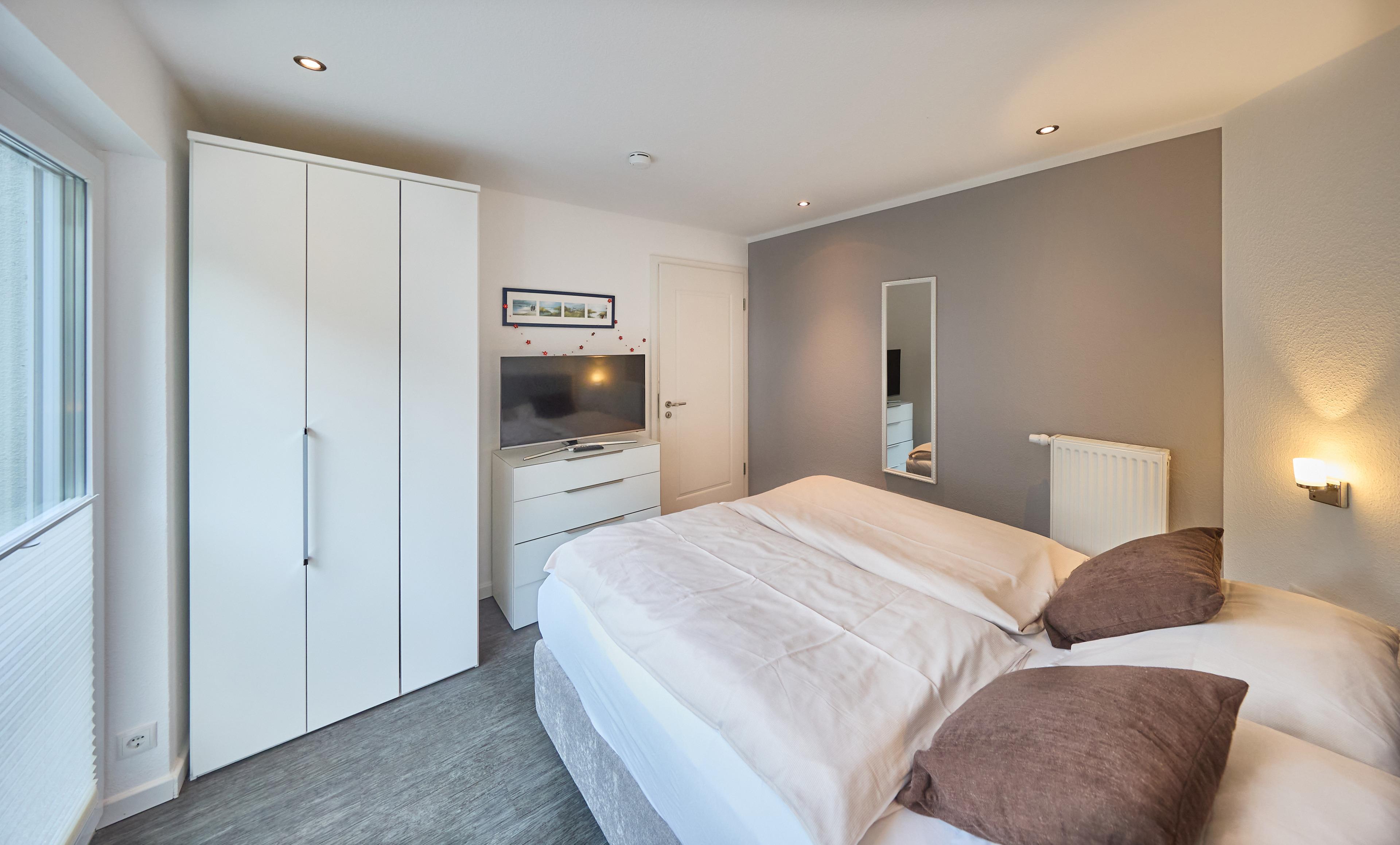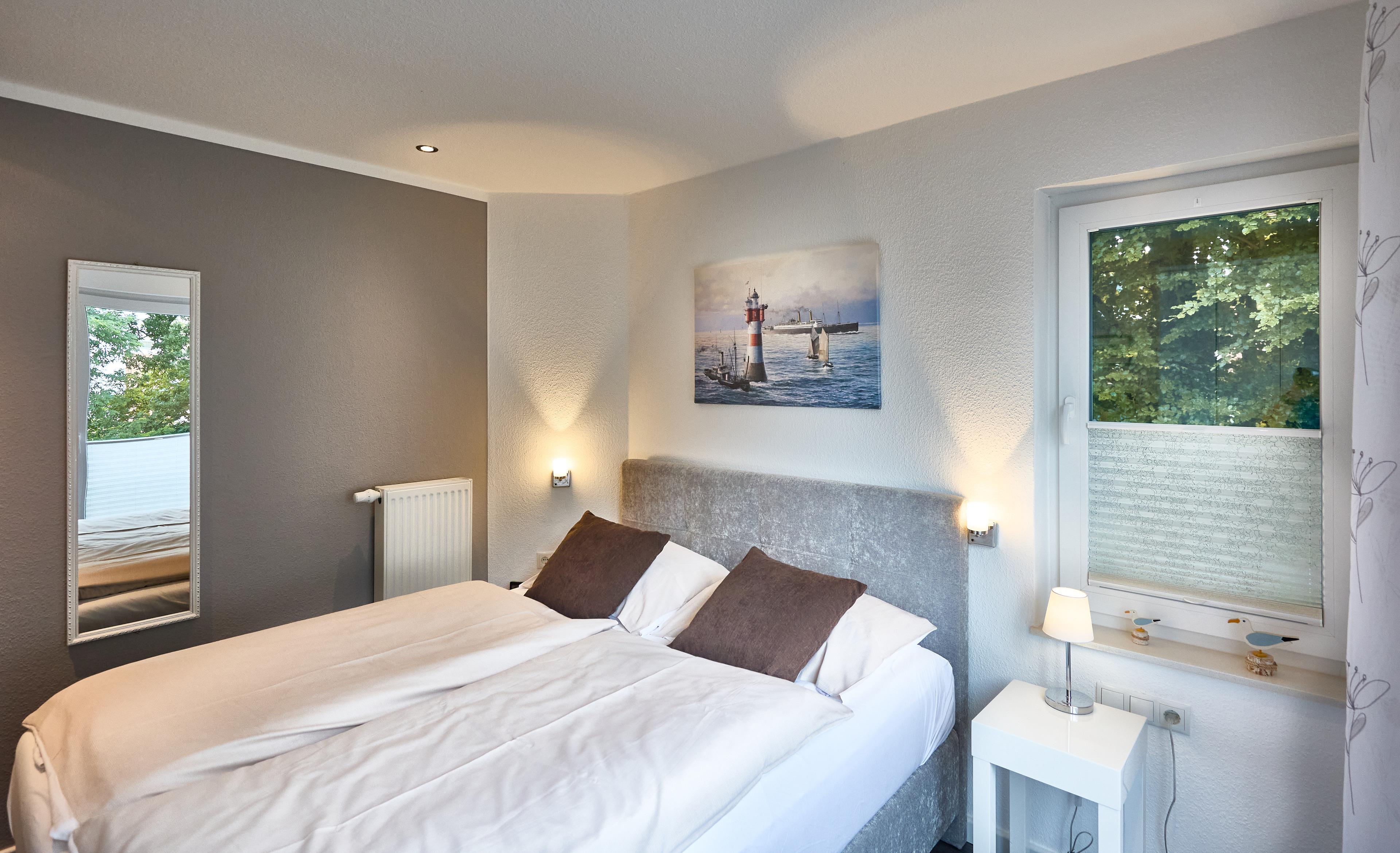 Die Einrichtung der Wohnung ist ansprechend und geschmackvoll gestaltet. Der Schlafbereich verfügt über komfortable Betten in seniorengerechter Komforthöhe sowie einen zusätzlichen Fernseher. Das angrenzende Duschbad mit WC bietet Ihnen Komfort und einen schönen Ausblick ins Grüne. Von hier aus können Sie sogar einen kleinen Blick auf das Meer erhaschen.