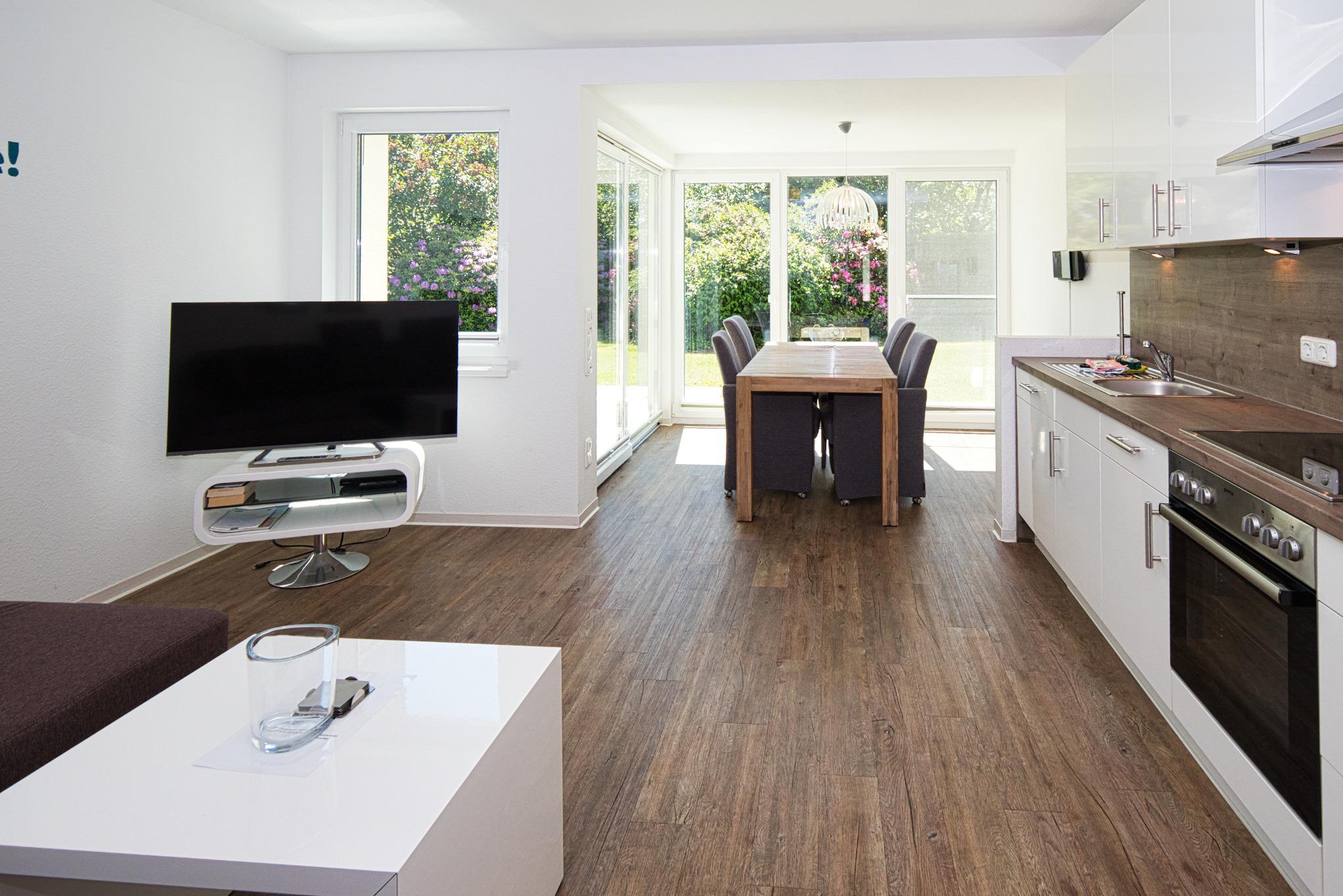 Diese geschmackvolle, moderne und barrierefreie Erdgeschoss-Ferienwohnung verspricht einen unvergesslichen Aufenthalt. Genießen Sie sonnige Stunden auf der Süd-Terrasse mit einem herrlichen Gartenanteil. Der großzügige Wohn-/ Ess- und Küchenbereich ist optimal gestaltet und bietet Platz für bis zu 4 Personen. Eine großflächige Glasfront am Essplatz schafft eine einladende Wintergartenatmosphäre. Für die dritte und vierte Person steht eine komfortable Schlafcouch zur Verfügung.