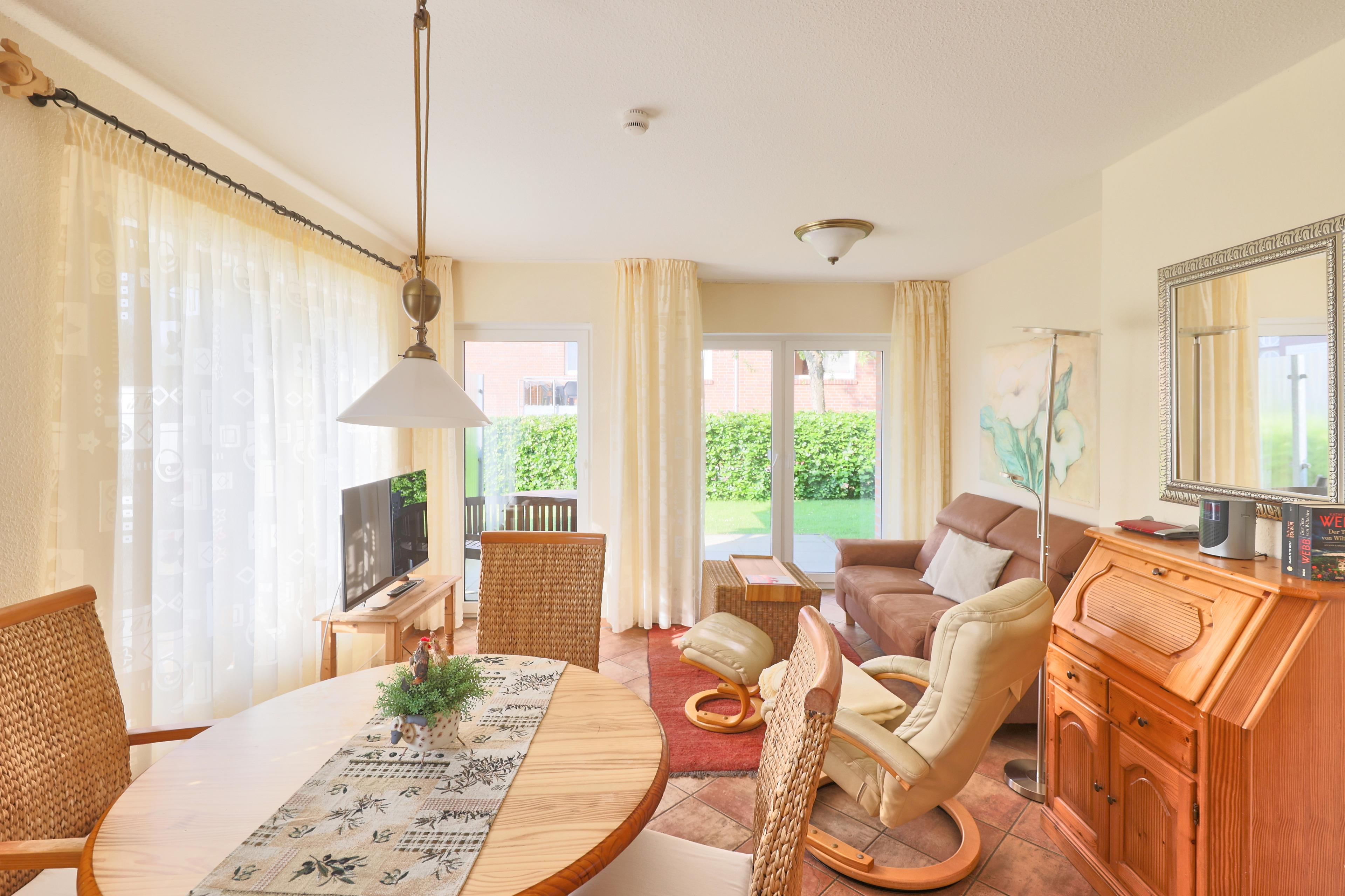 Aquaris, Whg. 1, 2-Raum, ca. 43m², EG, bis zu 2 Personen, sehr stilvoll und gehbehindertengerecht. Sie ist mit einem gemütlich ausgestatteten Schlafzimmer mit großem Kleiderschrank, einem Duschbad (Dusche/WC) mit Fußbodenheizung, sowie dem gemütlichen Wohn- und Essbereich mit Terrasse und einer aufgeteilt. Der Wohnbereich ist mit einer Couch und einem Sessel ausgestattet. Die sehr schöne Einbauküche bietet Komfort und ist komplett eingerichtet. Hier ist Urlaub mehr.