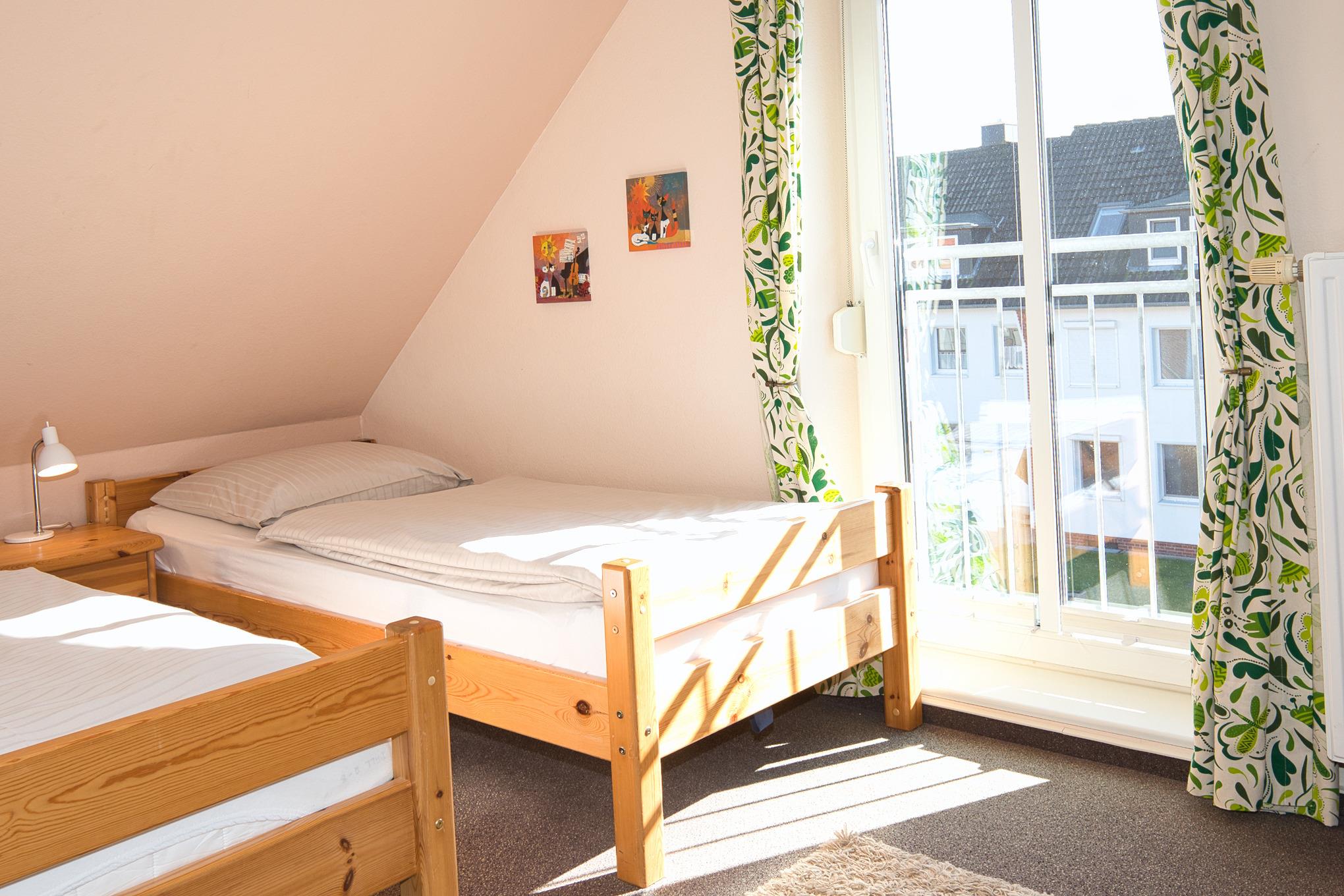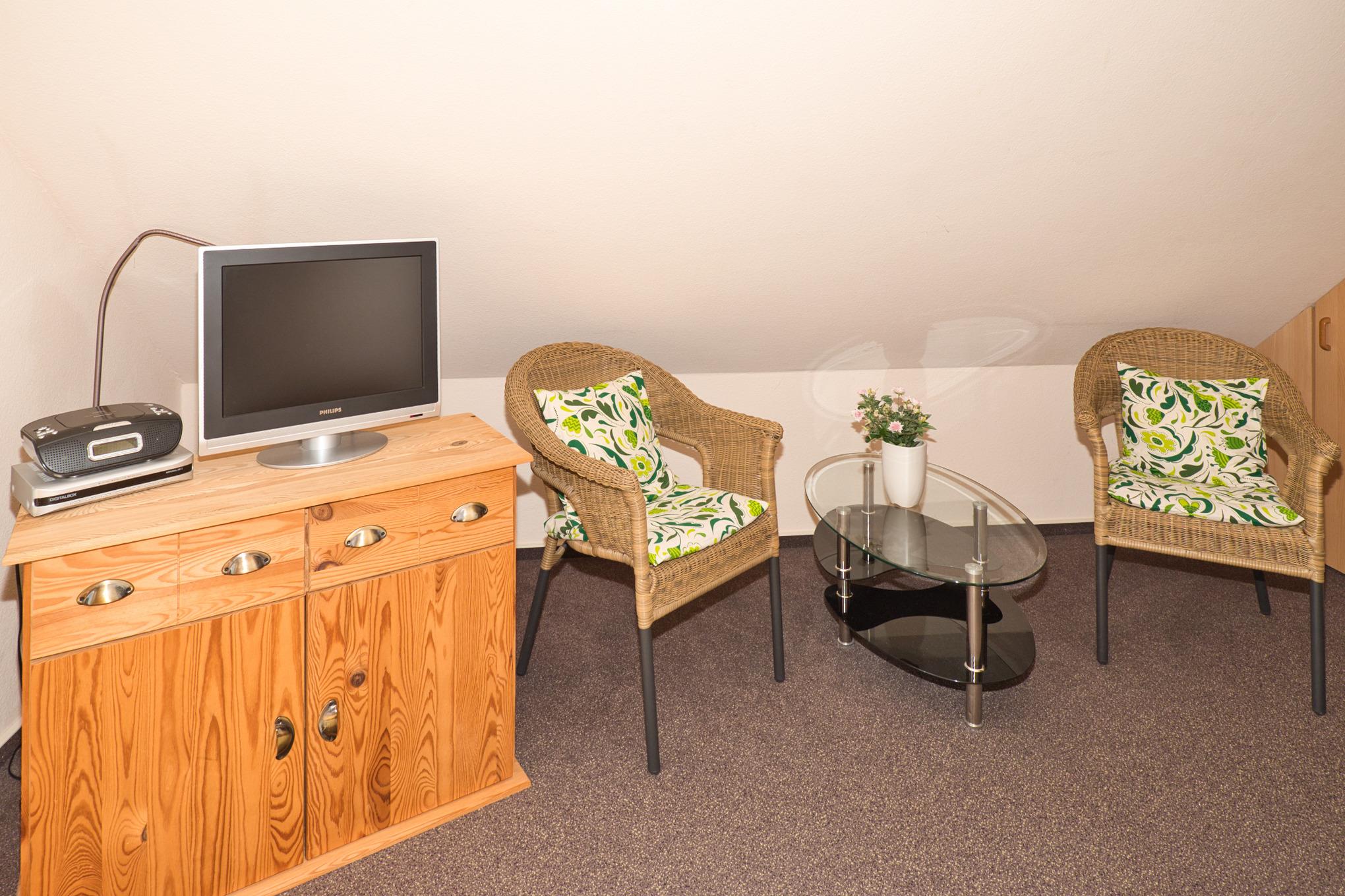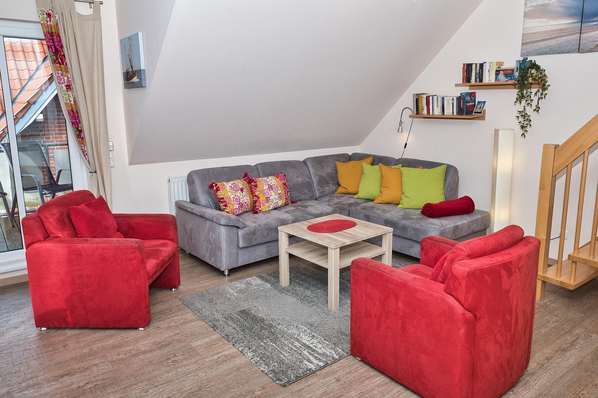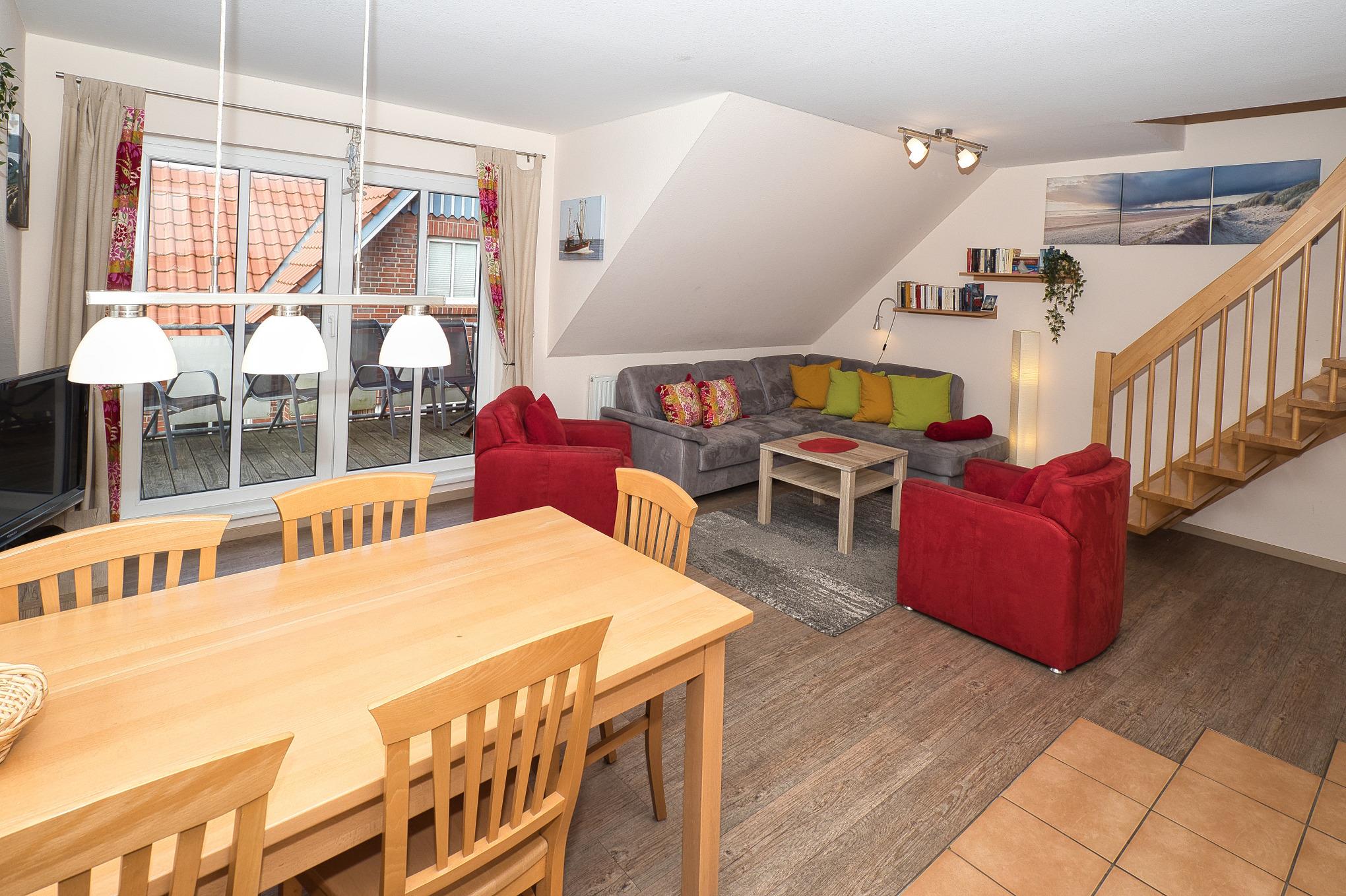 Sehr gemütliche und helle Ferienwohnung über 2 Etagen für bis zu 4 Personen. Im 1. OG kommen Sie über den Flur direkt in den hellen Wohn- und Essbereich mit einer komplett eingerichteten Einbauküche (mit zusätzlicher Kaffeepadmaschine) und dem Zugang zum Balkon (Süd-West). Vom Flur aus kommen Sie in das große Duschbad mit Waschmaschine und zur anderen Seite ins Schlafzimmer mit Doppelbett und einem großen Kleiderschrank. Der gesamte Wohnbereich ist ohne Teppich ausgelegt!. Vom Wohnbereich geht eine sehr schön integrierte Holztreppe ins Dachgeschoss. Hier befindet sich ein kleineres Schlafzimmer mit 2 Einzelbetten mit Radiowecker mit CD-Spieler und 2 Sitzmöglichkeiten mit einem Tisch zum abendlichen verweilen. Ein 2. Fernseher ist hier vorhanden. Ebenfalls befindet sich auf dieser Etage ein optimal aufgeteiltes Duschbad mit WC. Ein Haarfön befindet sich in beiden Bädern. Wir wünschen Ihnen einen schönen Urlaub...
