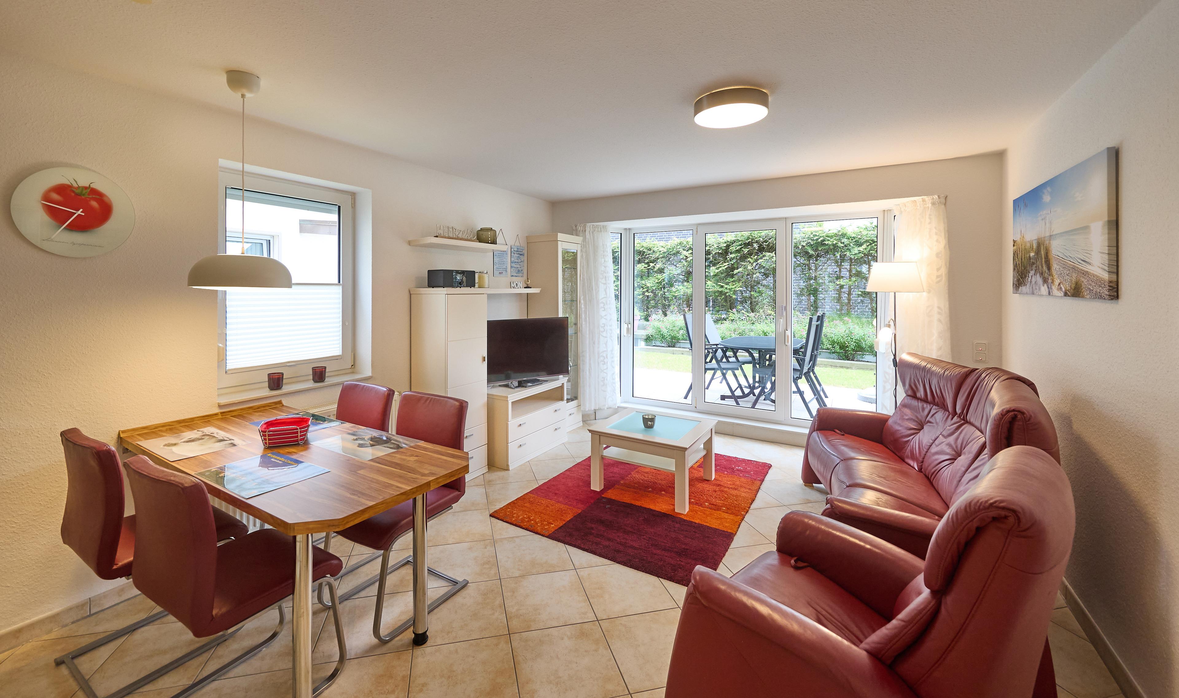 Der helle Wohn-, Ess- und Küchenbereich bildet das Herzstück der Wohnung. Gemütliche Sitzmöglichkeiten, viel Licht und ein direkter Zugang zur überdachten Westterrasse sorgen für eine angenehme und einladende Atmosphäre. Hier können Sie den Nachmittag ausklingen lassen oder den Abend in frischer Nordseeluft verbringen.